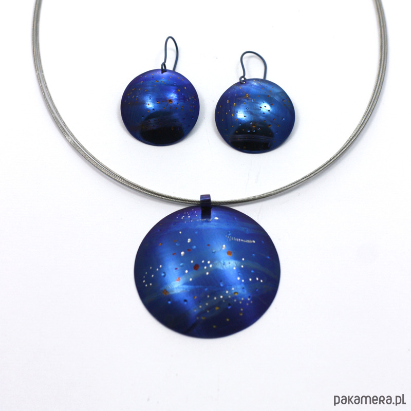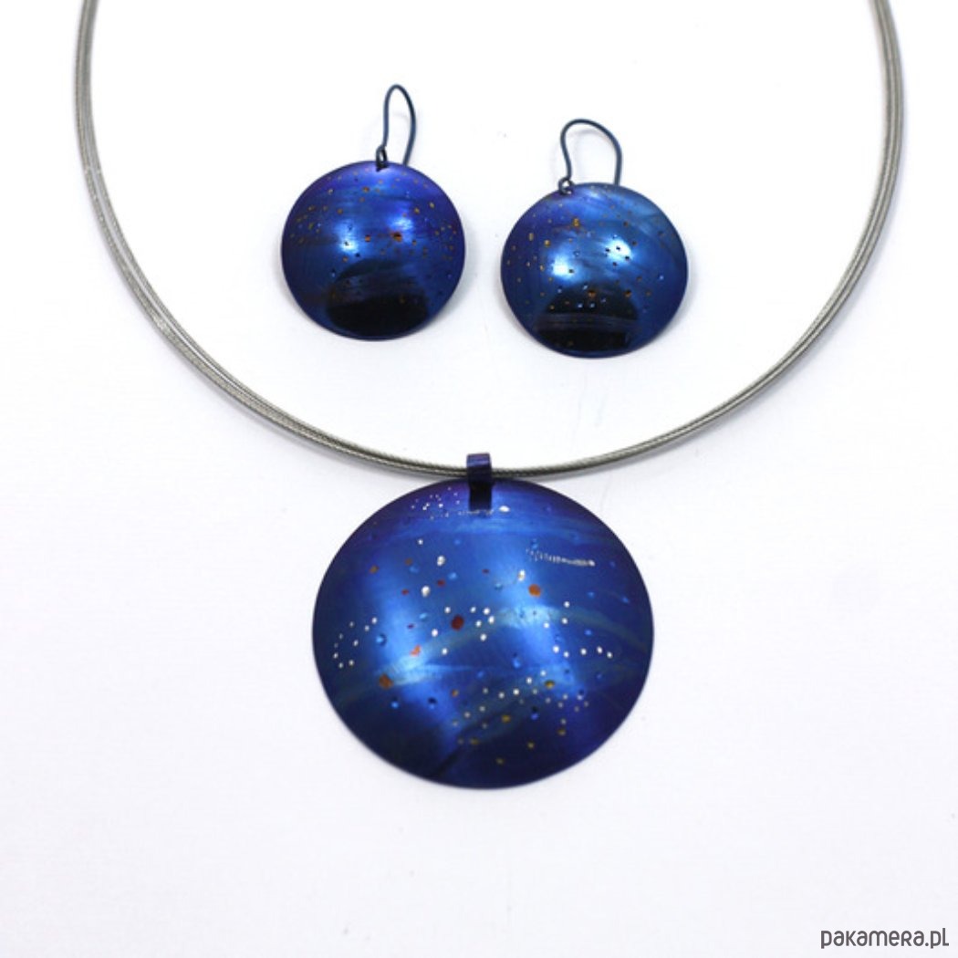 Komplet złożony z kolczyków i zawieszki zrobiłem w całości ręcznie z tytanu. Kolczyki są długości 4,5 cm (3 cm) razem z tytanową zawieszką-biglem. Zawieszka średnicy 5 cm zawieszona jest na kolii zrobionej ze stalowych ,jubilerskich linek i zakończona zapięciem ze srebra.