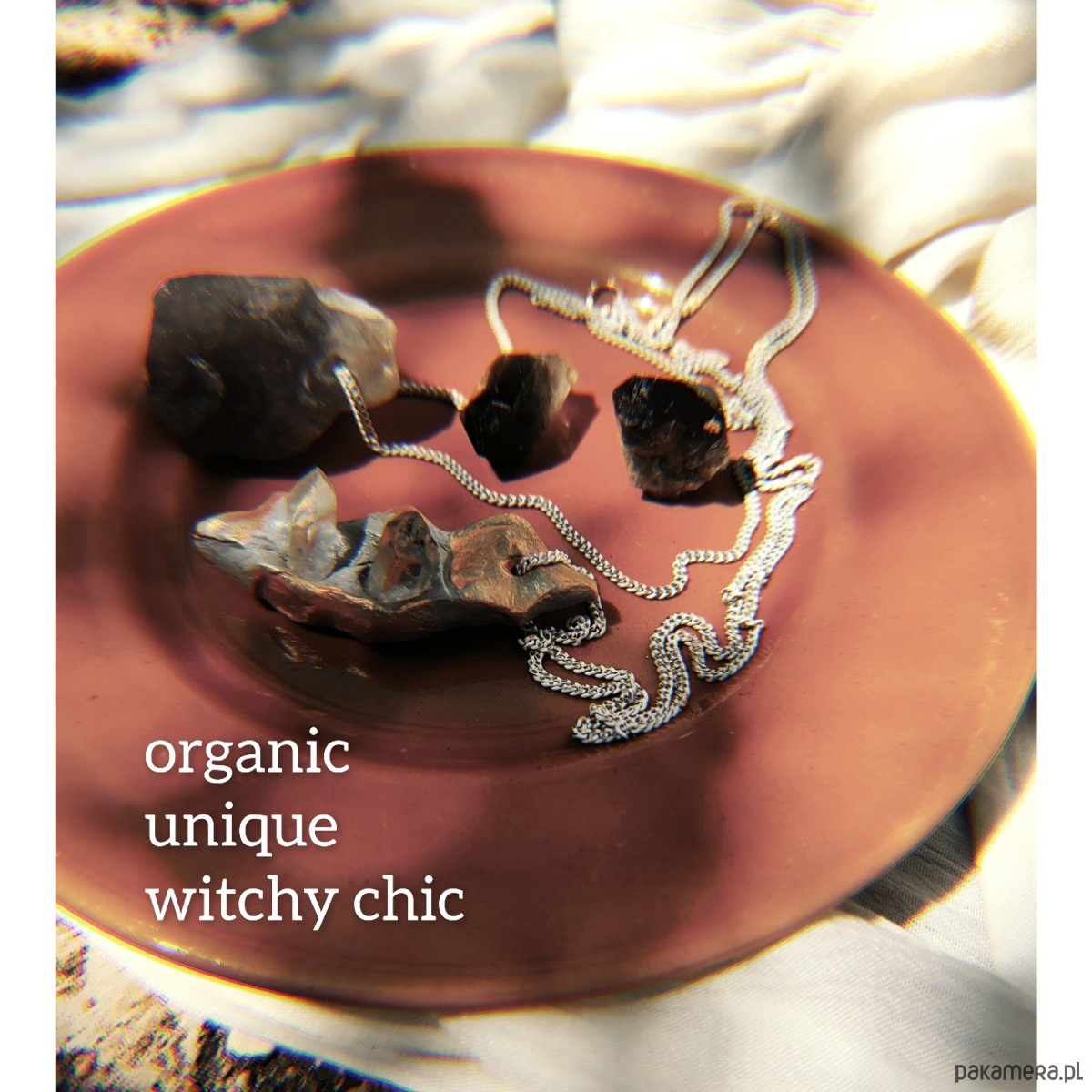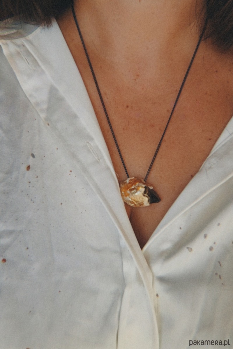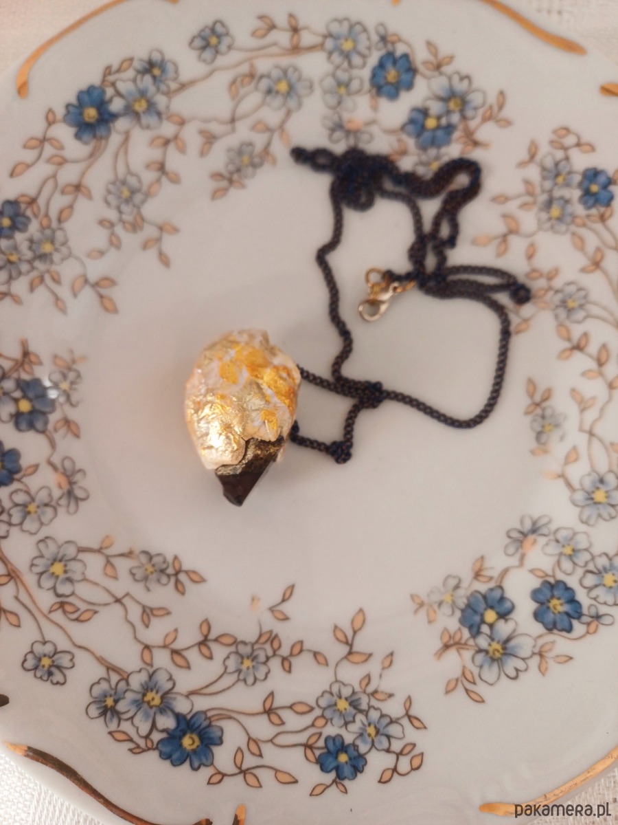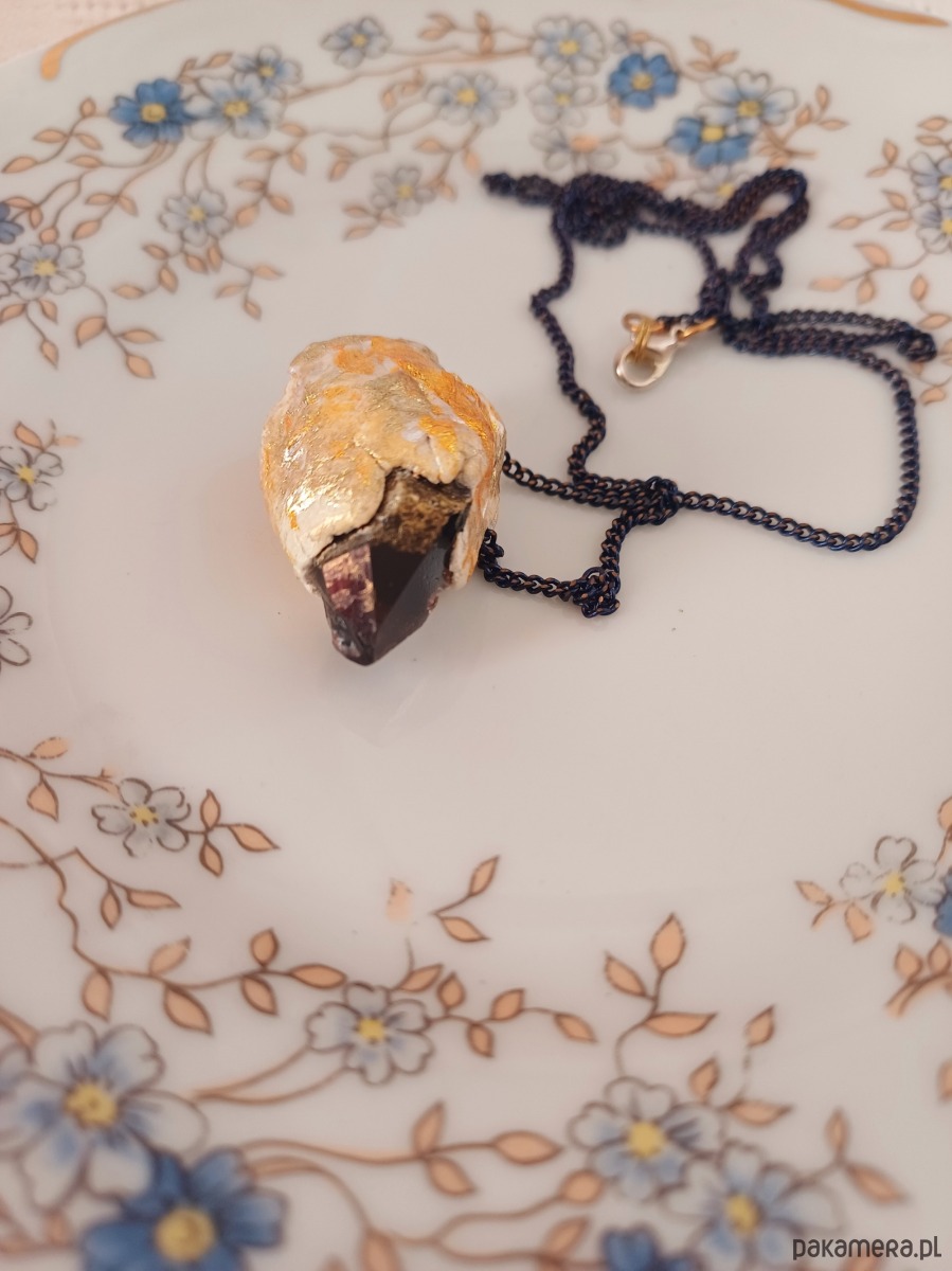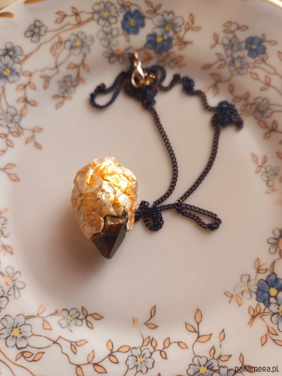 Piękna bryłka kwarcu dymnego, muśnięta ekologiczną lśniąca farbą, zatopiona w glinie, w towarzystwie łańcuszka, to błysk oraz #goodvibesonly i dyskretny urok dla współczesnej Wiedźmy.