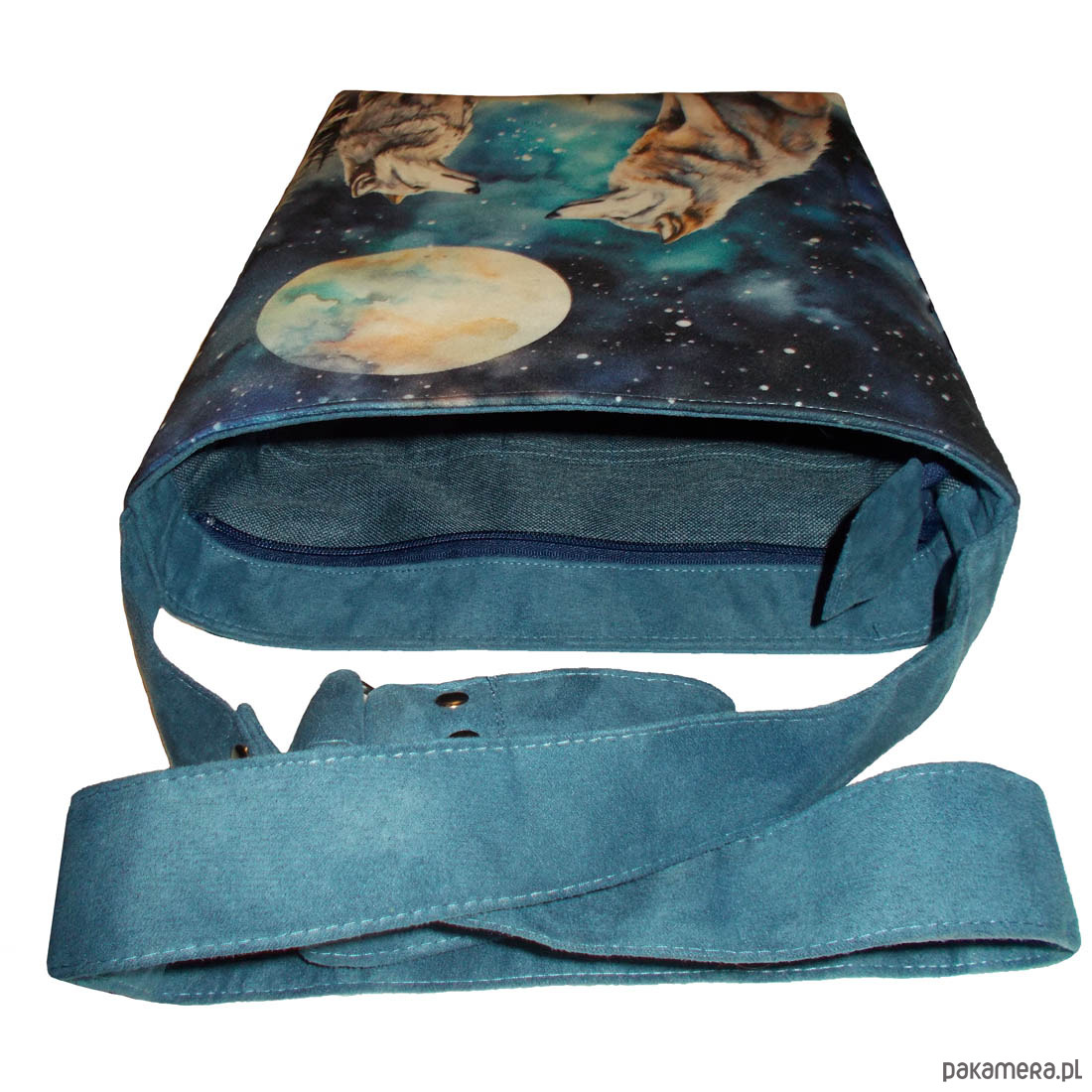 Autorska torba z usztywnionego eko zamszu, zapinana na zamek. Przód z weluru tapicerskiego. Pasek regulowany. Tył w korze paska (niebieski) Torba trzyma fason. Wewnątrz dwie kieszenie - jedna na zamek, druga z miejscem na telefon i coś jeszcze. W szwach wypustka. Denko poszerzone. szerokość 32cm wysokość 30cm plus denko 8cm