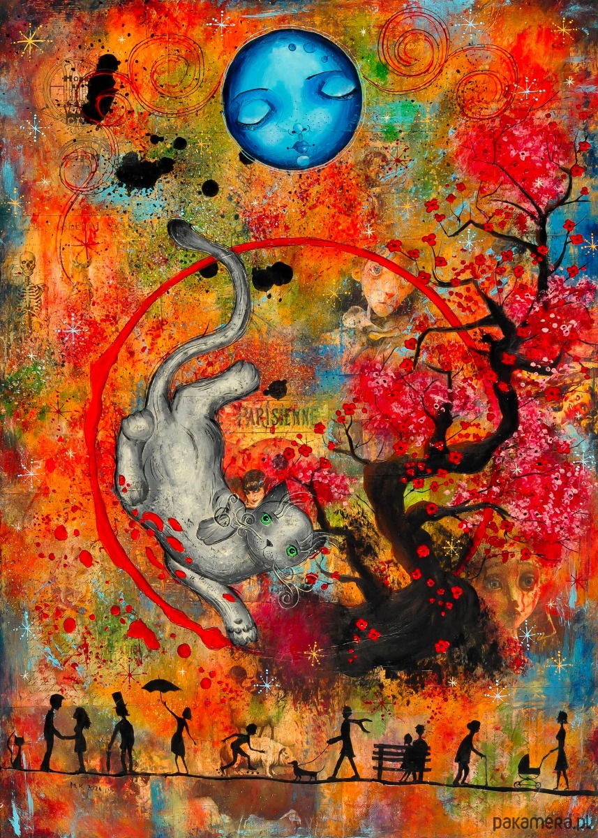 "Nocny spacer 1", akryle i kolaż na płótnie