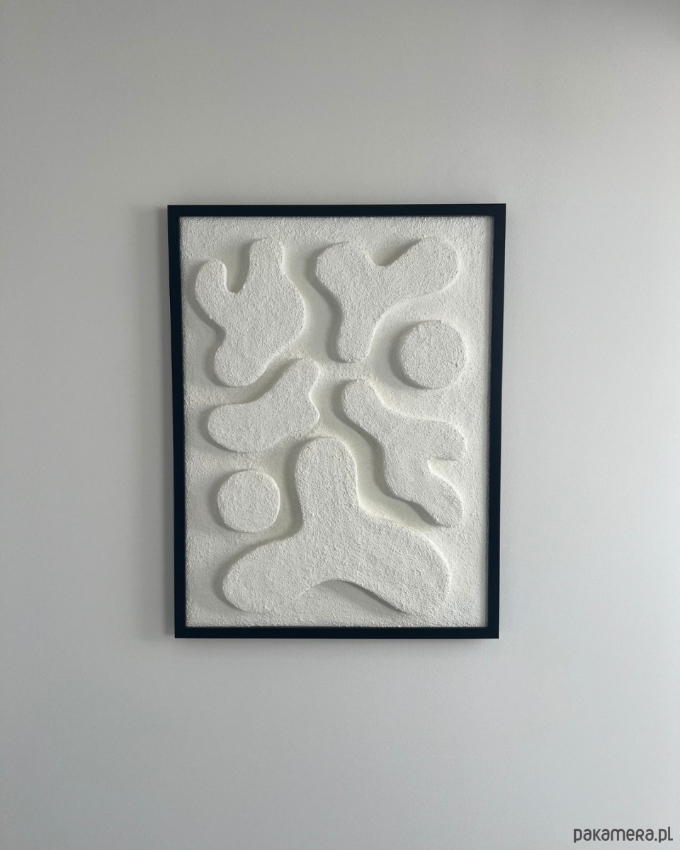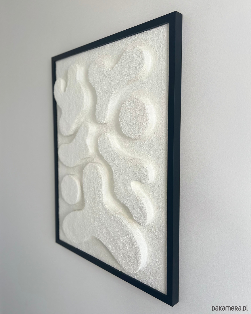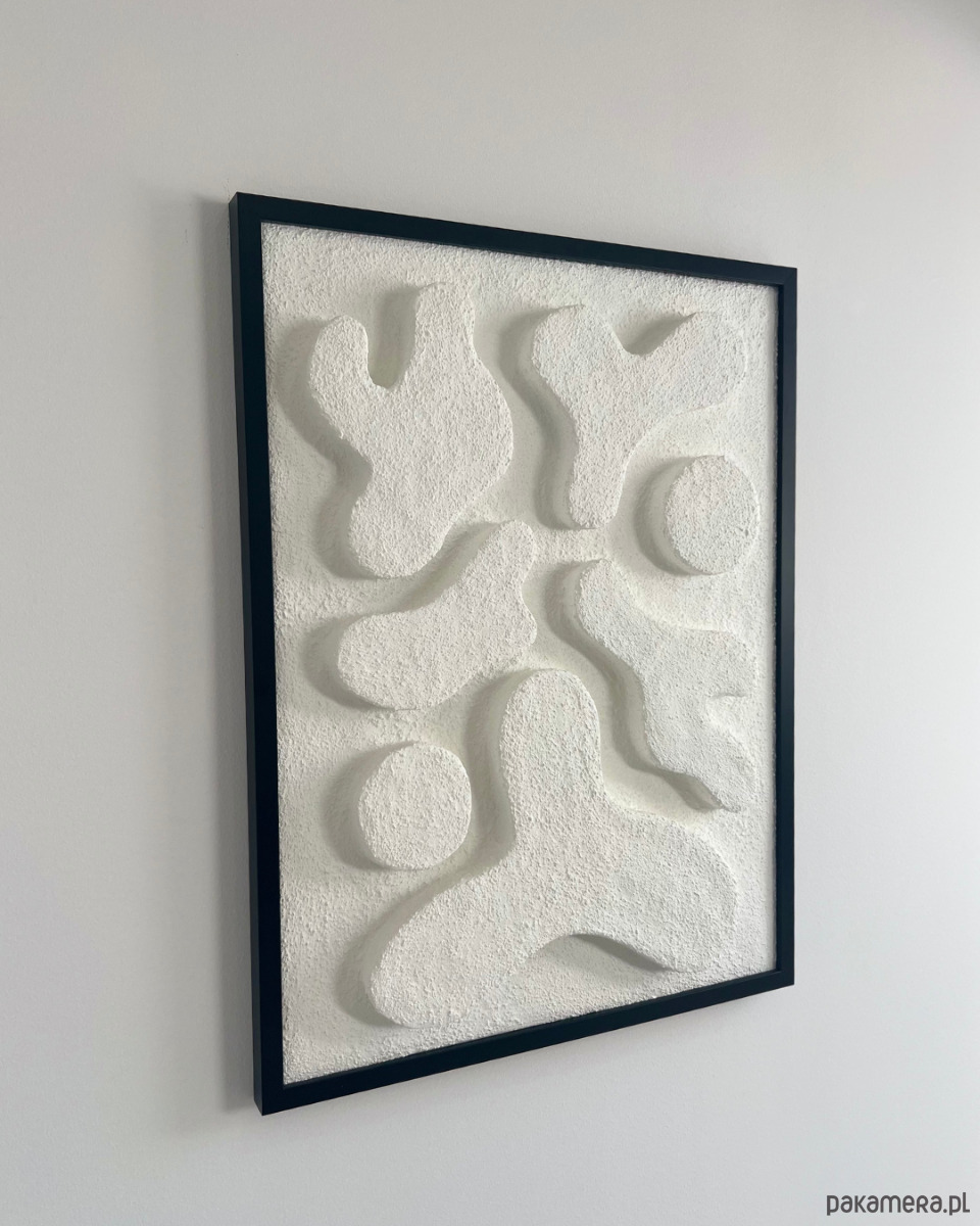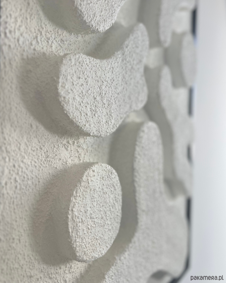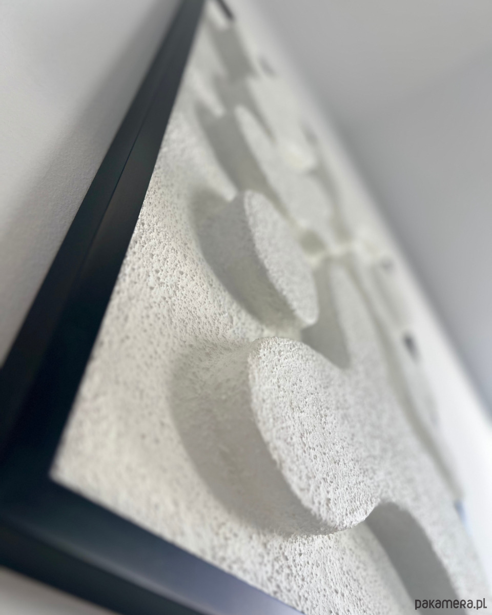 Statyczna eksplozja form, tekstur i głębi. Nasze unikatowe, ręcznie wykonane rzeźby ścienne zmieniają się w zależności od punktu widzenia obserwatora. Niektóre detale wydają się być ukryte, a po chwili stają się wyraźne i dominujące. Autorska mieszanka gipsu została wykorzystana w sposób, który doskonale imituje charakterystyczną strukturę tkaniny boucle. Delikatne “pętelki” i nierówności sprawiają, że rzeźba nabiera życia, tworząc efekt głębi i trójwymiarowości, jest pełna dynamizmu, choć w rzeczywistości pozostaje nieruchoma. Kolorystyka jest stonowana i naturalna, pasująca idealnie do estetyki wabi-sabi. Subtelne odcienie bieli podkreślają spokojny charakter rzeźby, wprowadzając do przestrzeni nutę elegancji i harmonii.