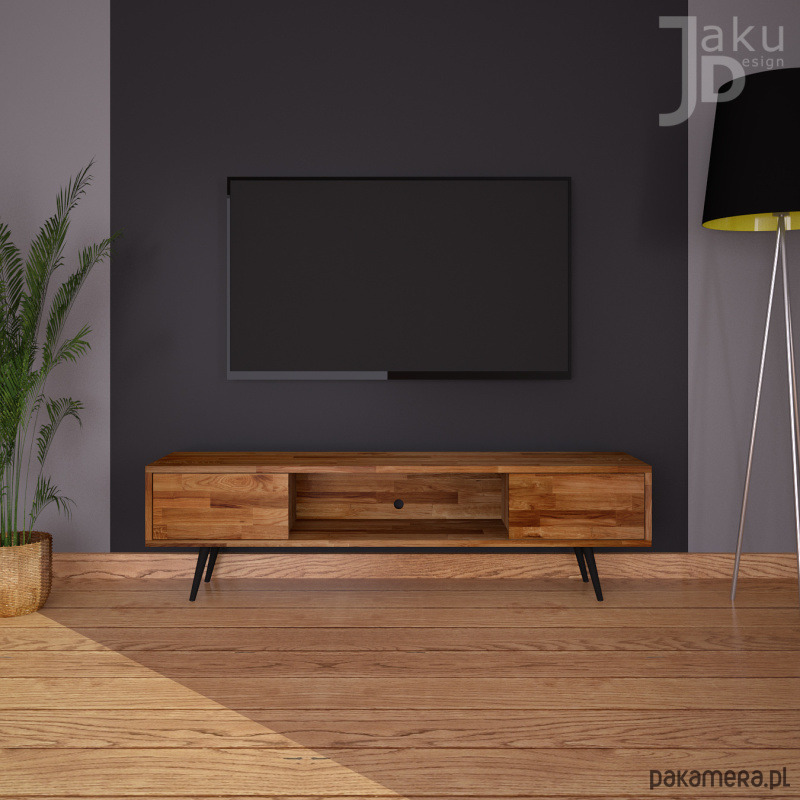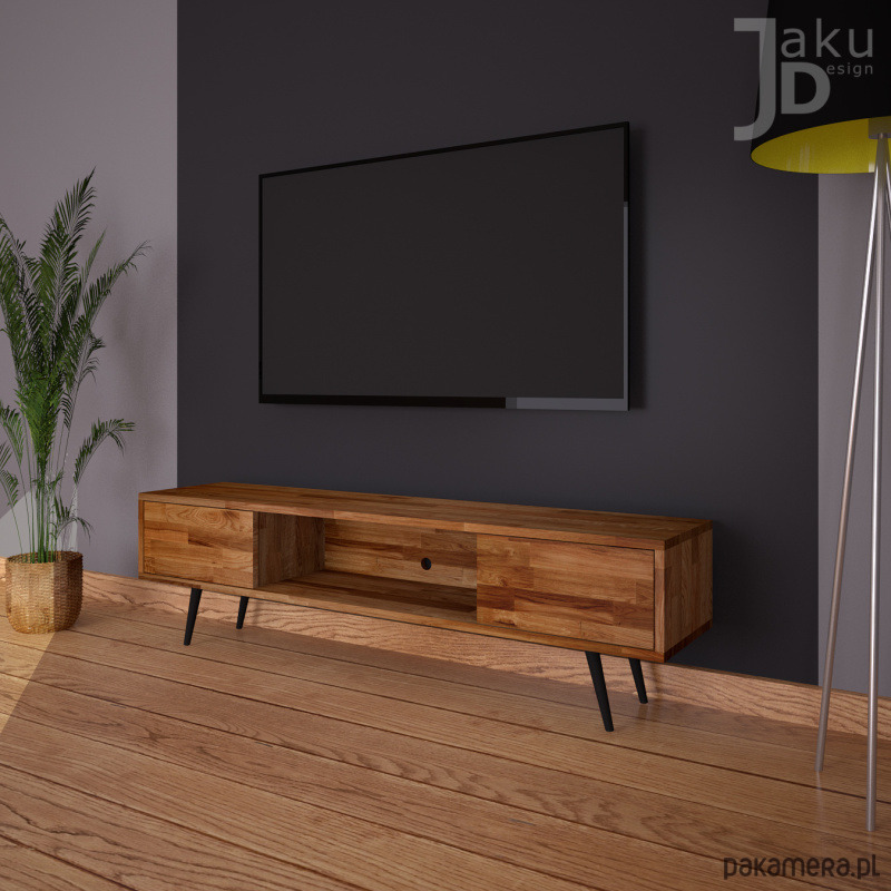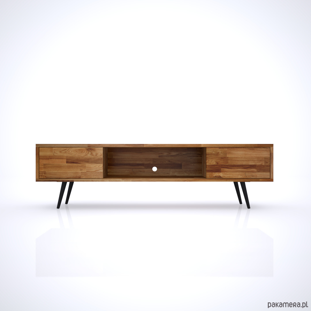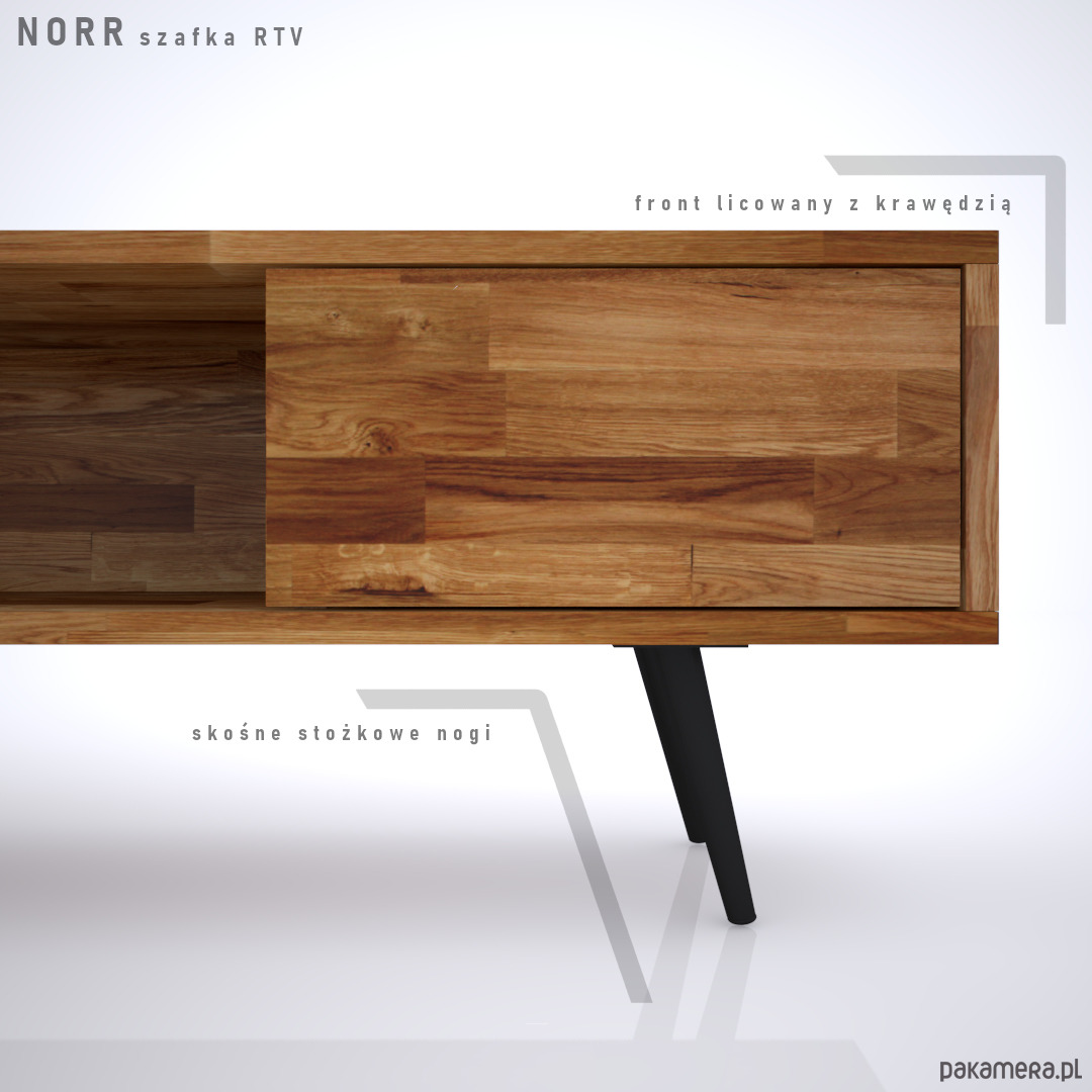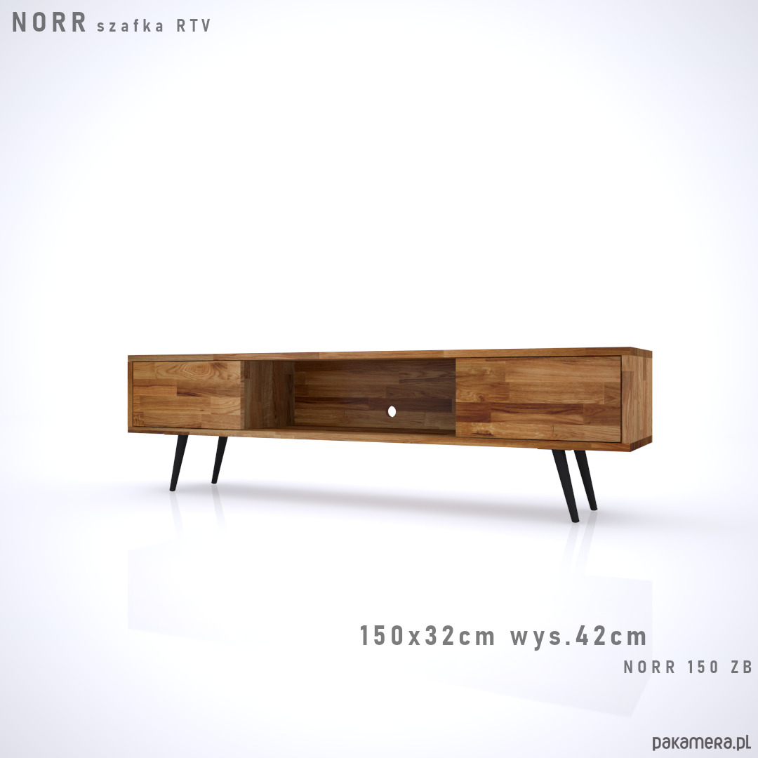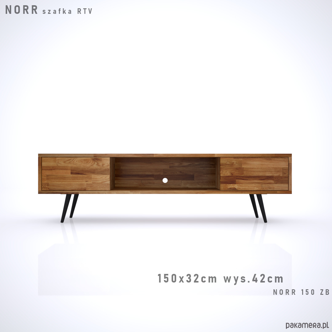 NORR to szafka RTV wykonana z drewna dębowego na smukłych stożkowych nogach. Mebel w stylu skandynawskim z dwoma szafkami.