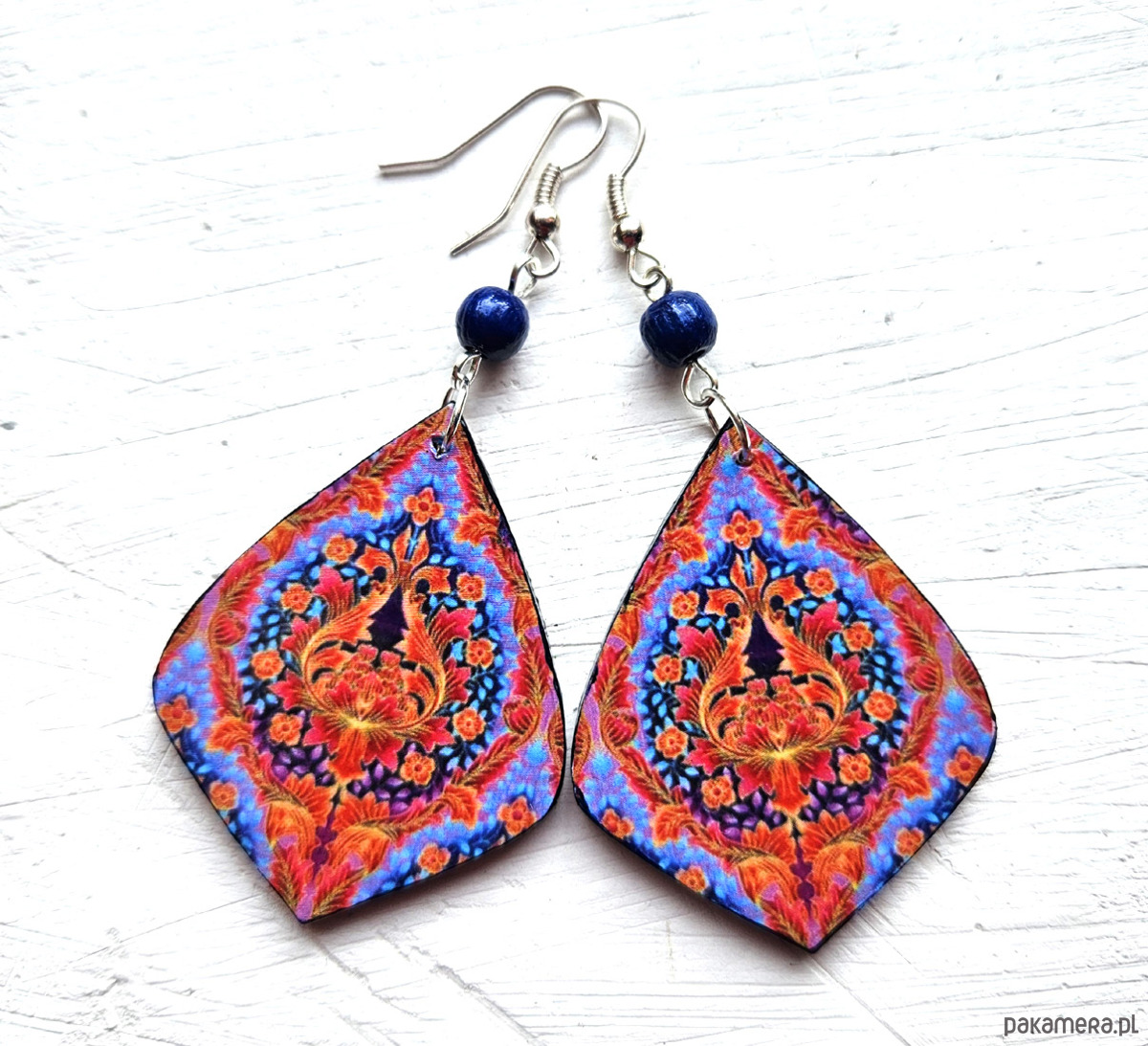 kolczyki drewniane, ozdobione metodą decoupage, dwustronne, starannie wykończone farbami akrylowymi i zabezpieczone wielokrotnie lakierem, bigle posrebrzane, długość kolczyków bez bigli: 6 cm, szerokość: 3,5 cm, bardzo lekkie