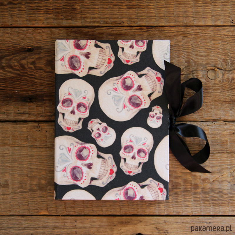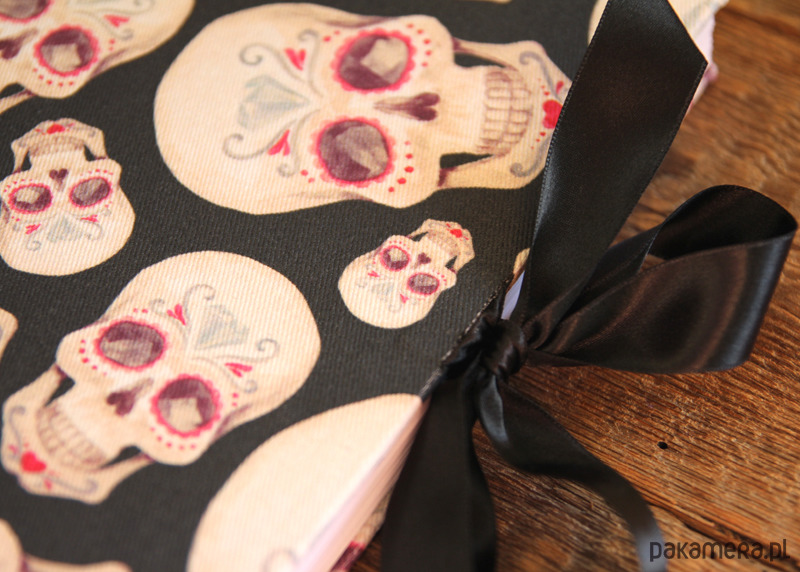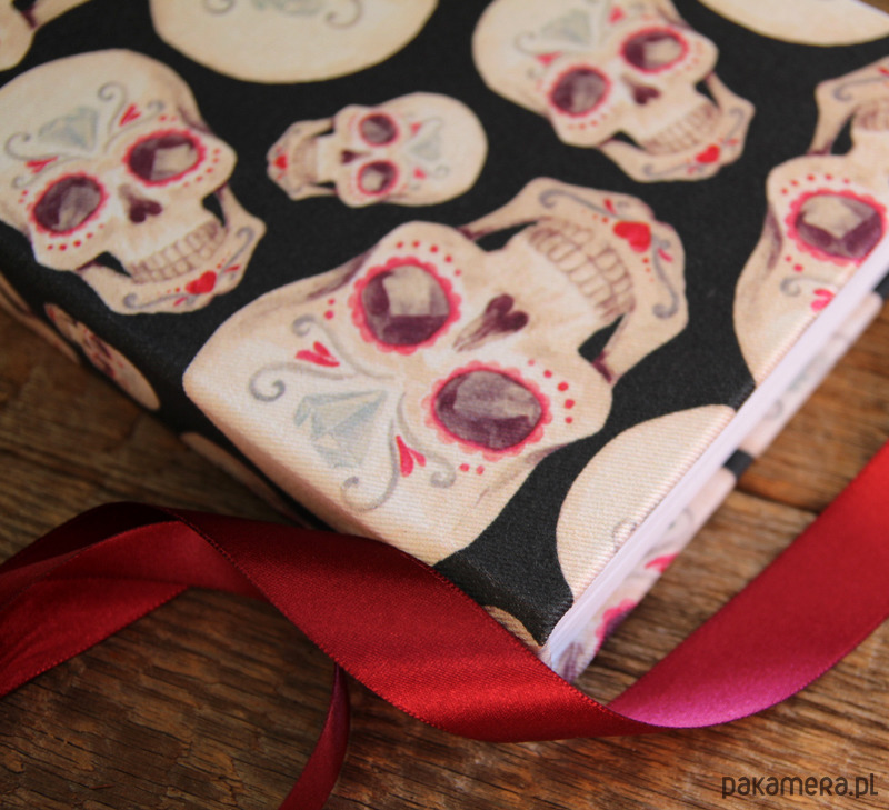 Okładka obita tkaniną w czaszki (układ wzorówna okładce Twojego notesu może się różnić od tego na zdjęciu, każdy notes wykonuję po złożeniu zamówienia z tkaniny o tym wzorze). Do zamknięcia wstążeczki (możliwość zmiany koloru wstążek na dowolny inny kolor z wzornika lub wykonanie notesu bez wstążki).