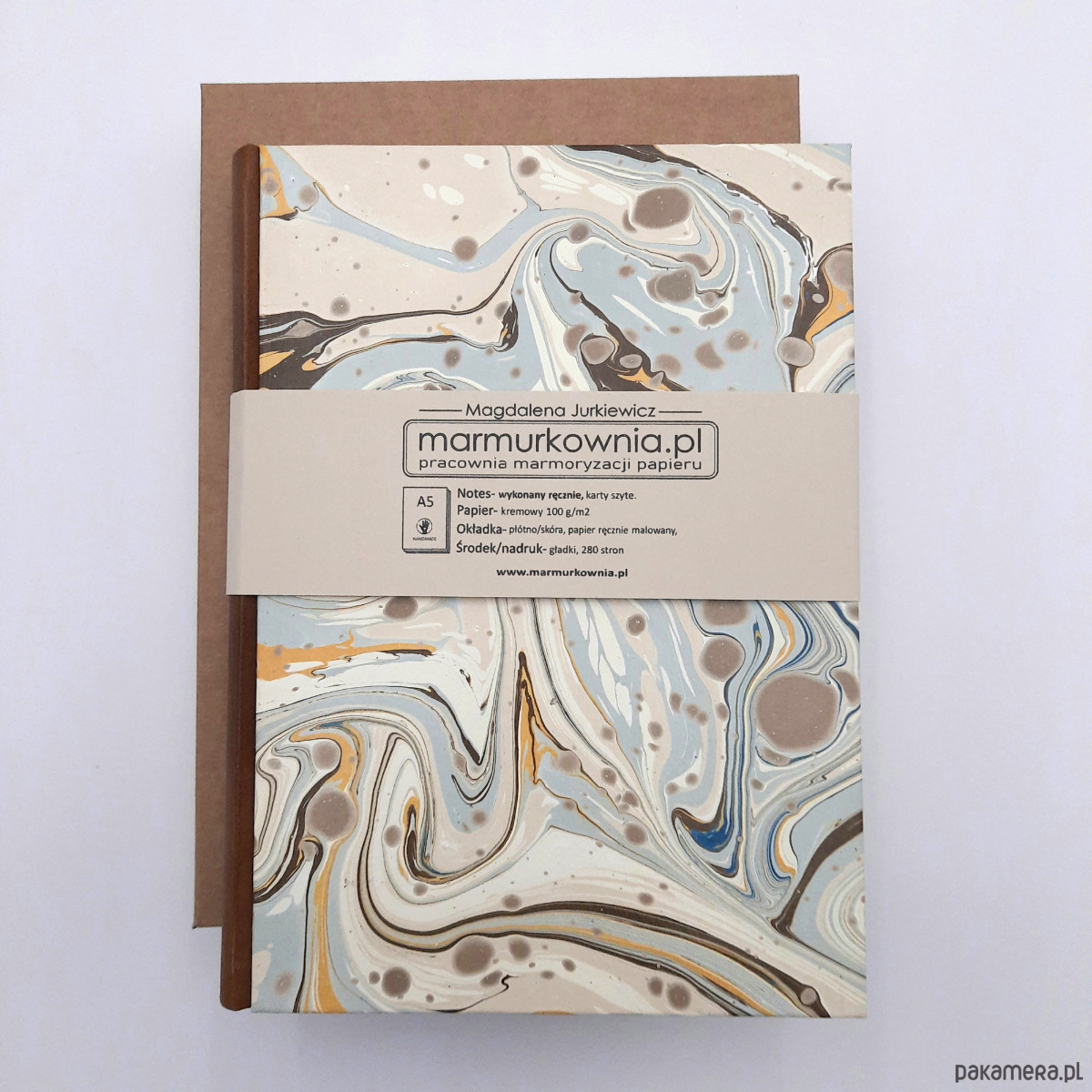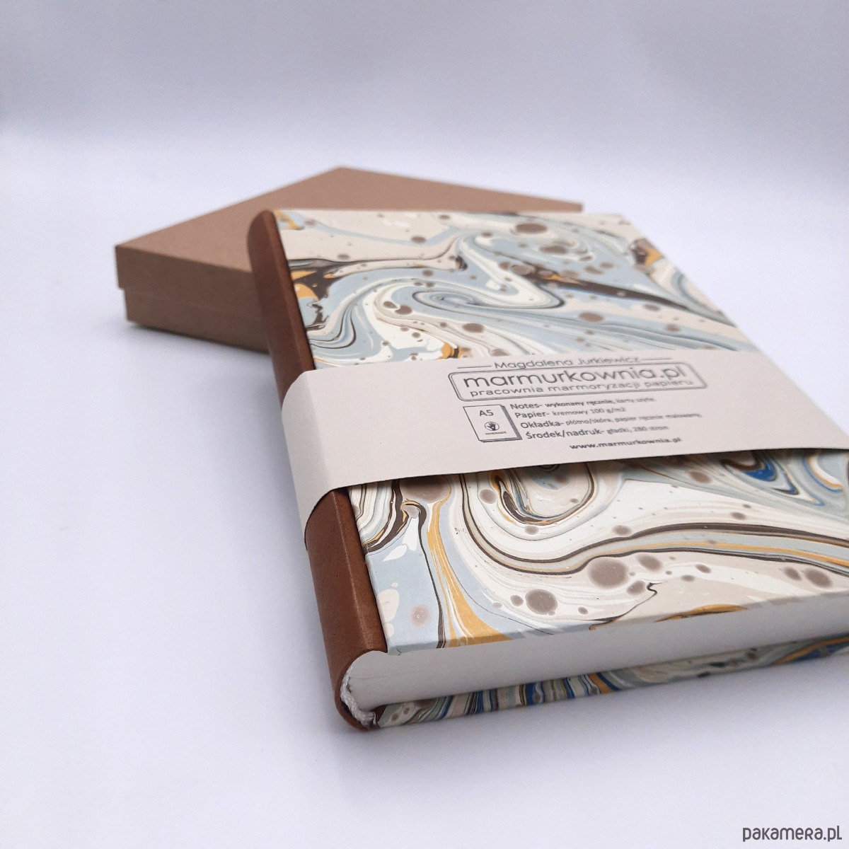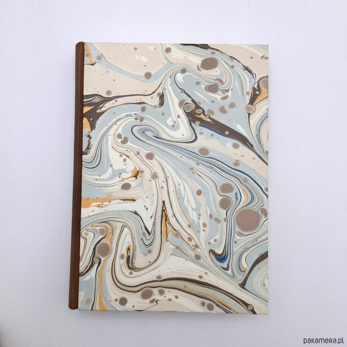 Notes, szkicownik, ręcznie wykonany, w twardej oprawie oklejonej skórą naturalną, oraz papierem barwionym w technice marmoryzacji, który maluję w mojej pracowni.