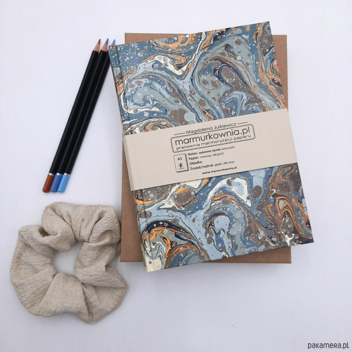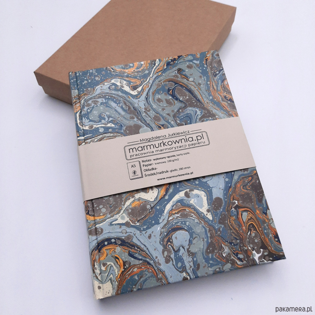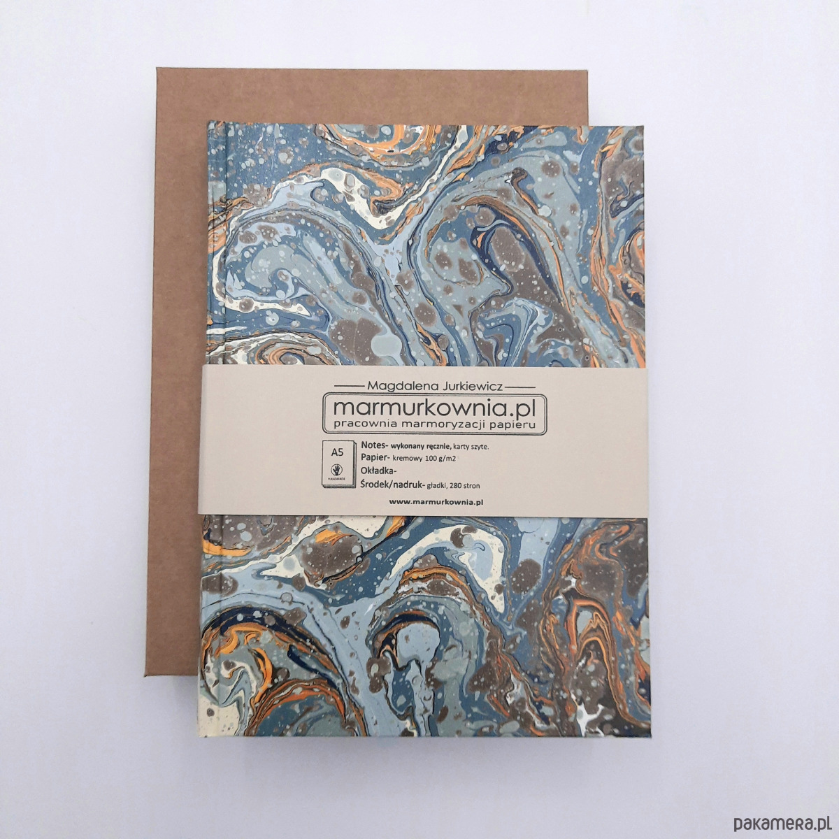 Notes, szkicownik, ręcznie wykonany, w twardej oprawie oklejonej papierem barwionym w technice marmoryzacji, który maluję w mojej pracowni.