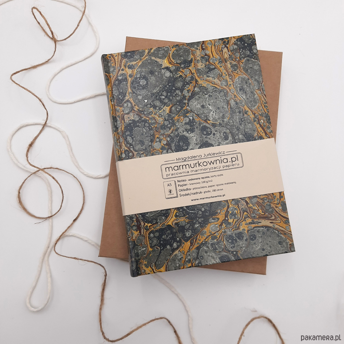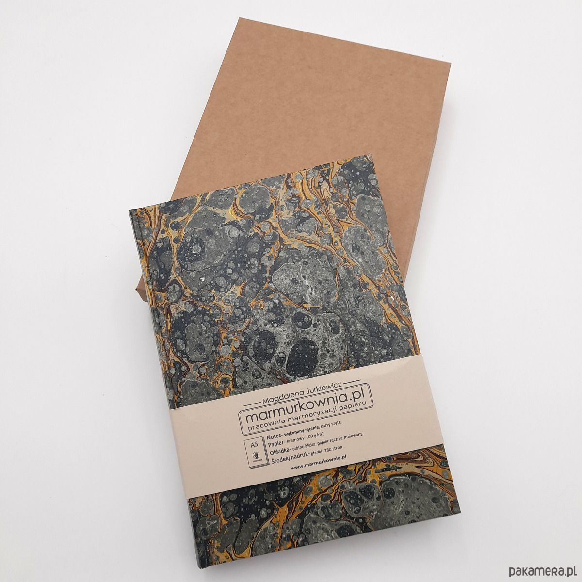 Notes, szkicownik, ręcznie wykonany, w twardej oprawie oklejonej papierem barwionym w technice marmoryzacji, który maluję w mojej pracowni.