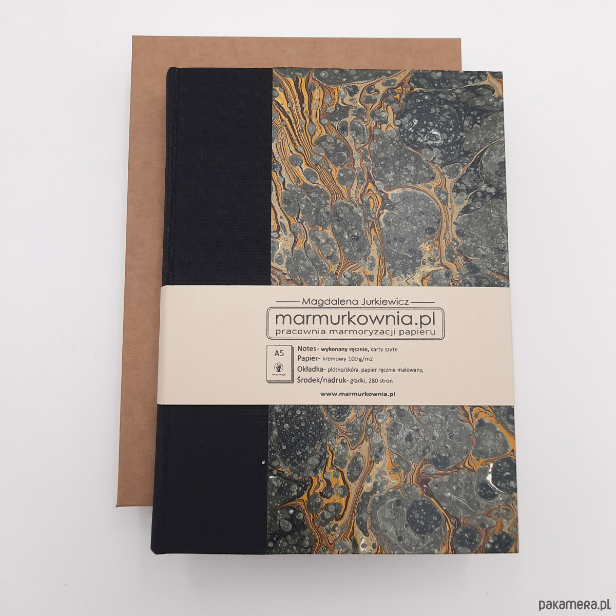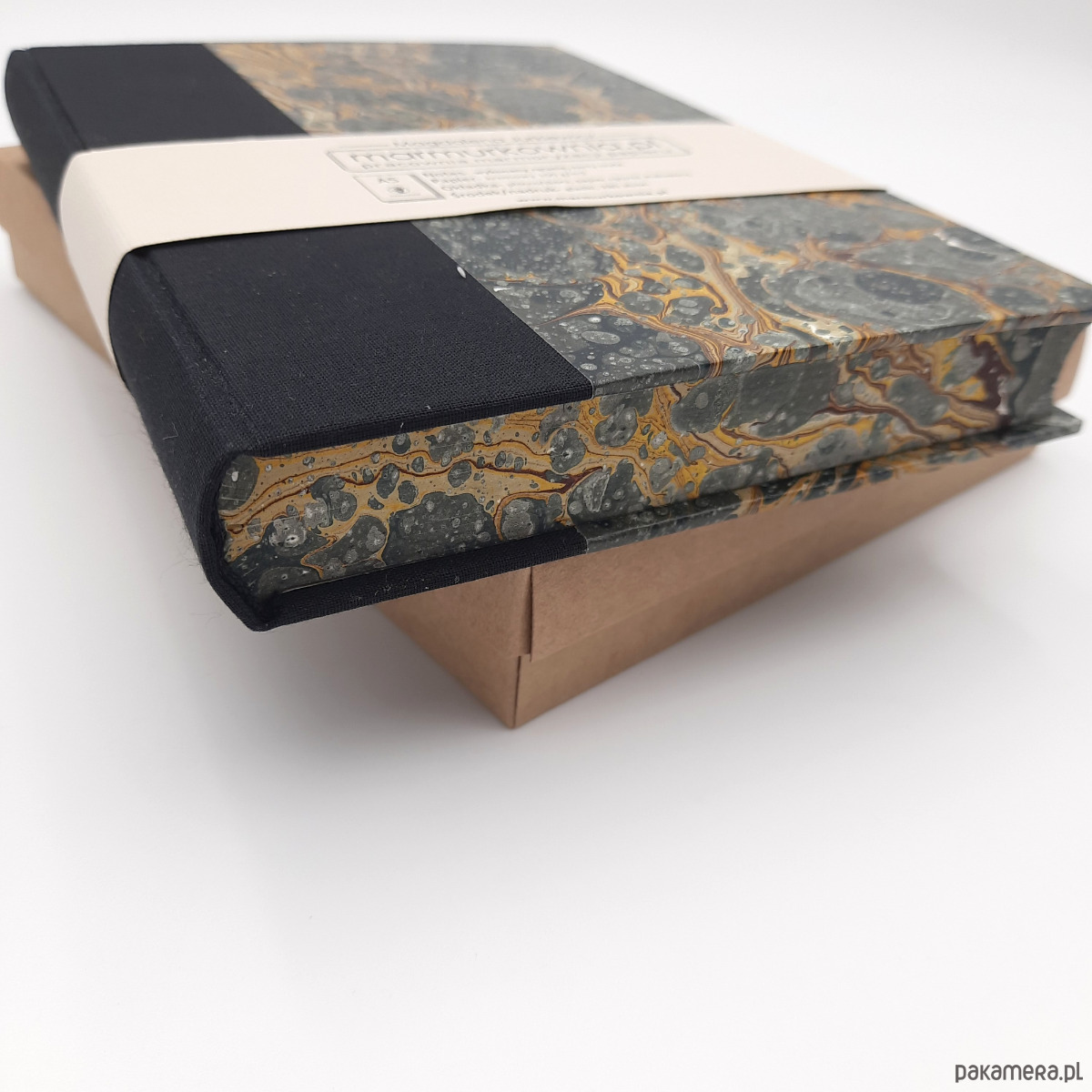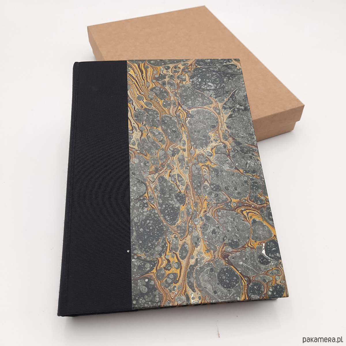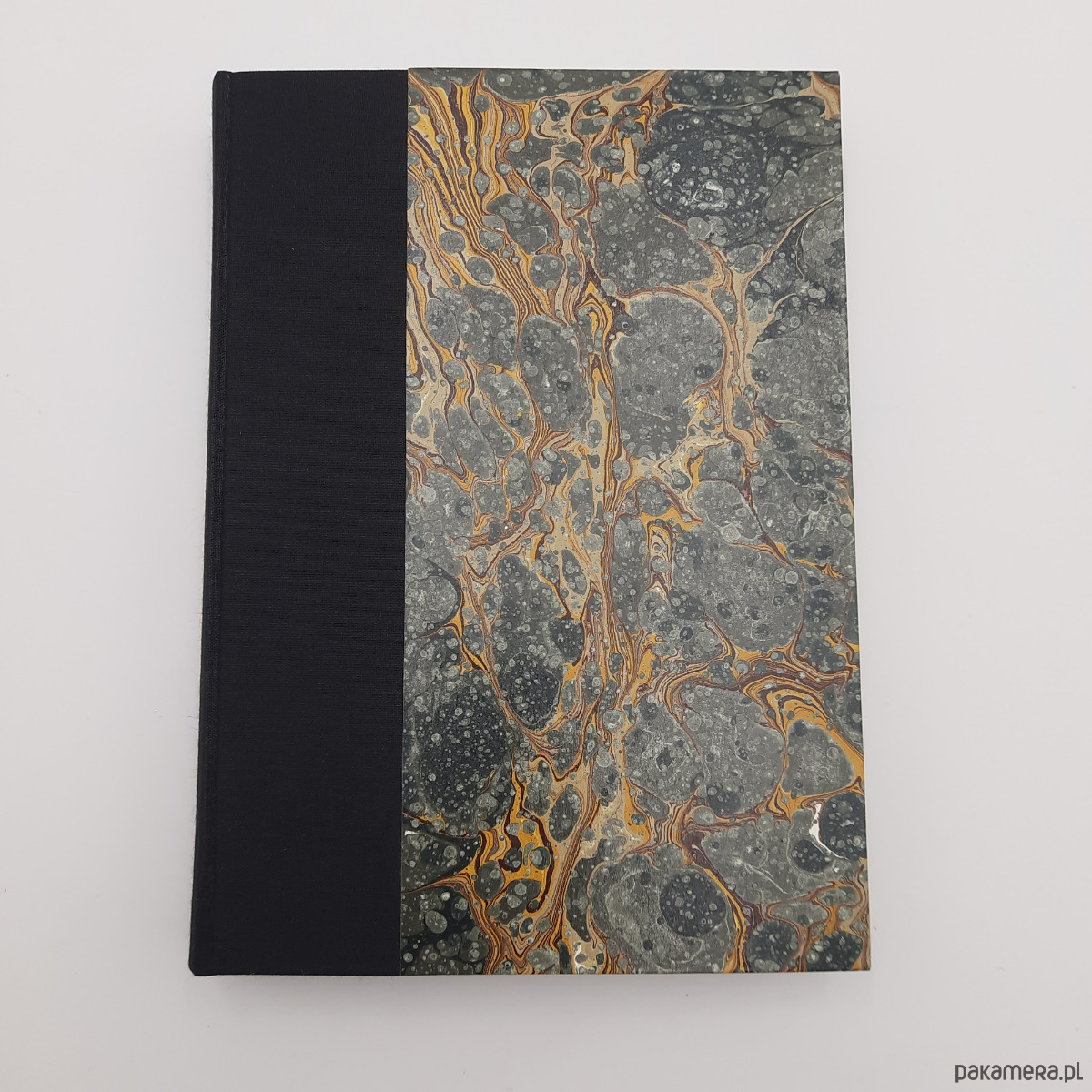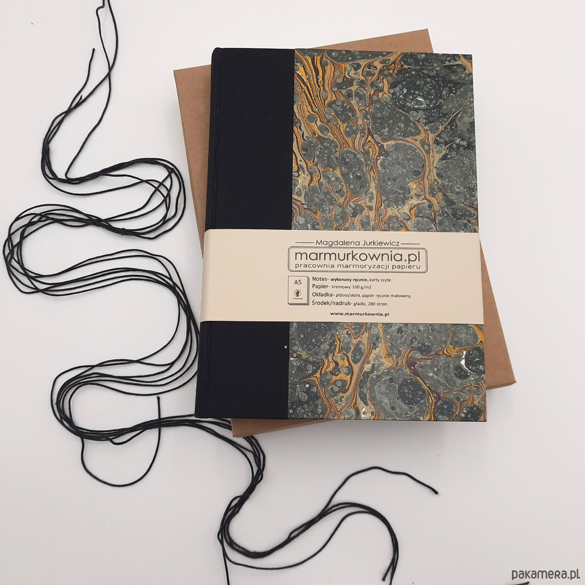 Notes, szkicownik, ręcznie wykonany, w twardej oprawie oklejonej płótnem oraz papierem barwionym w technice marmoryzacji, który maluję w mojej pracowni.