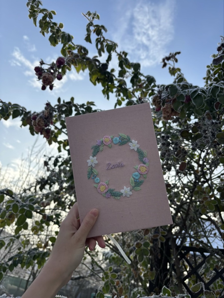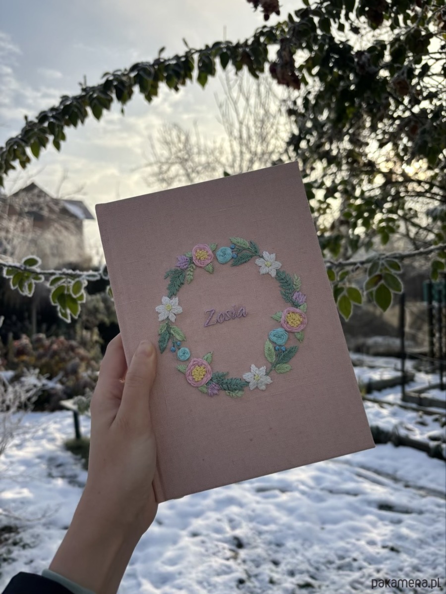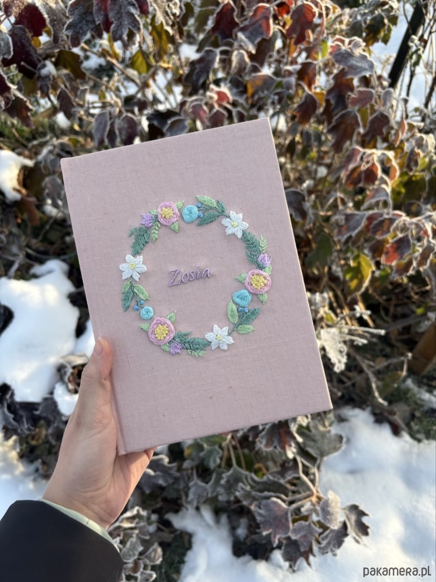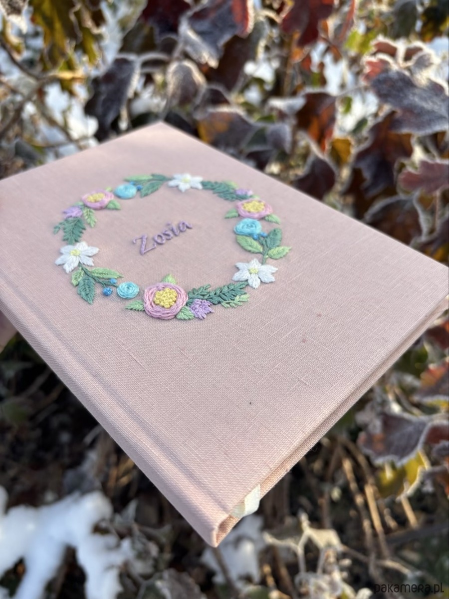 Twarda okładka obłożona tkaniną lnianą z haftem