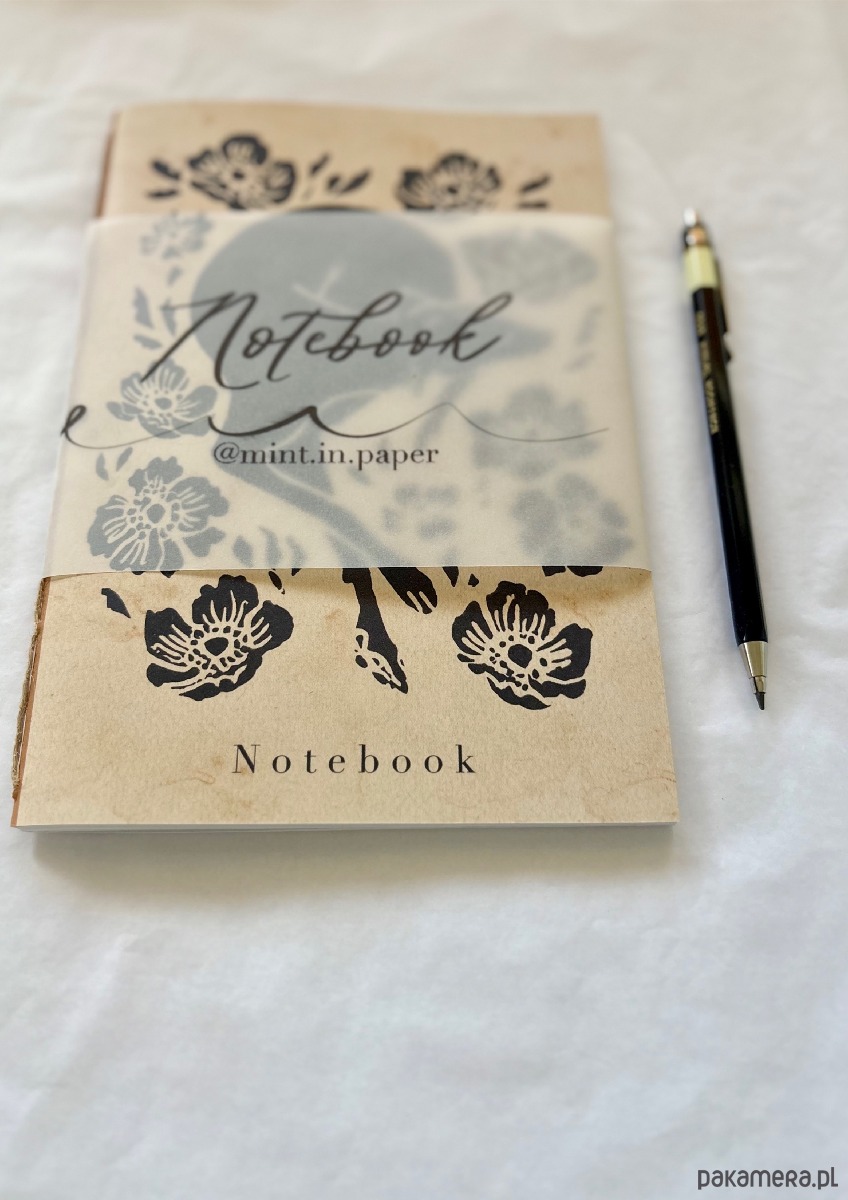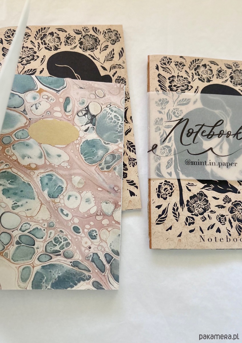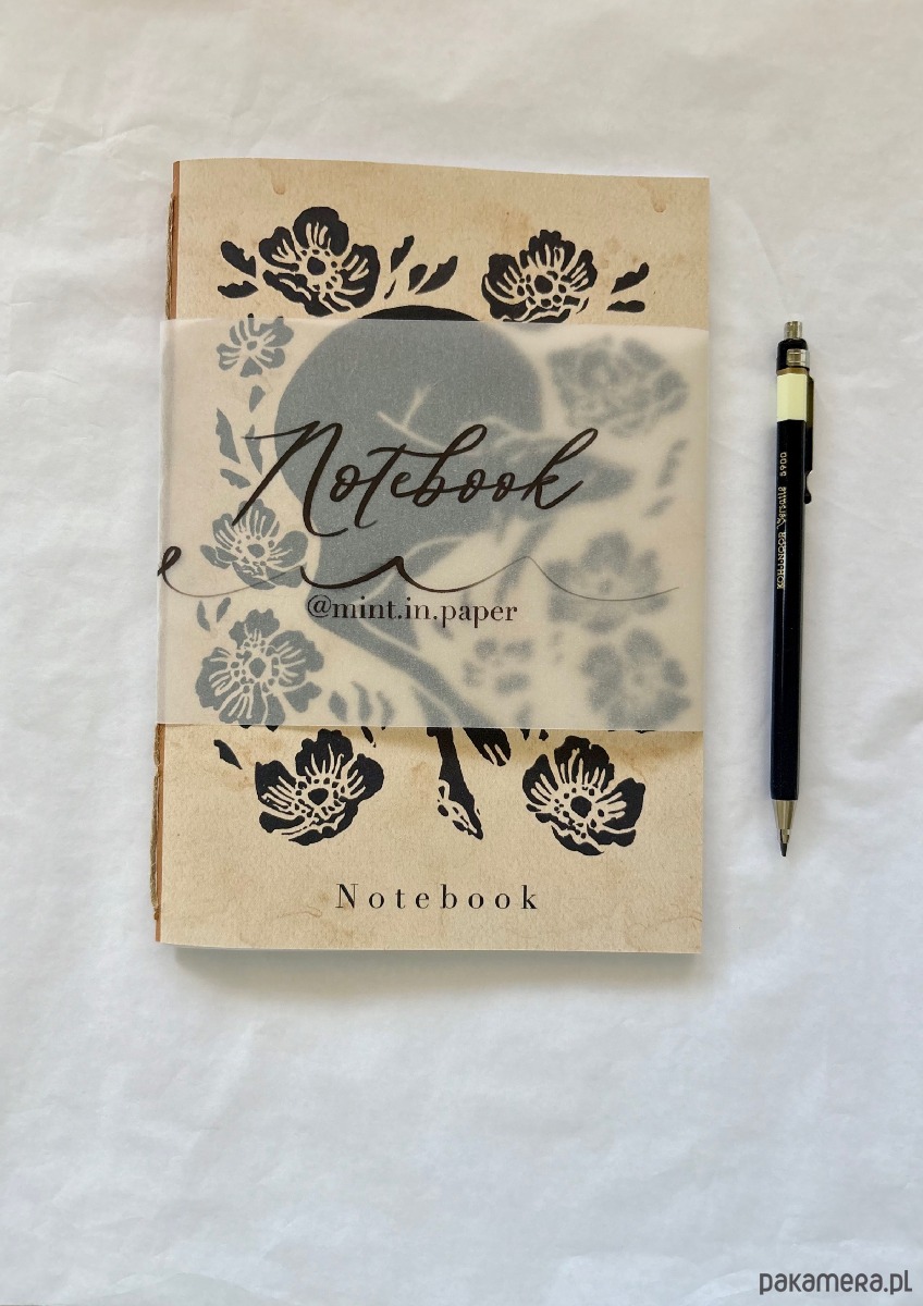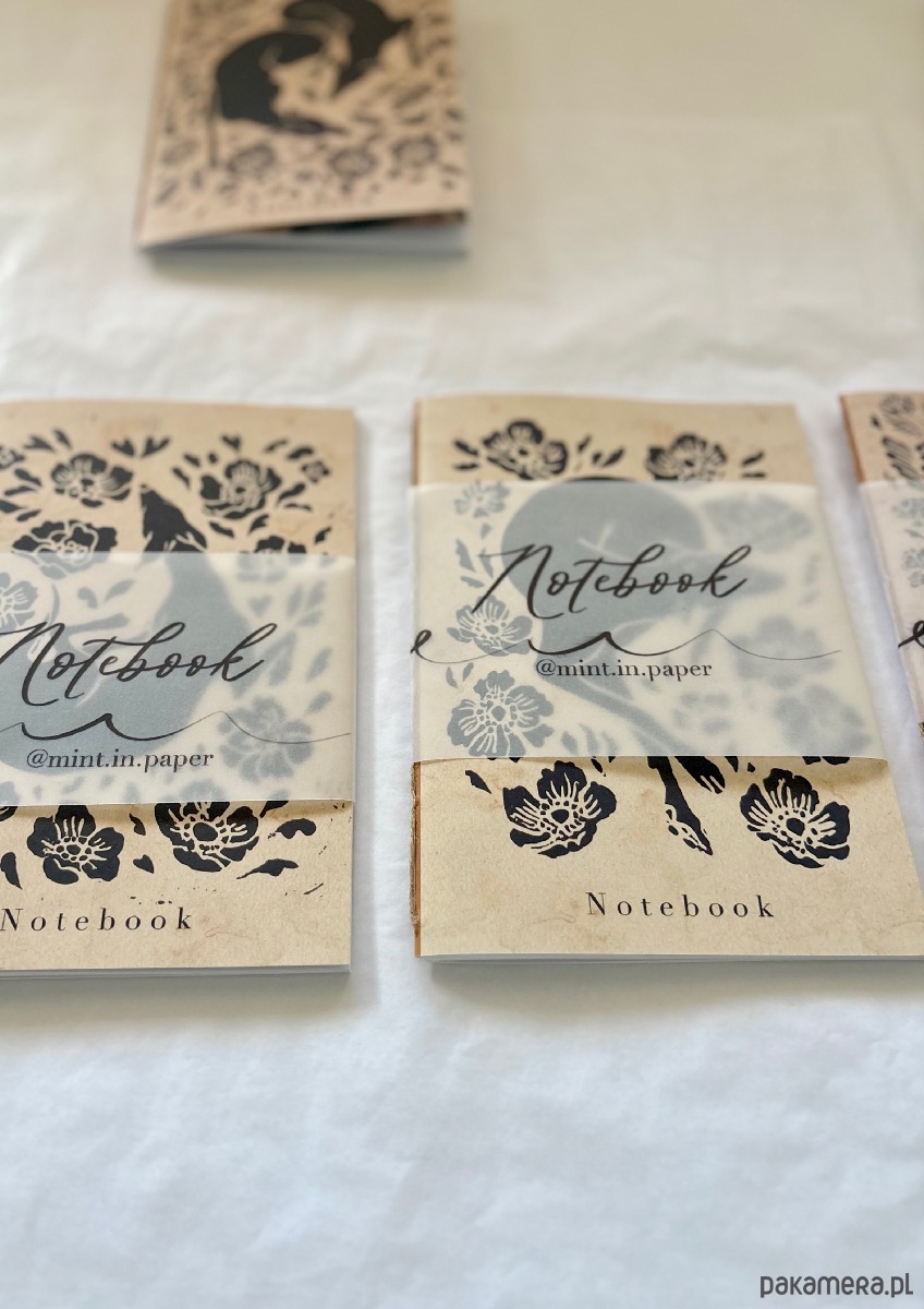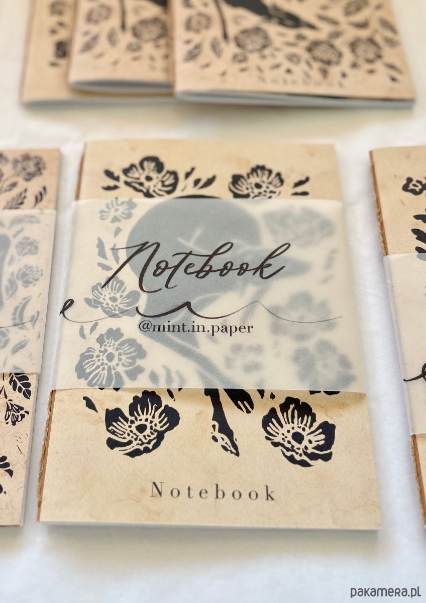 Ręcznie robiony i szyty notes z nadrukowaną grafiką wykonaną wcześniej metodą linorytu.