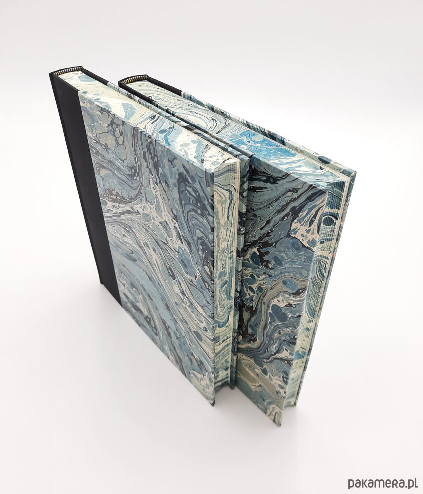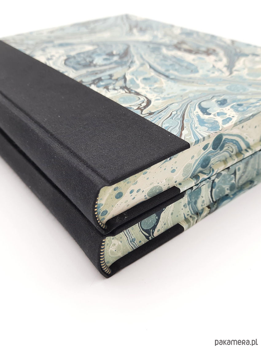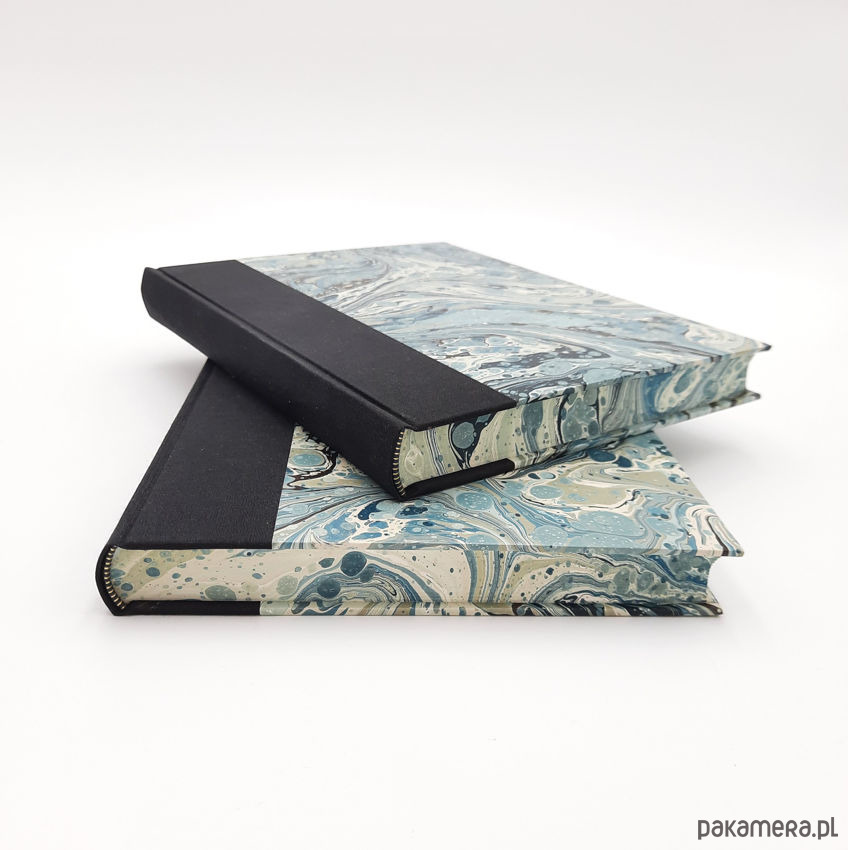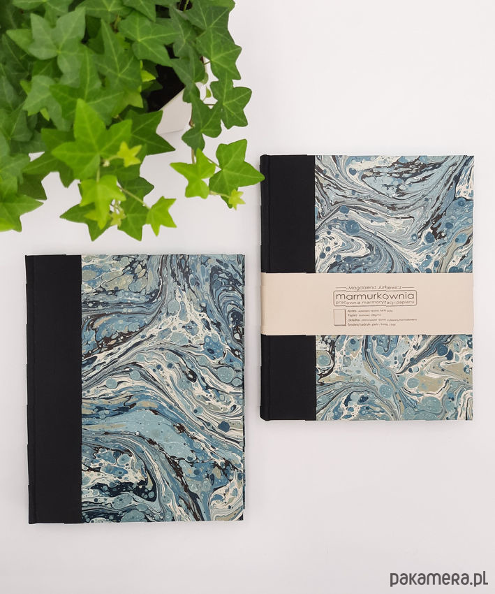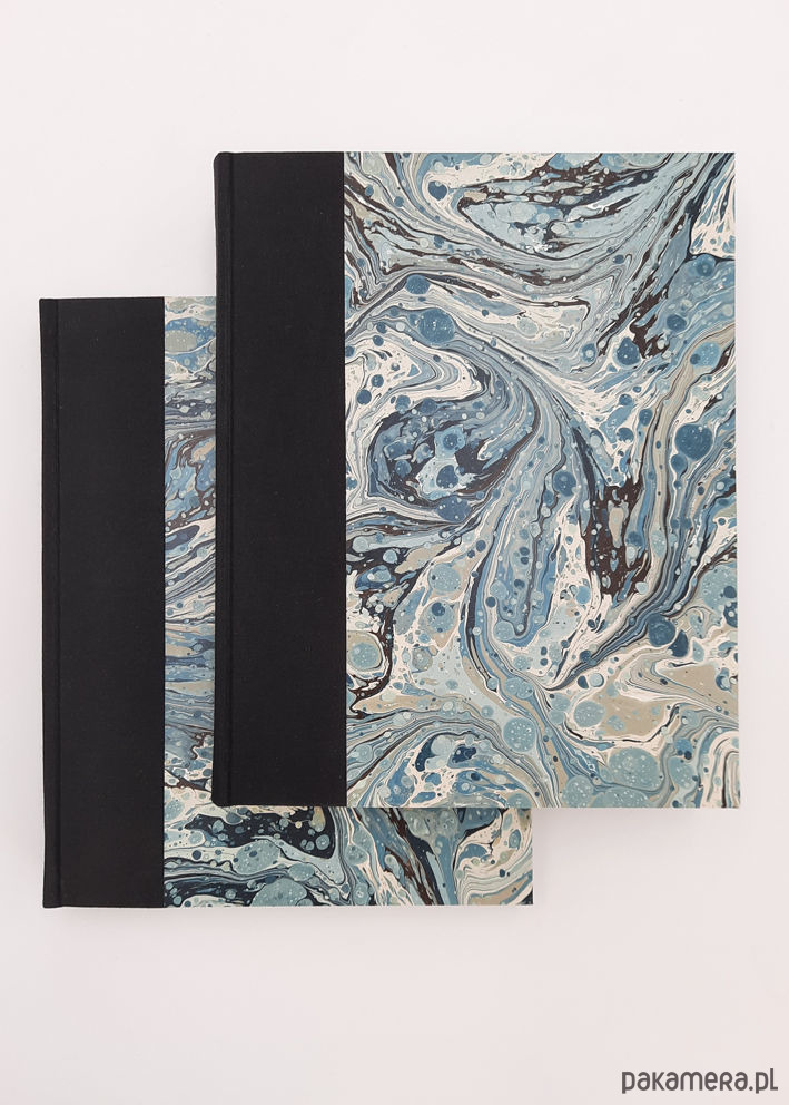 Notes, szkicownik, ręcznie wykonany, w twardej oprawie oklejonej płótnem, oraz papierem barwionym w technice marmoryzacji, który maluję w mojej pracowni. Grzbiet zaokrąglony wykończony ozdobną kapitałką.