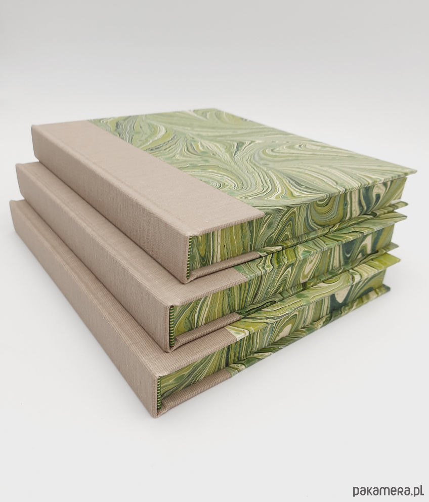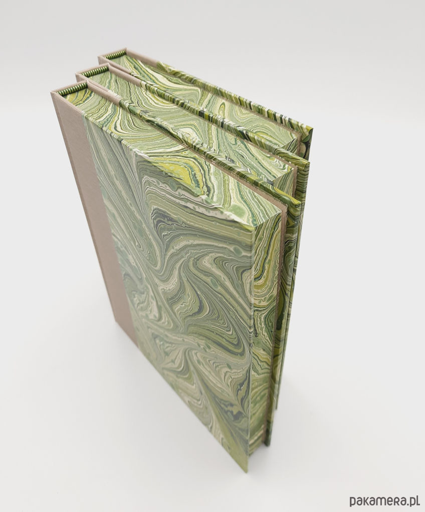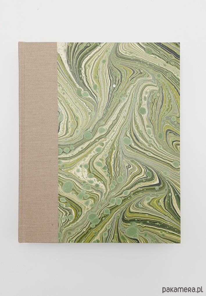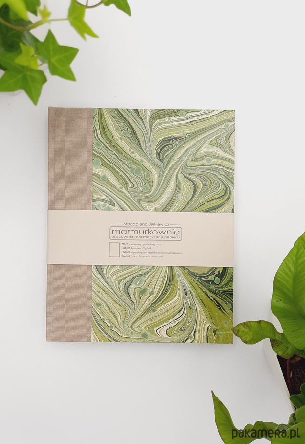 Notes, szkicownik, ręcznie wykonany, w twardej oprawie oklejonej płótnem oraz papierem barwionym w technice marmoryzacji, który maluję w mojej pracowni. Grzbiet wykończony ozdobną kapitałką.