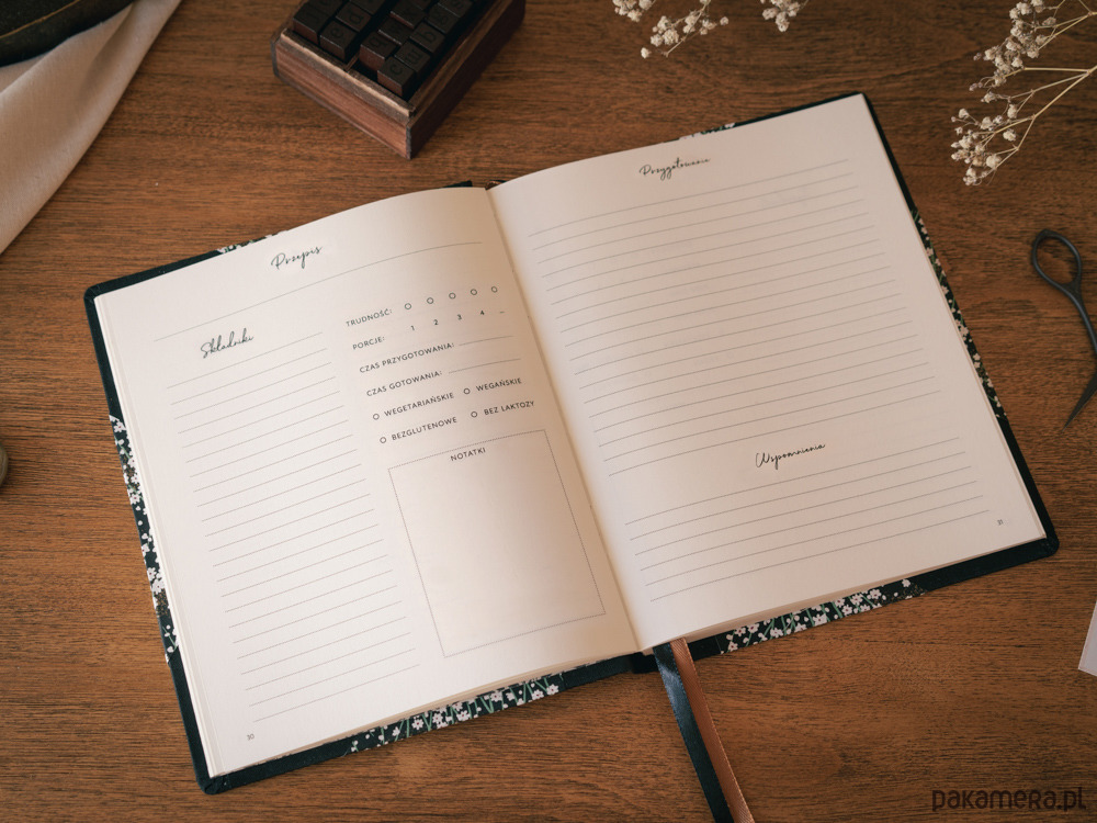 - każdy przepis to dwie strony z miejscem na składniki, notatki lub zdjęcie, sposób przygotowania oraz wspomnienia związane z przepisem