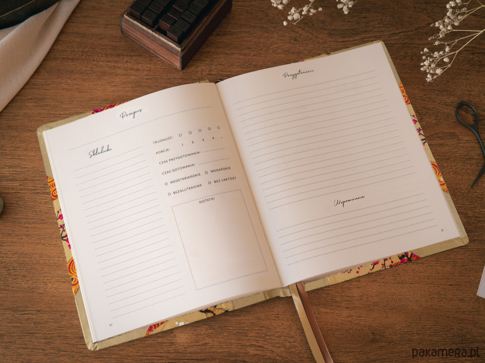 - na każdy przepis są przeznaczone 2 strony: znajdziesz miejsce na wypisanie składników, notatek, wklejenie zdjęcia lub wypisanie wspomnień
