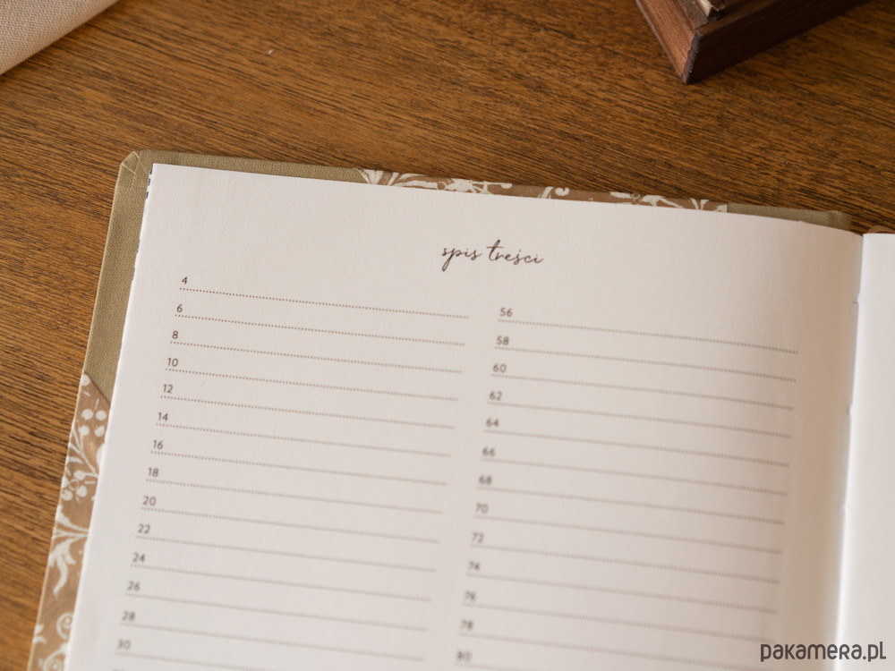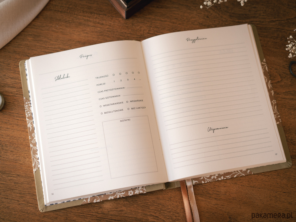 - każdy przepis to dwie strony z miejscem na składniki, notatki lub zdjęcie, sposób przygotowania oraz wspomnienia związane z przepisem