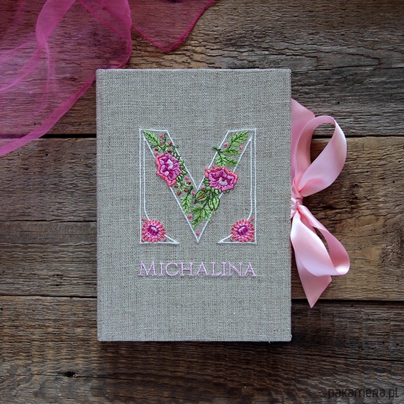 Notatnik, pamiętnik, księga gości od podstaw wykonana ręcznie. Okładka obita naturalnym płótnem lnianym, haftowany inicjał (kolory haftu i tasiemki oraz literę ustalamy poprzez "kontakt" po złożeniu zamówienia). Do zamknięcia atłasowe tasiemki.
