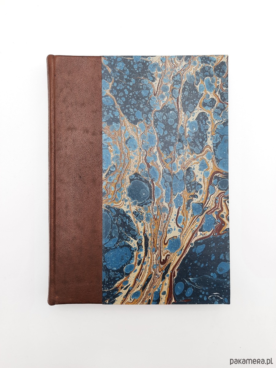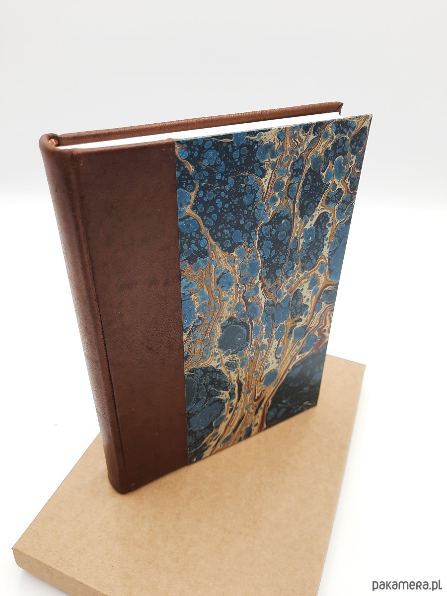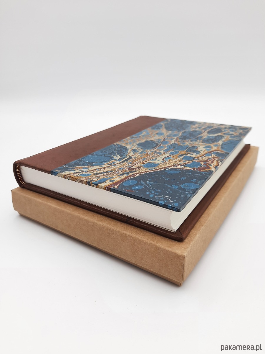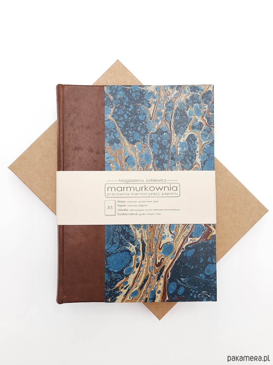 Notes, szkicownik, ręcznie wykonany, w twardej oprawie ze skóry naturalnej oraz papieru barwionego ręcznie, w technice marmoryzacji, który maluję w mojej pracowni.