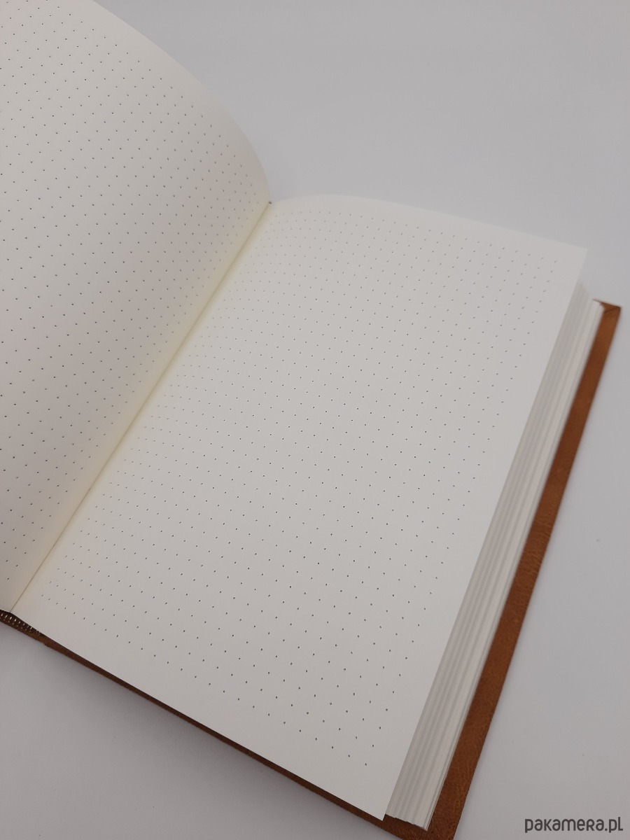 Środek notesu zawiera 240 stron z nadrukiem w kropki, w kolorze ecru, wykonany z wysokiej jakości papieru 100g/m2