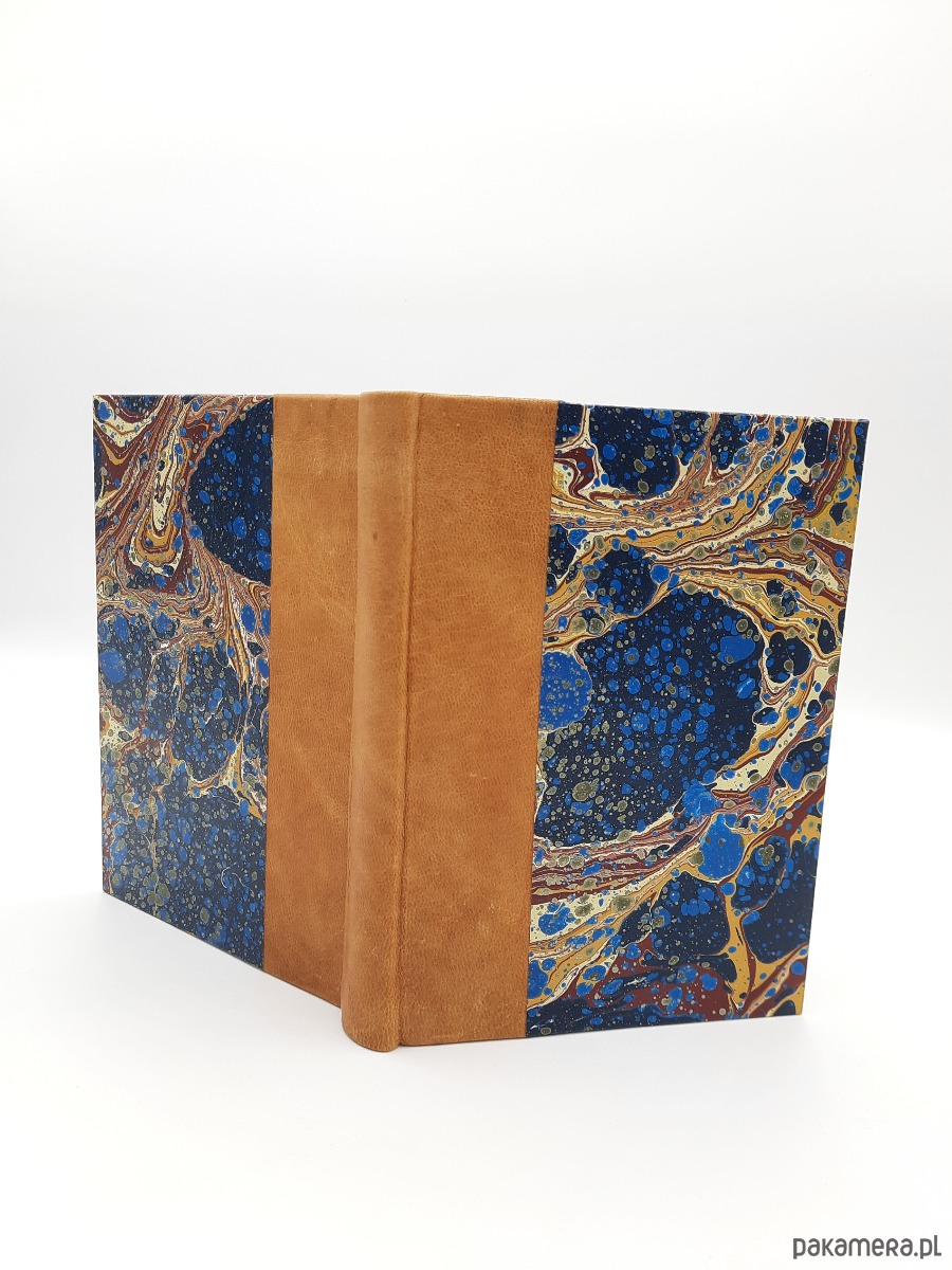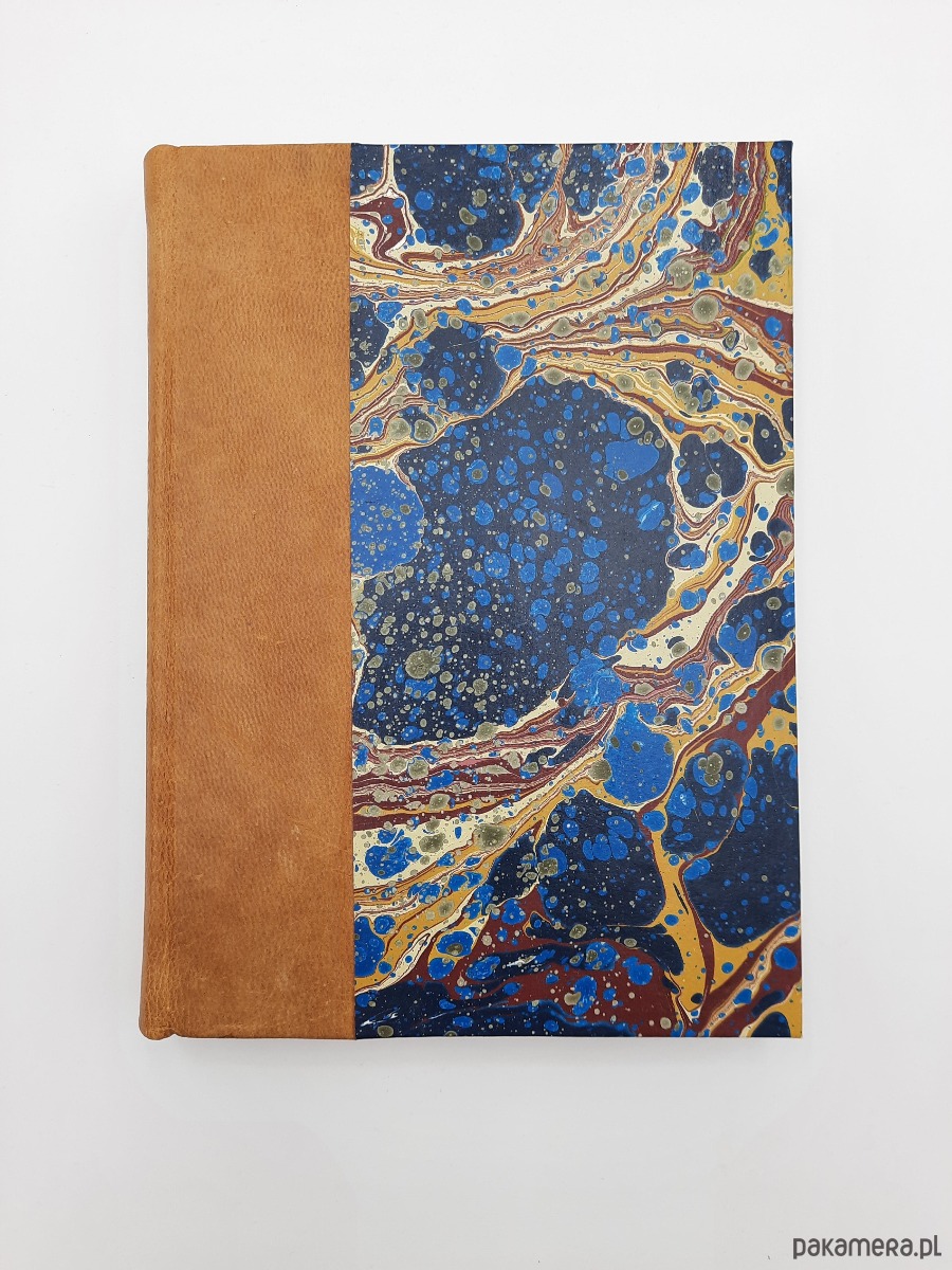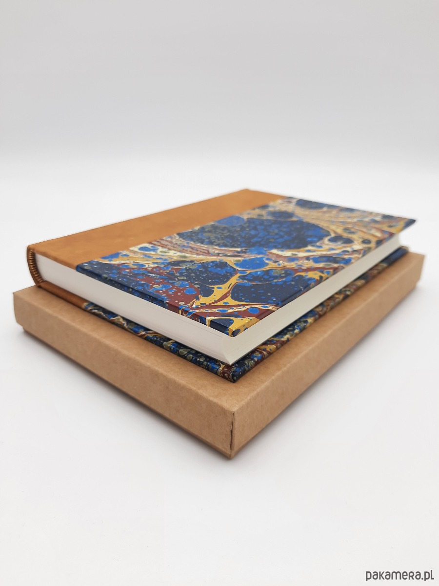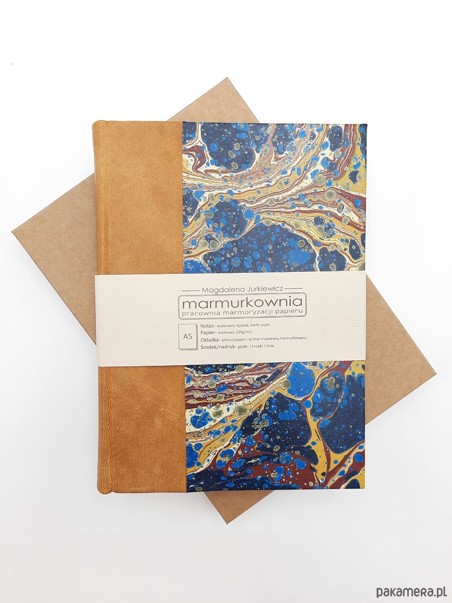 Notes, szkicownik, ręcznie wykonany, w twardej oprawie, z grzbietem ze skóry naturalnej oraz okładką oklejoną papierem barwionym ręcznie, w technice marmoryzacji, który maluję w mojej pracowni.