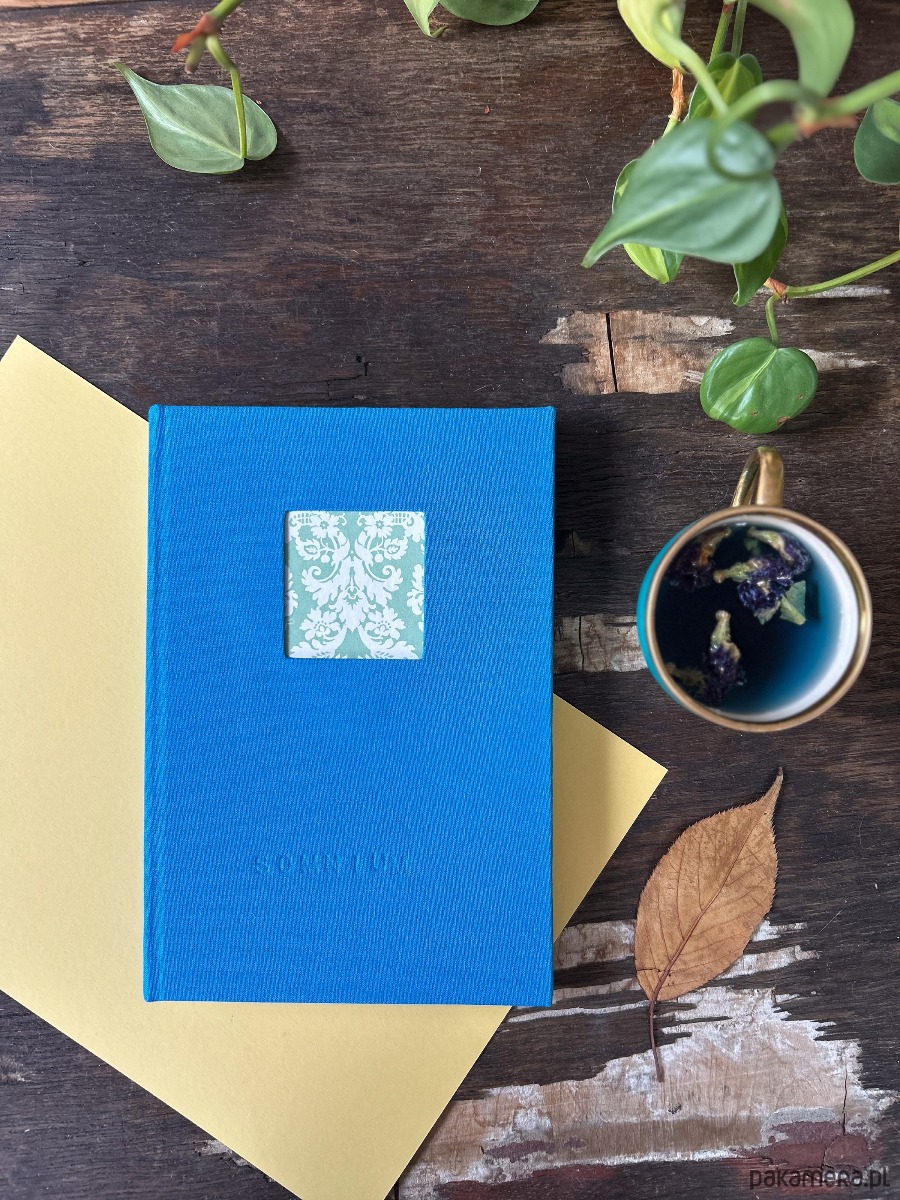 Ręcznie szyty notes „Somnium” w formacie A5, w twardej oprawie z tkaniny o intensywnym, błękitnym kolorze.