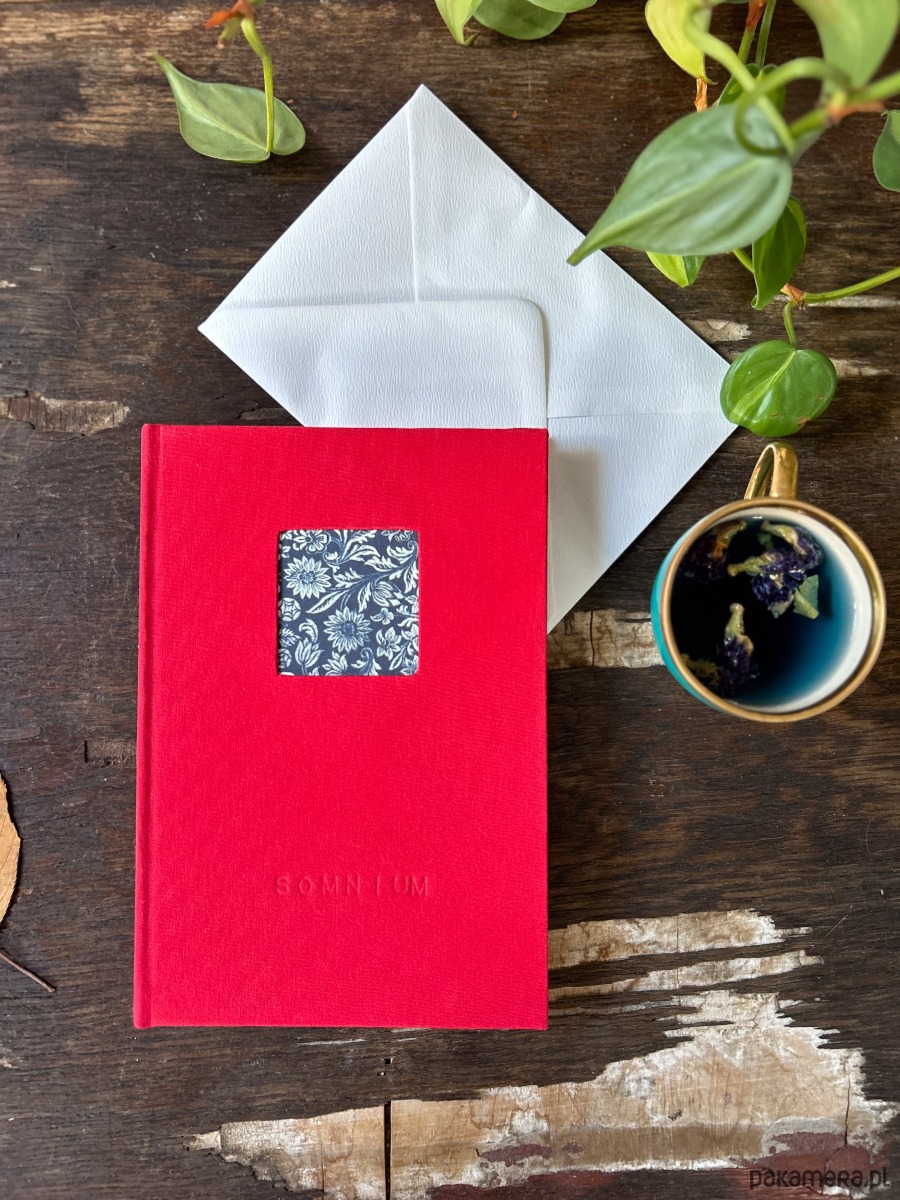 Ręcznie szyty notes w twardej oprawie z tkaniny o głębokim, karminowym odcieniu. Na okładce – małe okienko z papierem w motyw roślinny i wytłoczony napis SOMNIUM, czyli „sen”.