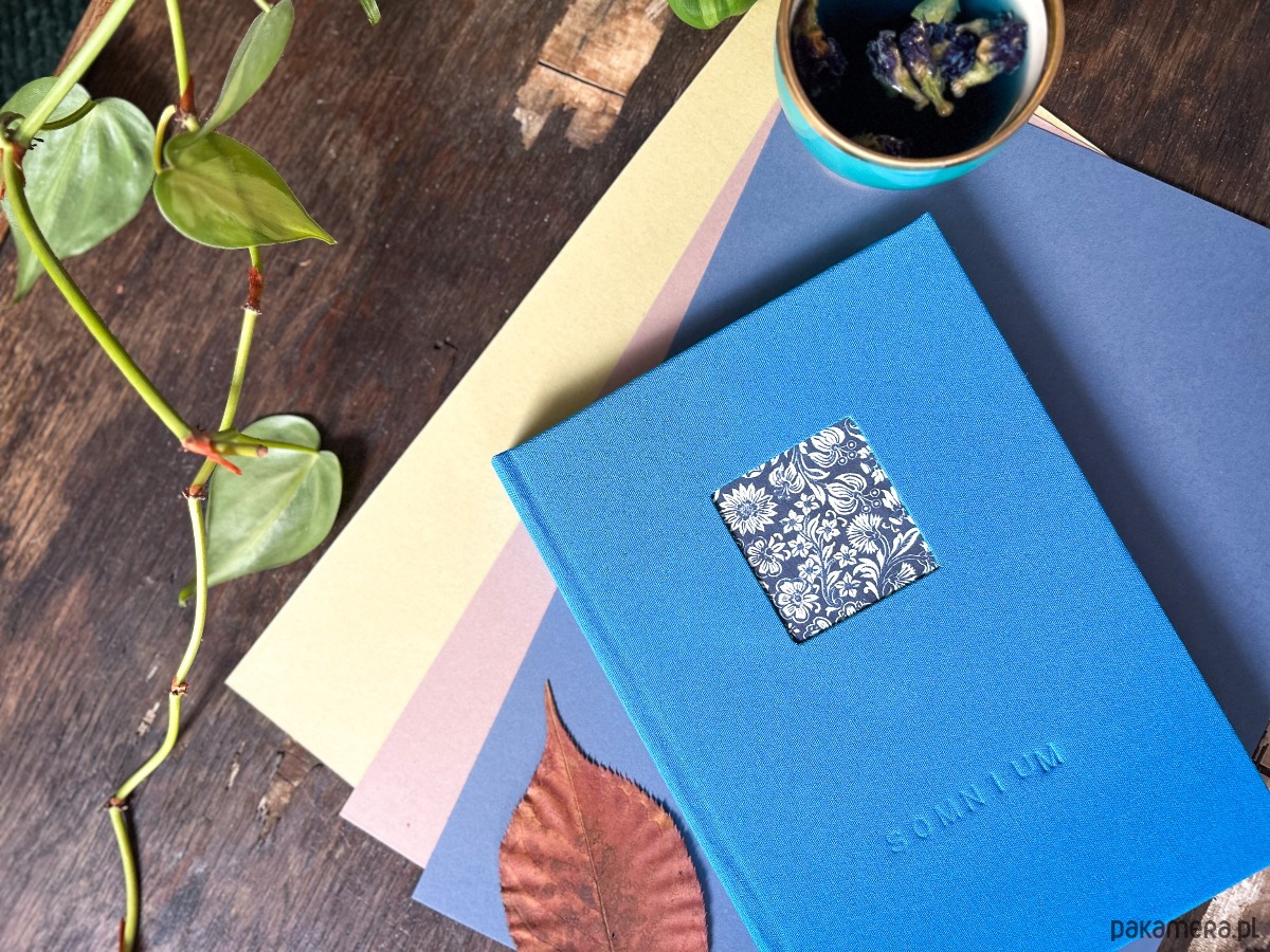 Na okładce znajduje się granatowe okienko z papierem w roślinny wzór oraz subtelne tłoczenie SOMNIUM.