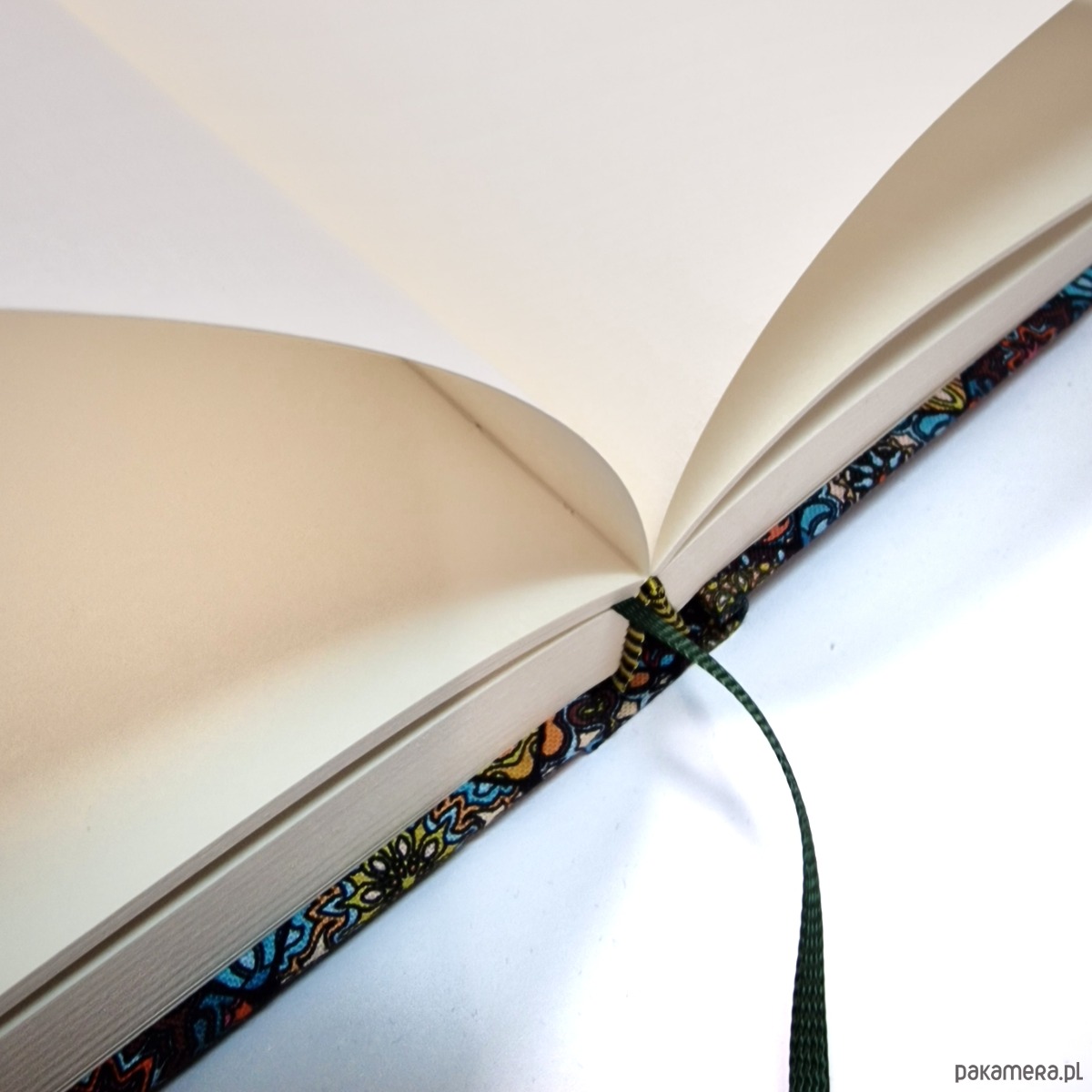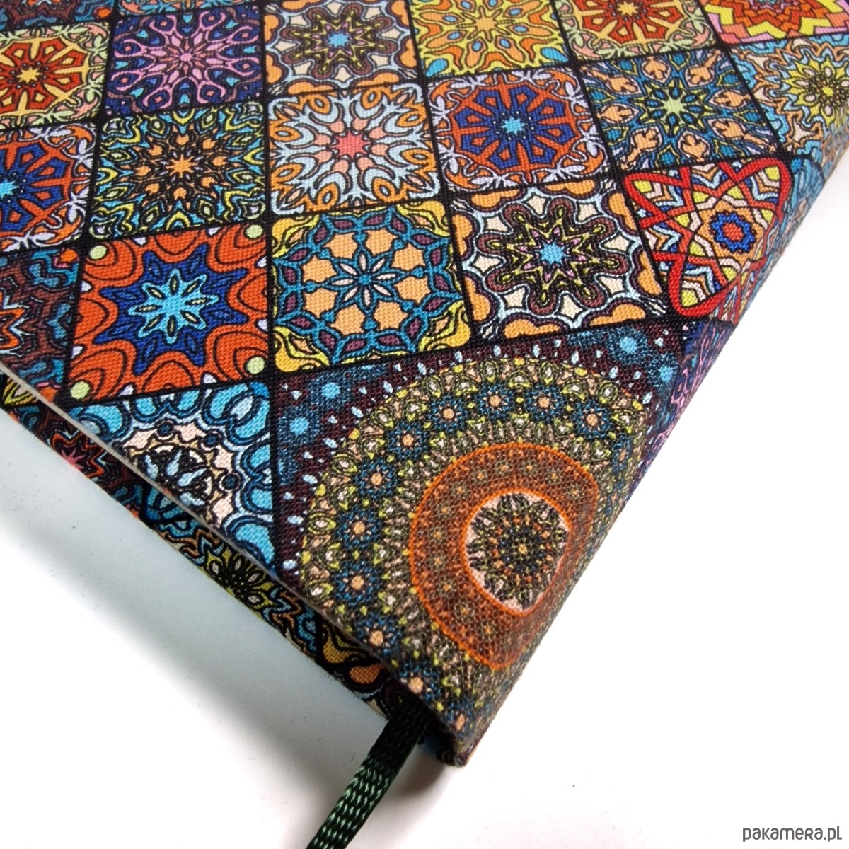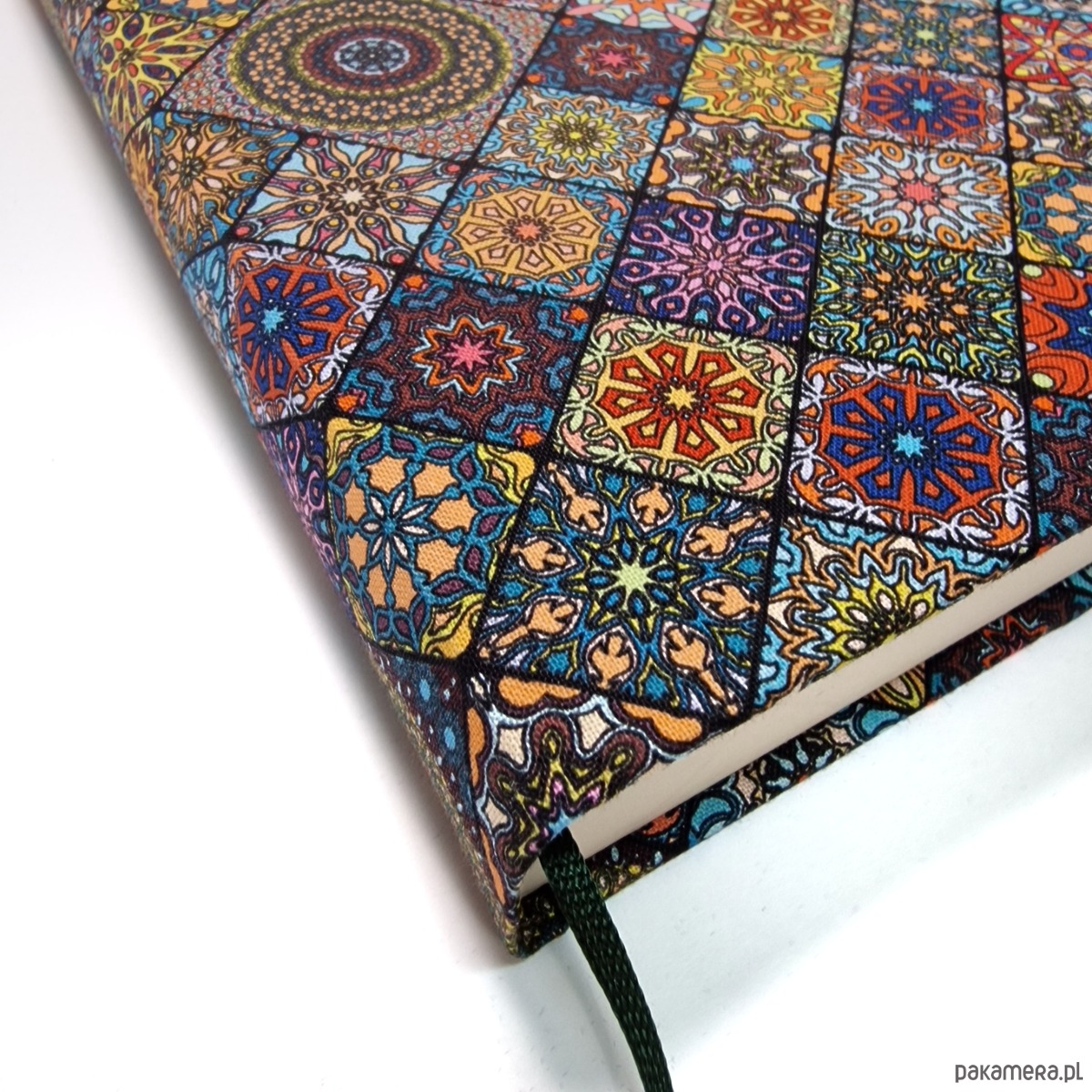 Okładkę zdobi misterna mozaika mandali w stylu iberyjsko-mauretańskim, utkana z tkaniny z domieszką jedwabiu. Jedwabne włókna subtelnie połyskują, wydobywając głębię turkusów, kobaltu i szafranu. Szycie introligatorskie na płasko ułatwia swobodne rozkładanie kartek, a satynowa wstążka-zakładka pomaga odnaleźć ważne strony.