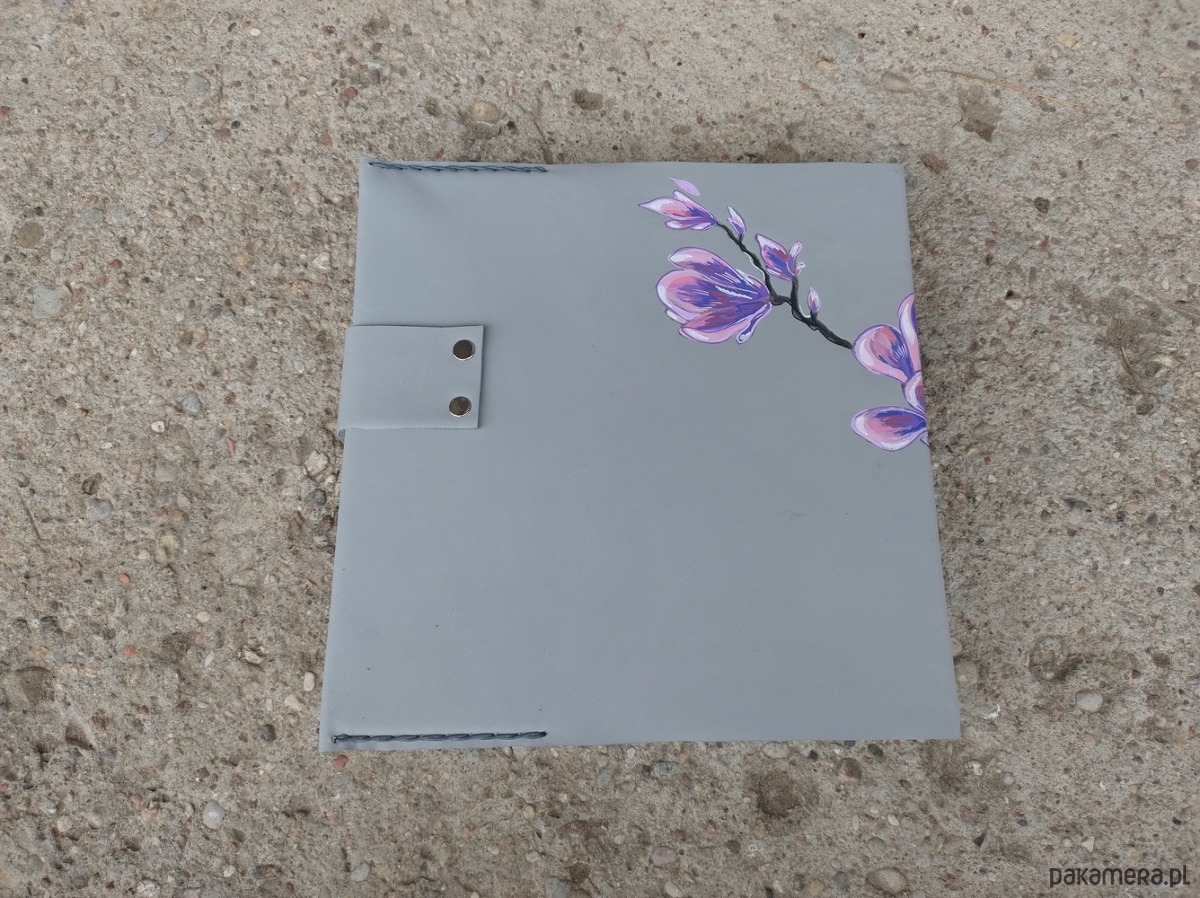 Szkicownik, pamiętnik wykonany ręcznie z naturalnej, impregnowanej skóry w kolorze jasno-szarym. Ozdobiony malowanym motywem magnolii oraz minerałem Agatem. Malowany wzór odporny na działanie czynników atmosferycznych. 50 stron , gruby papier 280 g/m. Format wkładu większy niż A5 ,dostępny w sprzedaży. Wkład można wymienić , dzięki temu szkicownik posłuży długie lata . Zamykany na napę. Pojedynczy egzemplarz, autorski projekt.