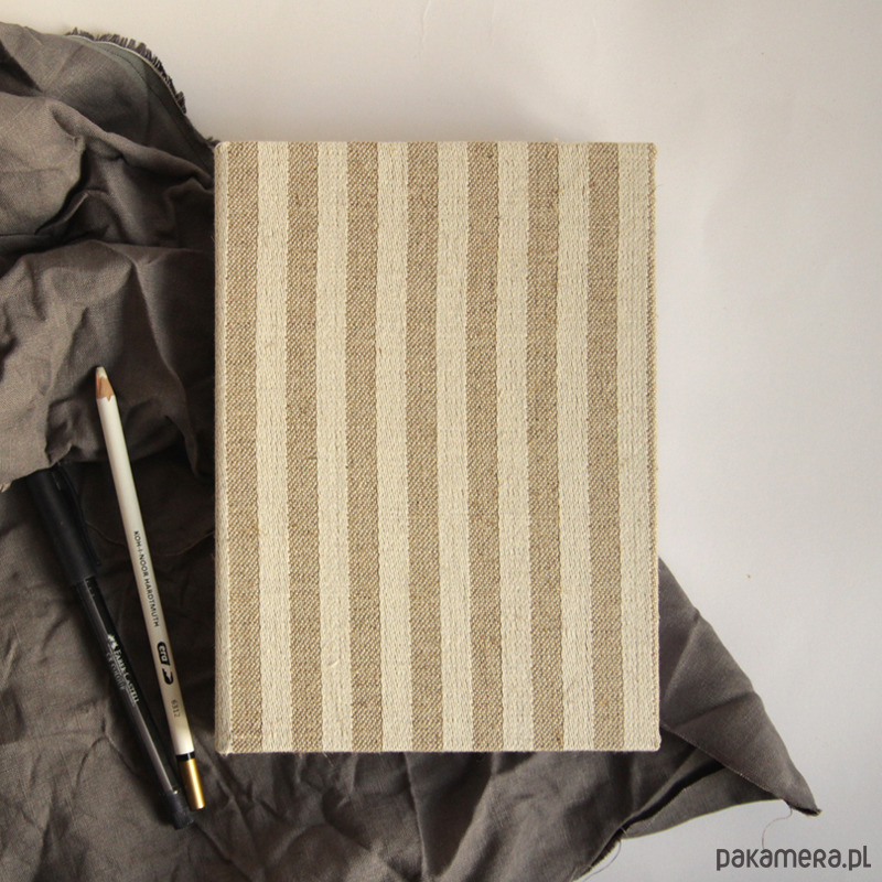 Prosty notes obity surowym naturalnym płótnem lnianym, wykonany od podstaw w pracowni introligatorskiej. Tkanina jest gruba i ma wyraźnie wyczuwalną fakturę. To naturalny polski len. Idealny dla miłośników minimalizmu i naturalnych rozwiązań.