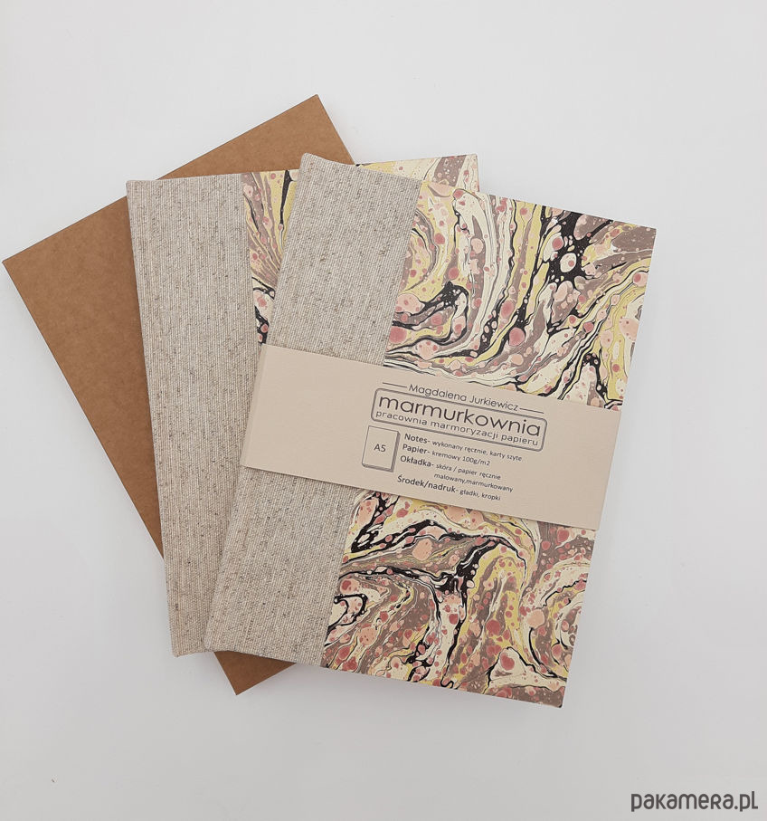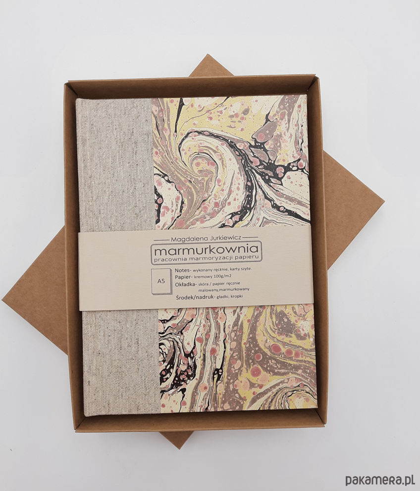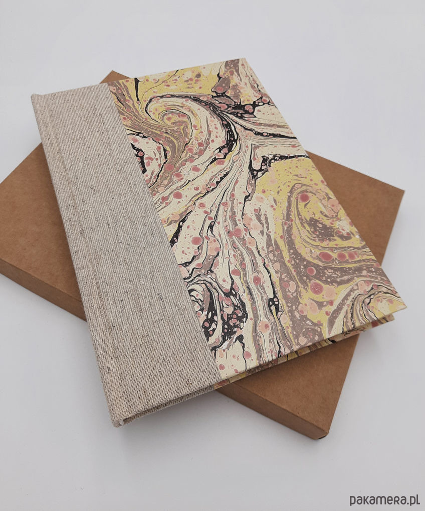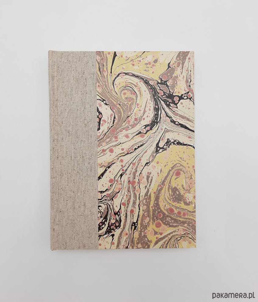 Notes, szkicownik, ręcznie wykonany, w twardej oprawie oklejonej płótnem oraz papierem barwionym w technice marmoryzacji, który maluję w mojej pracowni.