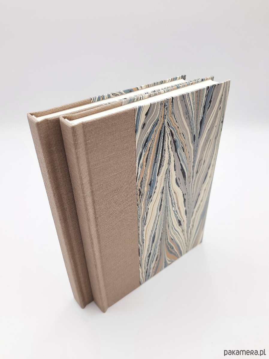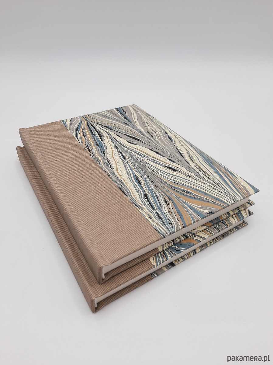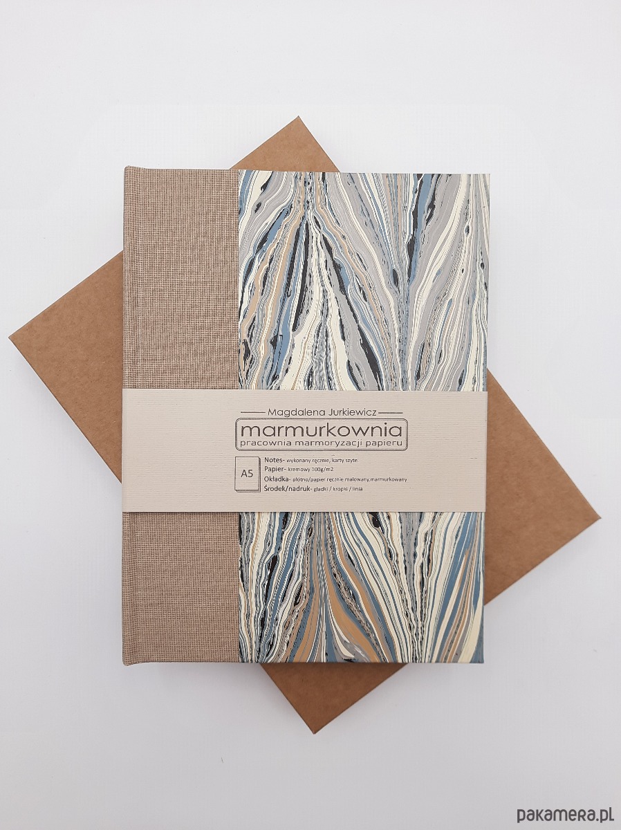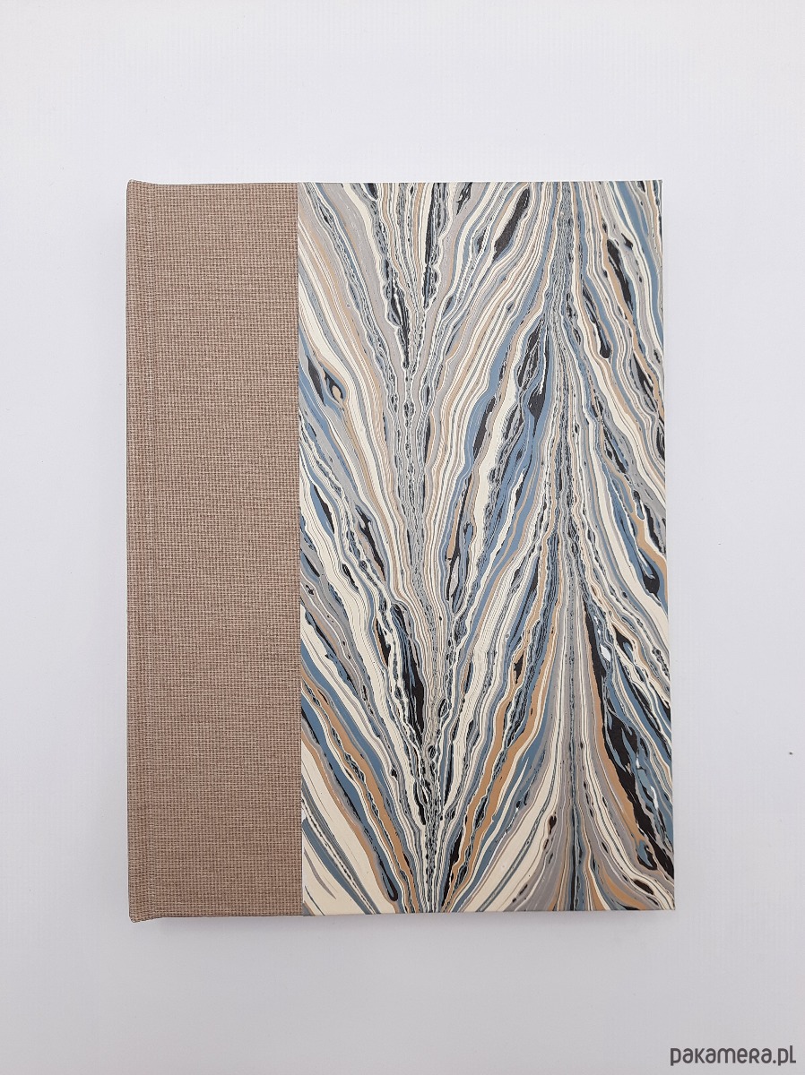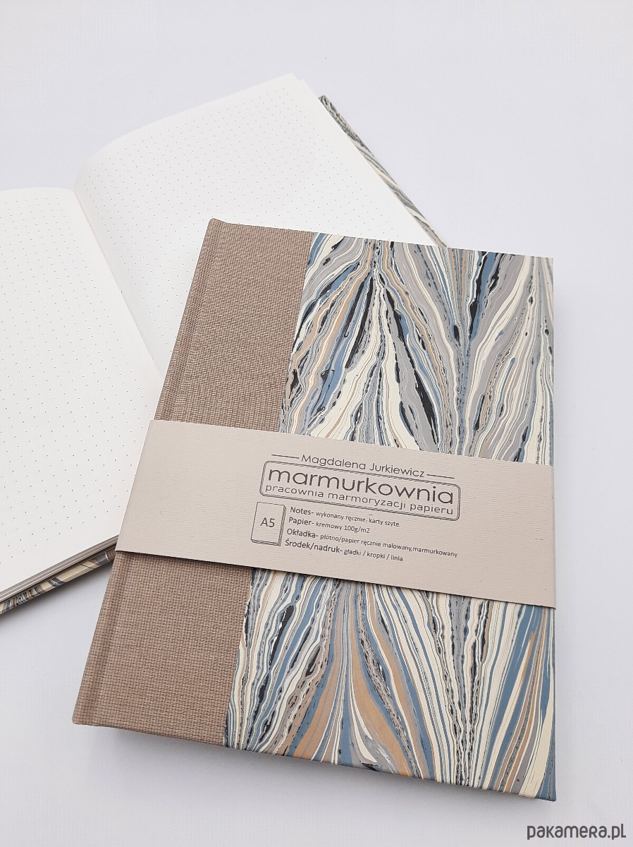 Notes, szkicownik, ręcznie wykonany, w twardej oprawie oklejonej płótnem oraz papierem barwionym w technice marmoryzacji, który maluję w mojej pracowni.
