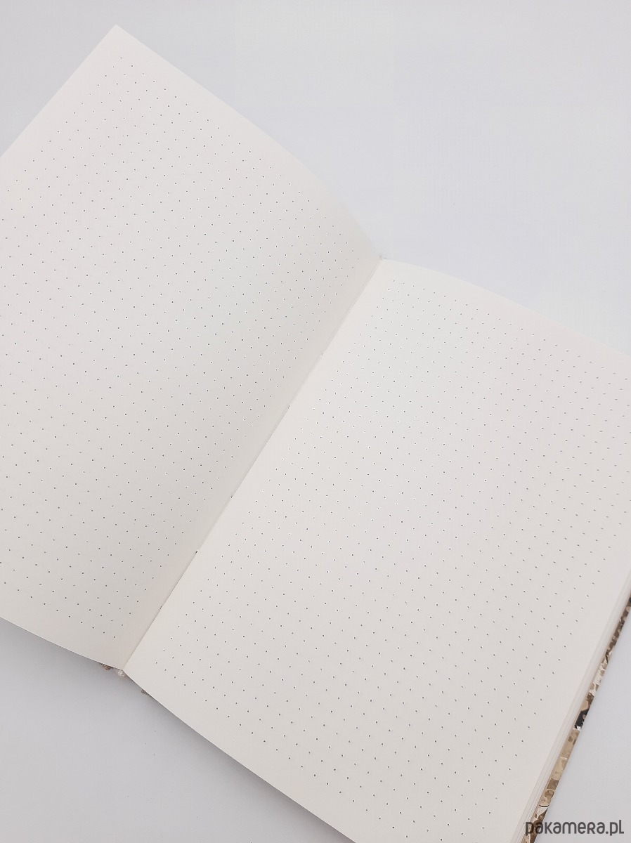 Środek notesu zawiera 160 stron z nadrukiem w kropki, w kolorze ecru, wykonany z wysokiej jakości papieru 100g/m2