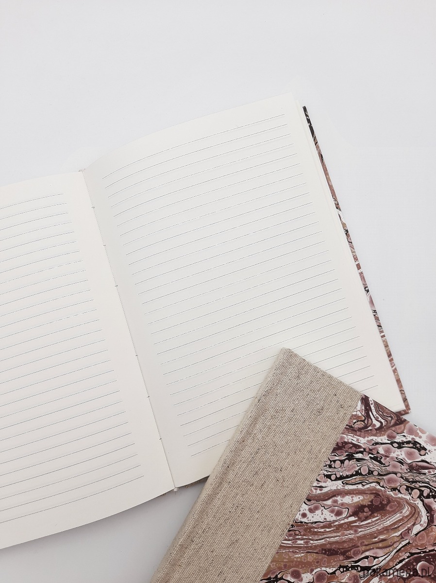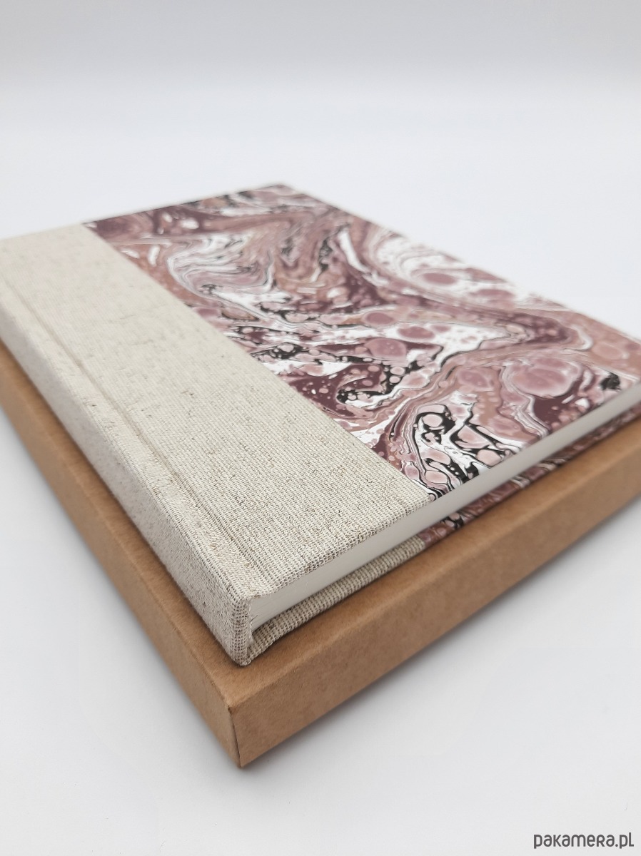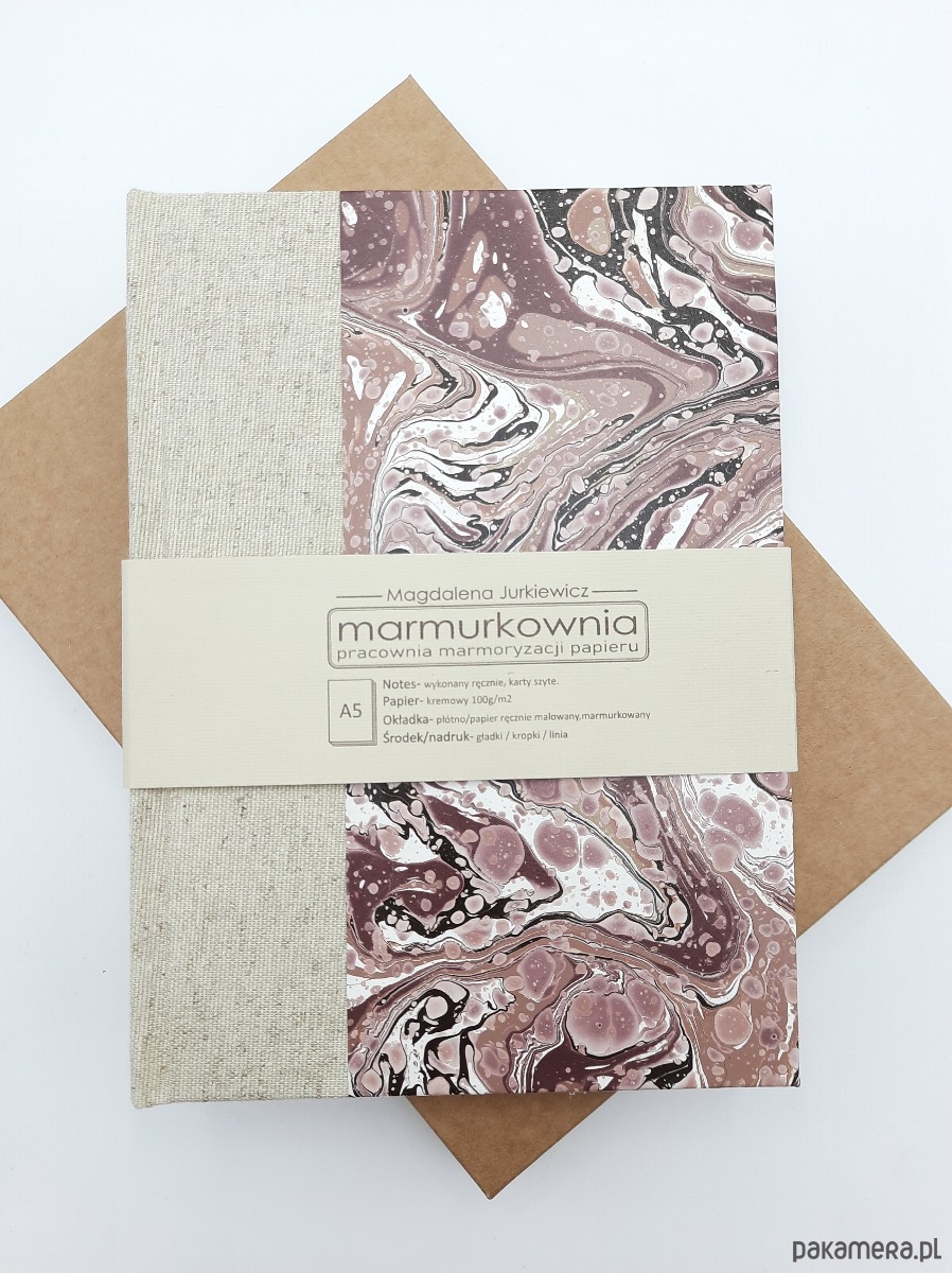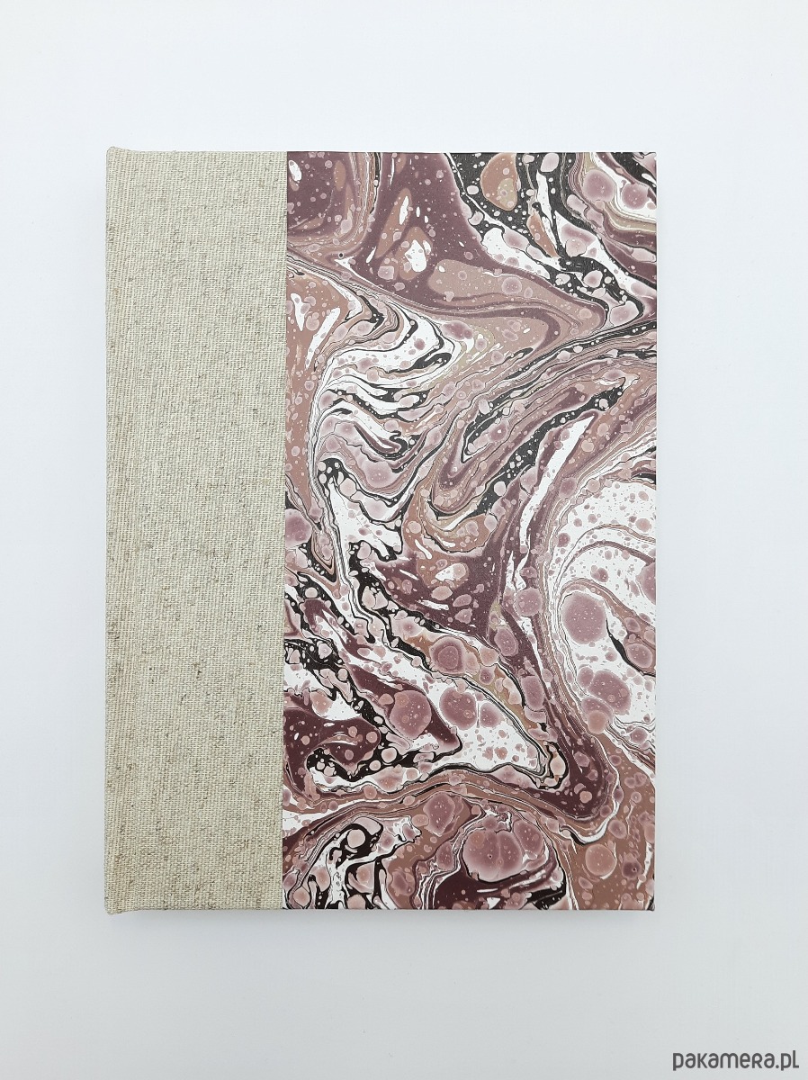 Notes, szkicownik, ręcznie wykonany, w twardej oprawie oklejonej płótnem oraz papierem barwionym w technice marmoryzacji, który maluję w mojej pracowni.