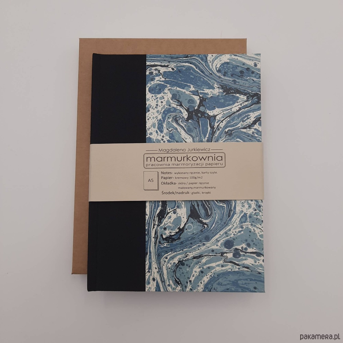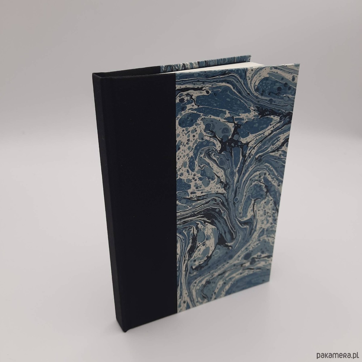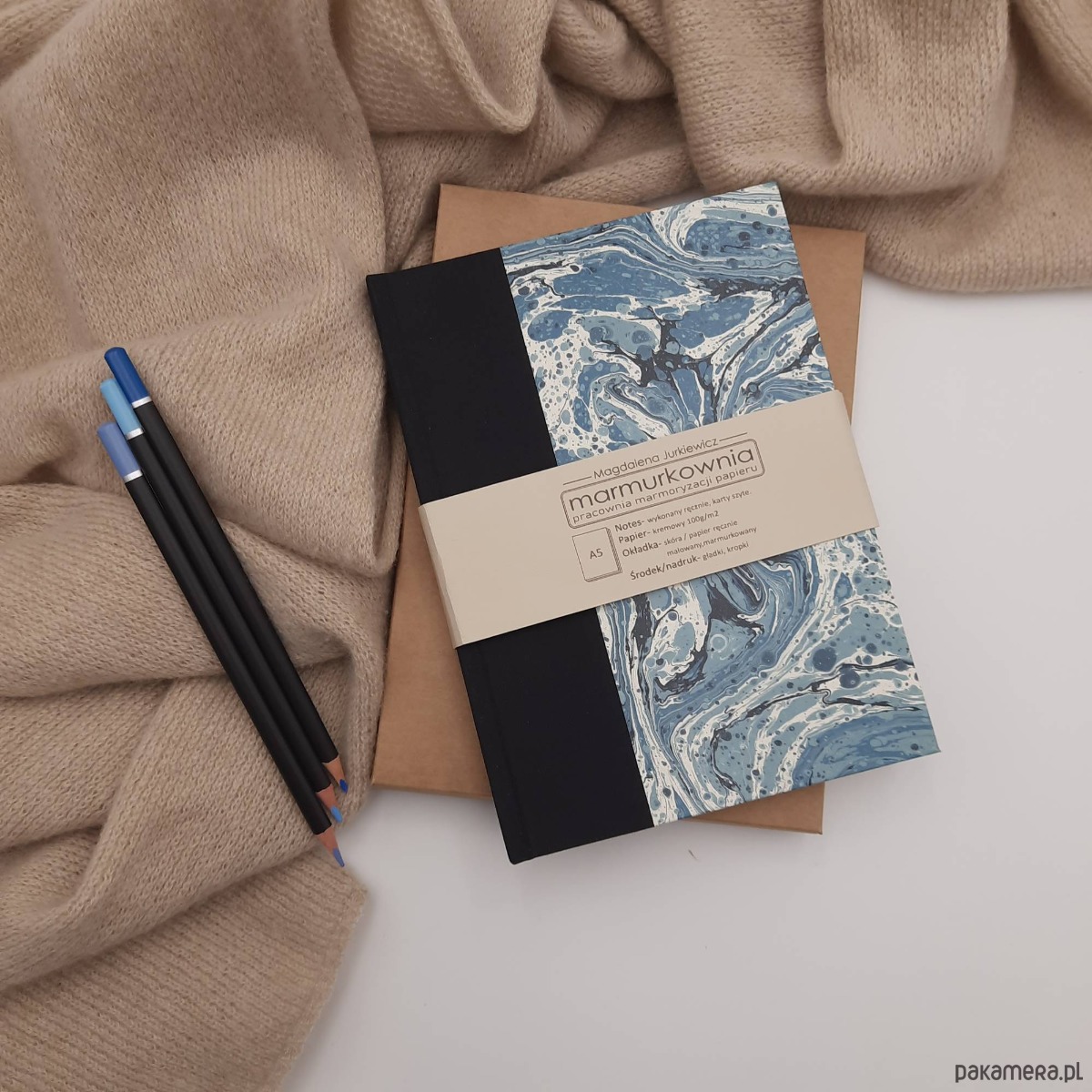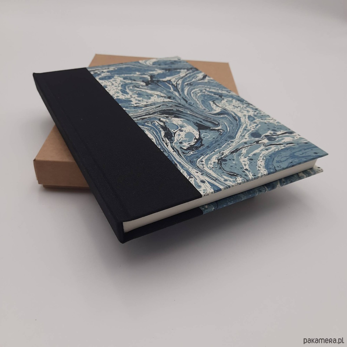 Notes, szkicownik, ręcznie wykonany, w twardej oprawie oklejonej płótnem oraz papierem barwionym w technice marmoryzacji, który maluję w mojej pracowni.