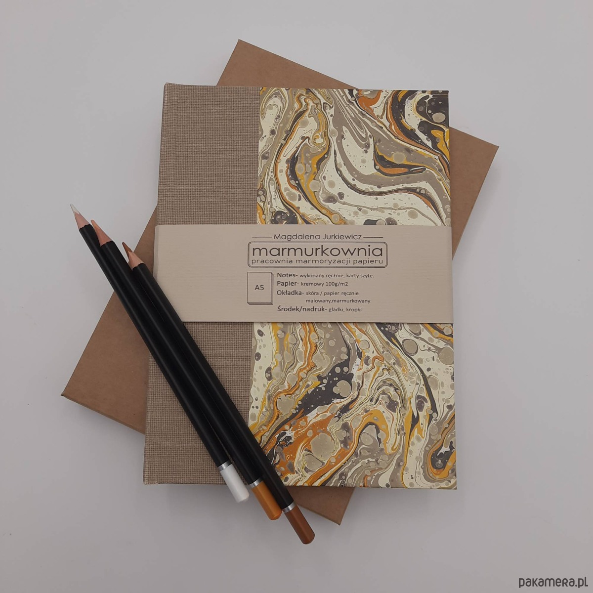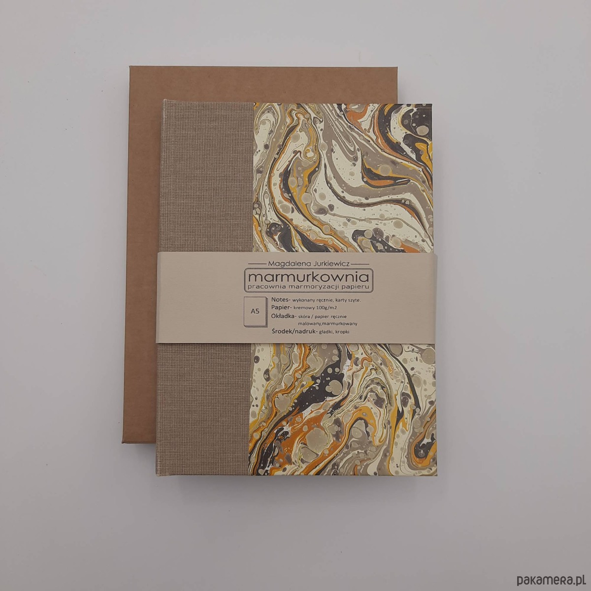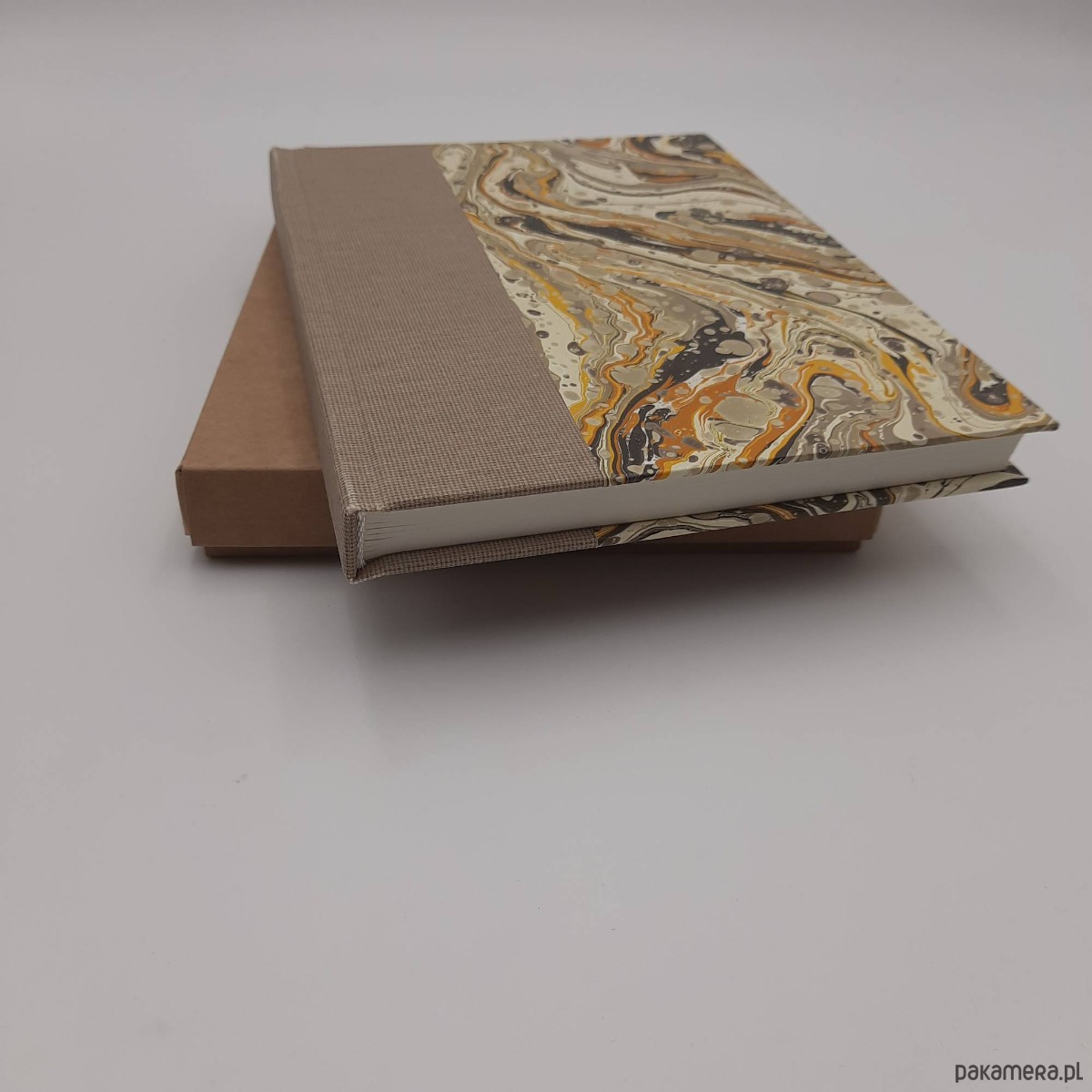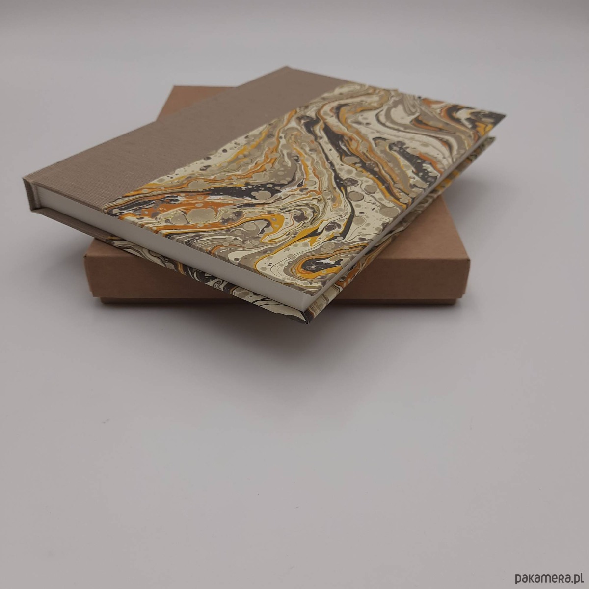 Notes, szkicownik, ręcznie wykonany, w twardej oprawie oklejonej płótnem oraz papierem barwionym w technice marmoryzacji, który maluję w mojej pracowni.