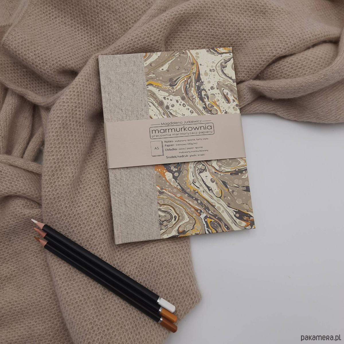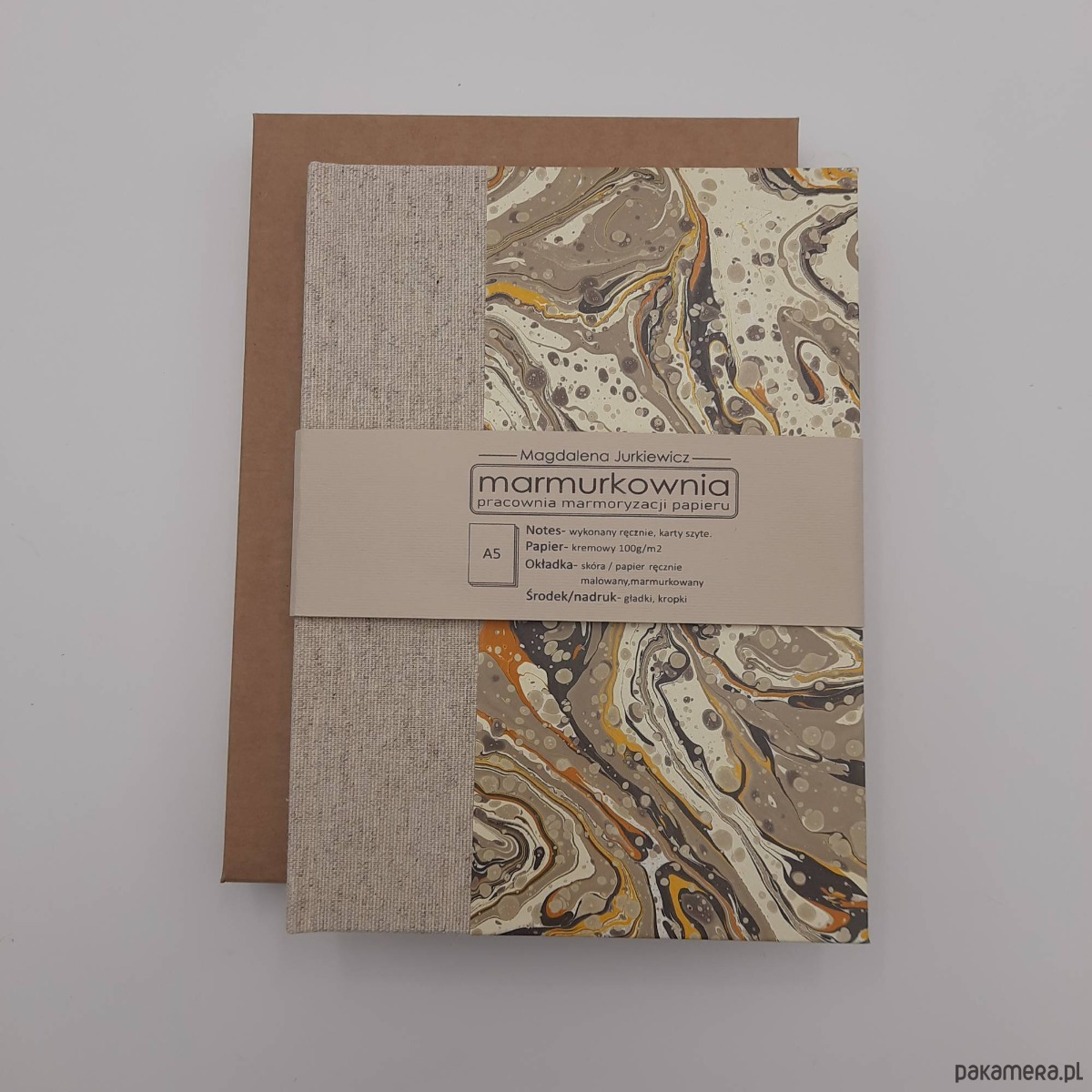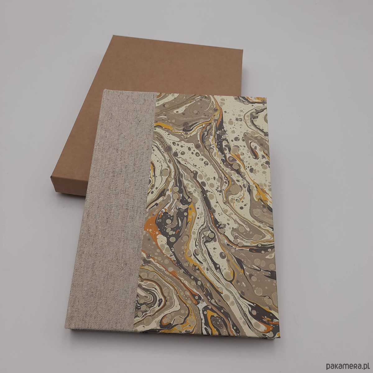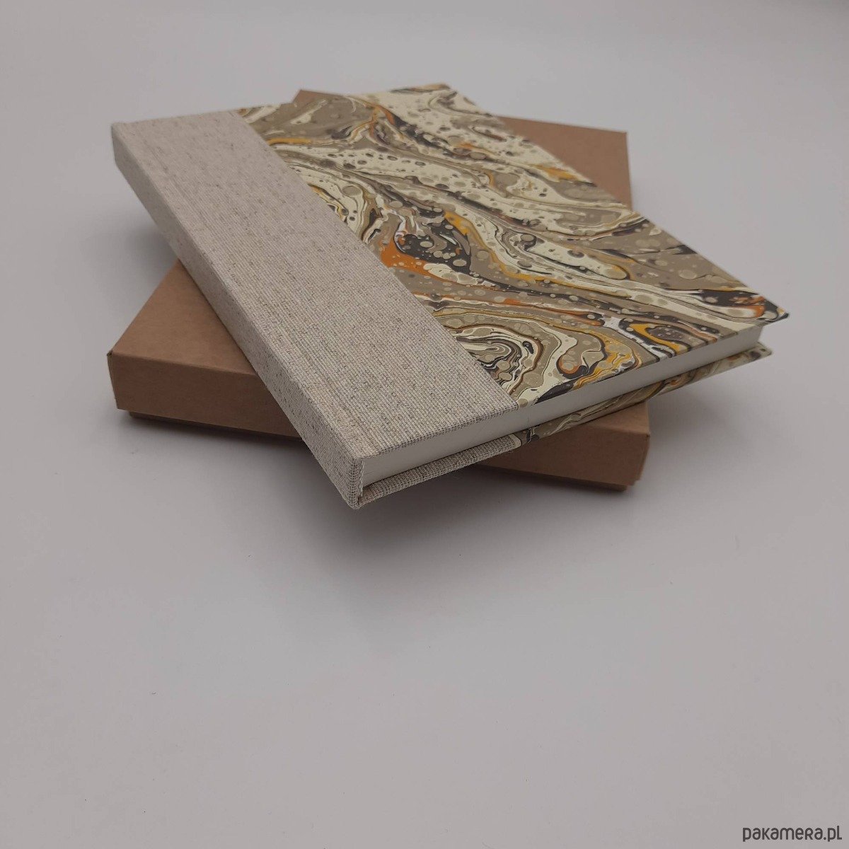Notes, szkicownik, ręcznie wykonany, w twardej oprawie oklejonej płótnem oraz papierem barwionym w technice marmoryzacji, który maluję w mojej pracowni.