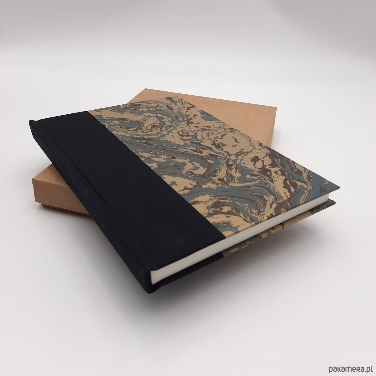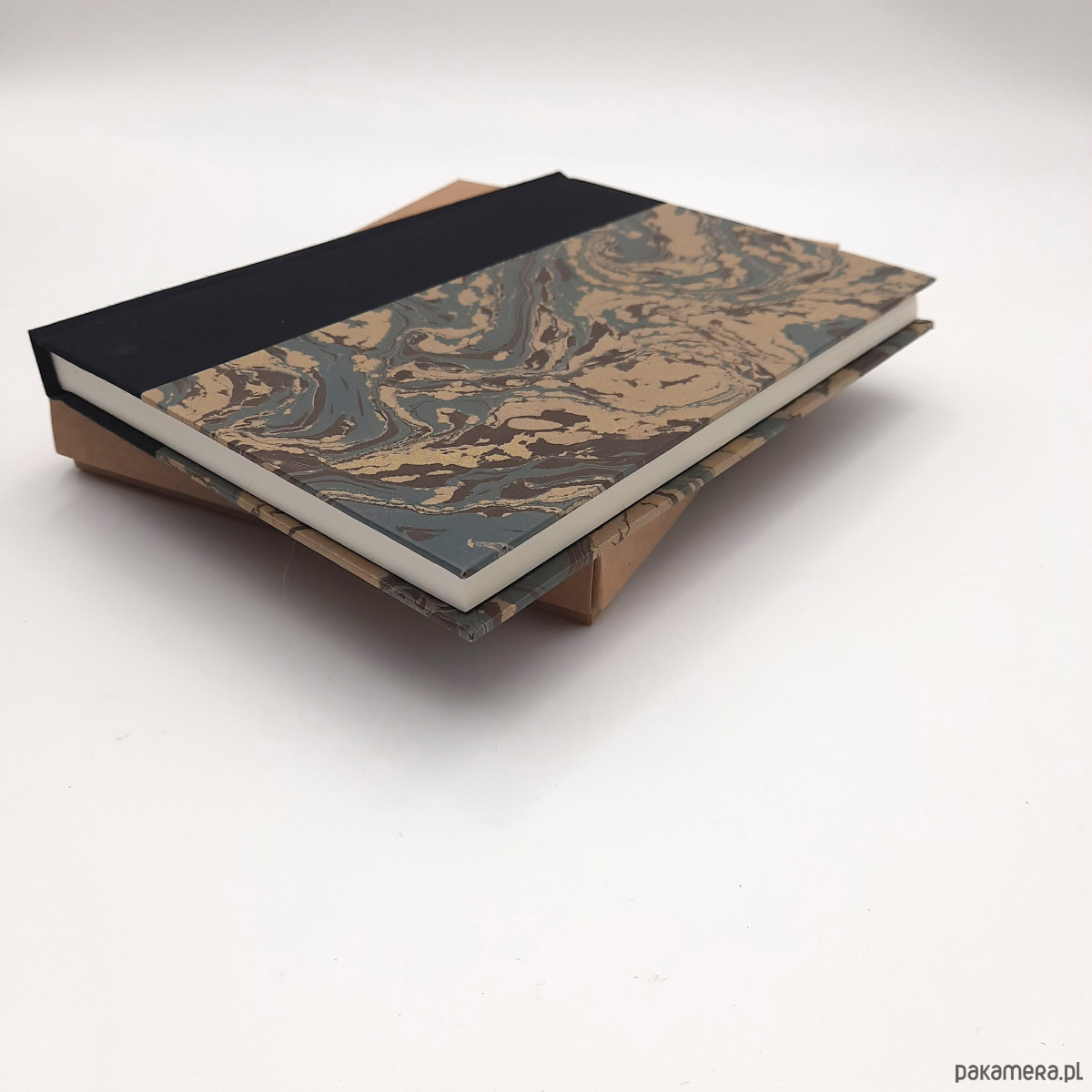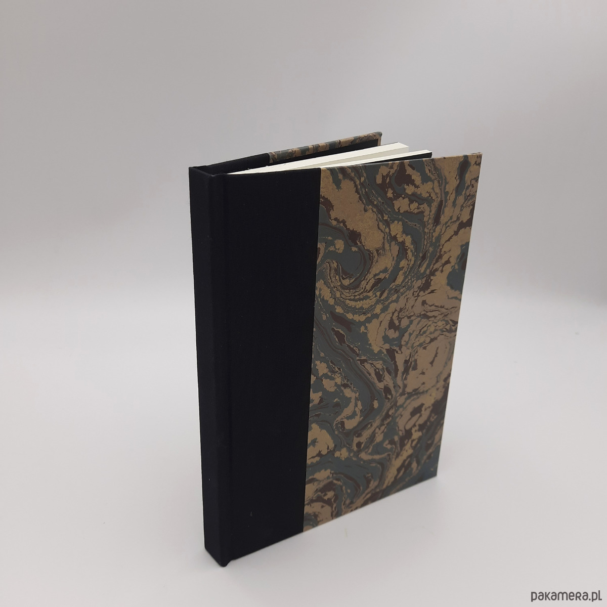 Notes, szkicownik, ręcznie wykonany, w twardej oprawie oklejonej płótnem oraz papierem barwionym w technice marmoryzacji, który maluję w mojej pracowni.