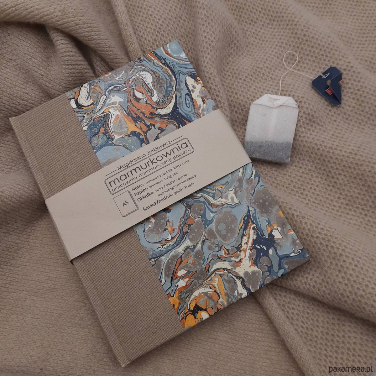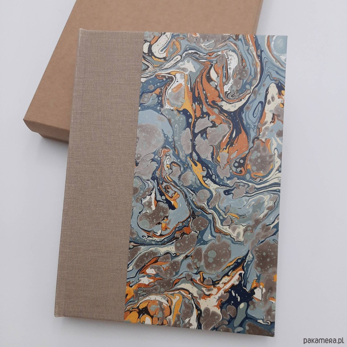 Notes, szkicownik, ręcznie wykonany, w twardej oprawie oklejonej płótnem oraz papierem barwionym w technice marmoryzacji, który maluję w mojej pracowni.