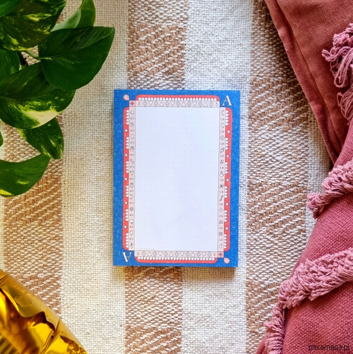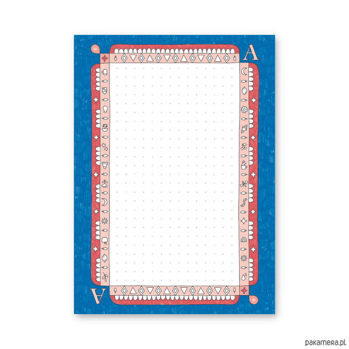 Drobny gadżet, a tyle możliwości! Ten kieszonkowy notes (format A6, czyli wielkość pocztówki) kryje w sobie 100 kartek w delikatne kropki, które sprawdzą się zarówno do notatek, jak i do małych rysunków czy kreatywnego planowania. Okładka w geometrycznym stylu z nutką retro dodaje mu charakteru, a Ty możesz poczuć się jak as w notowaniu – dosłownie, bo na okładce króluje karta A
