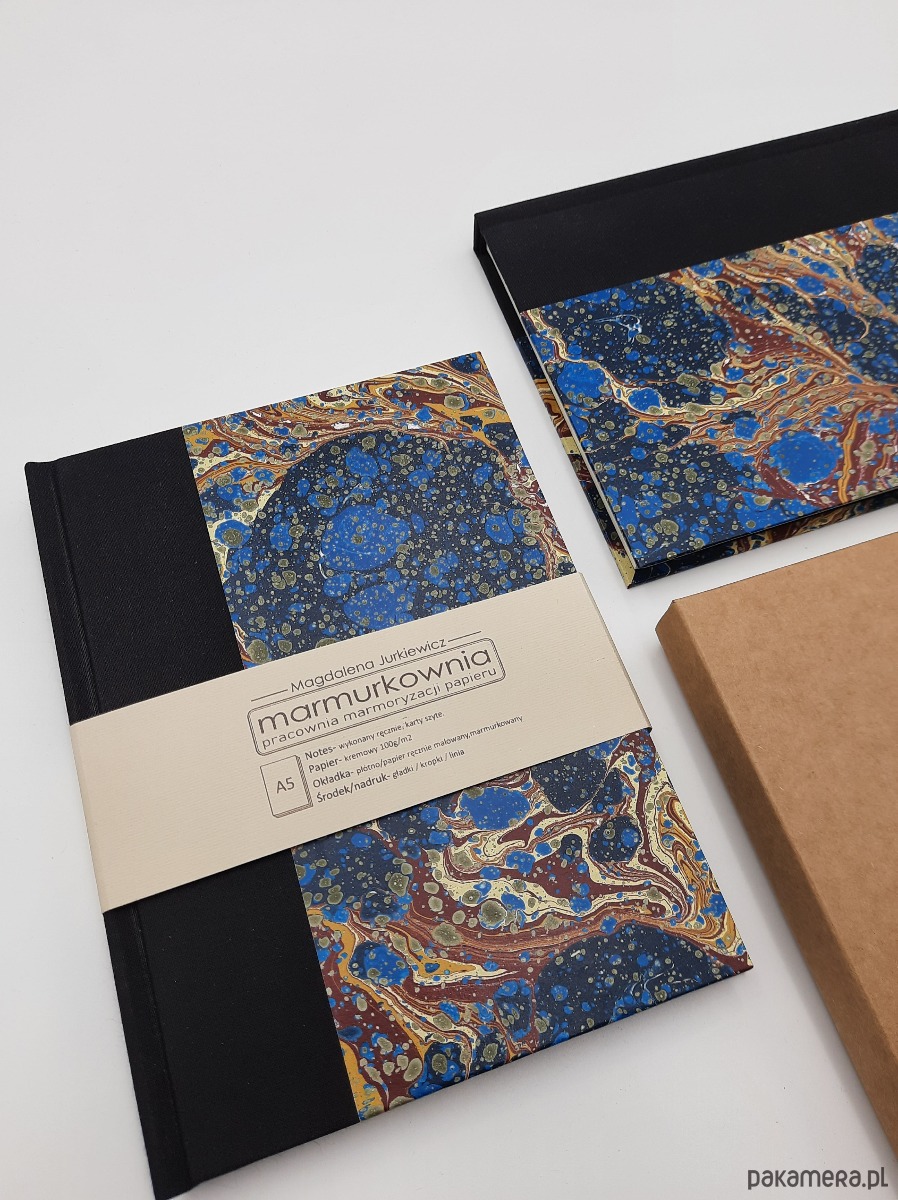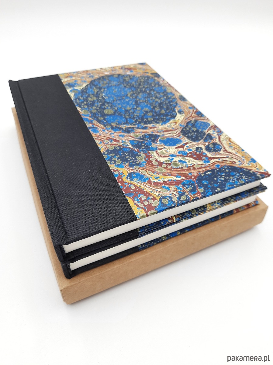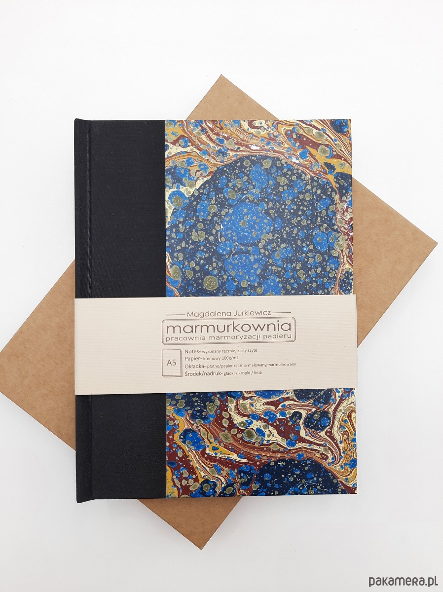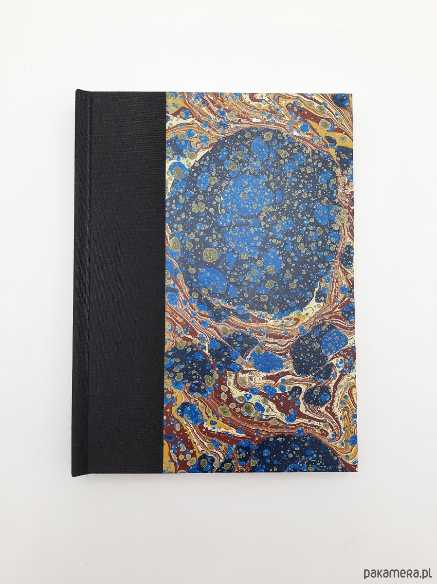 Notes, szkicownik, ręcznie wykonany, w twardej oprawie oklejonej płótnem oraz papierem barwionym w technice marmoryzacji, który maluję w mojej pracowni.