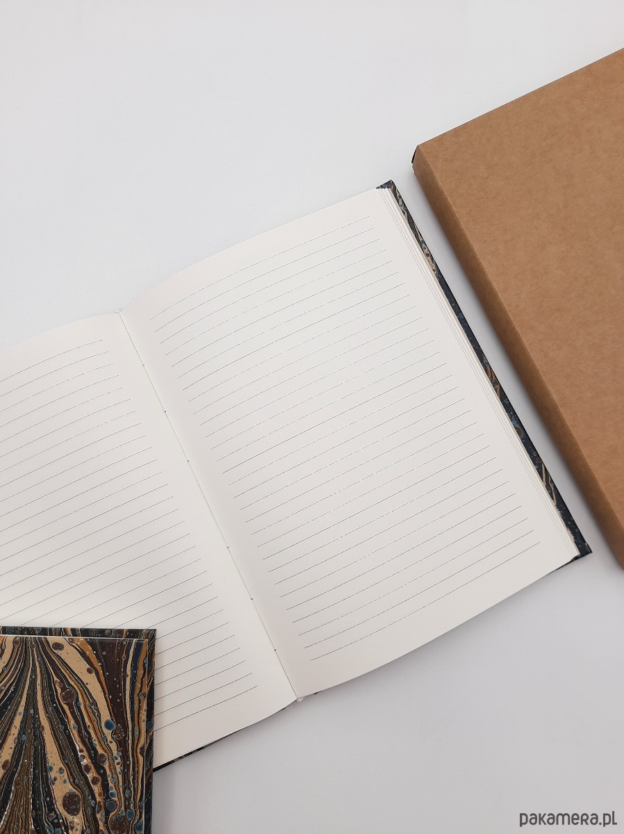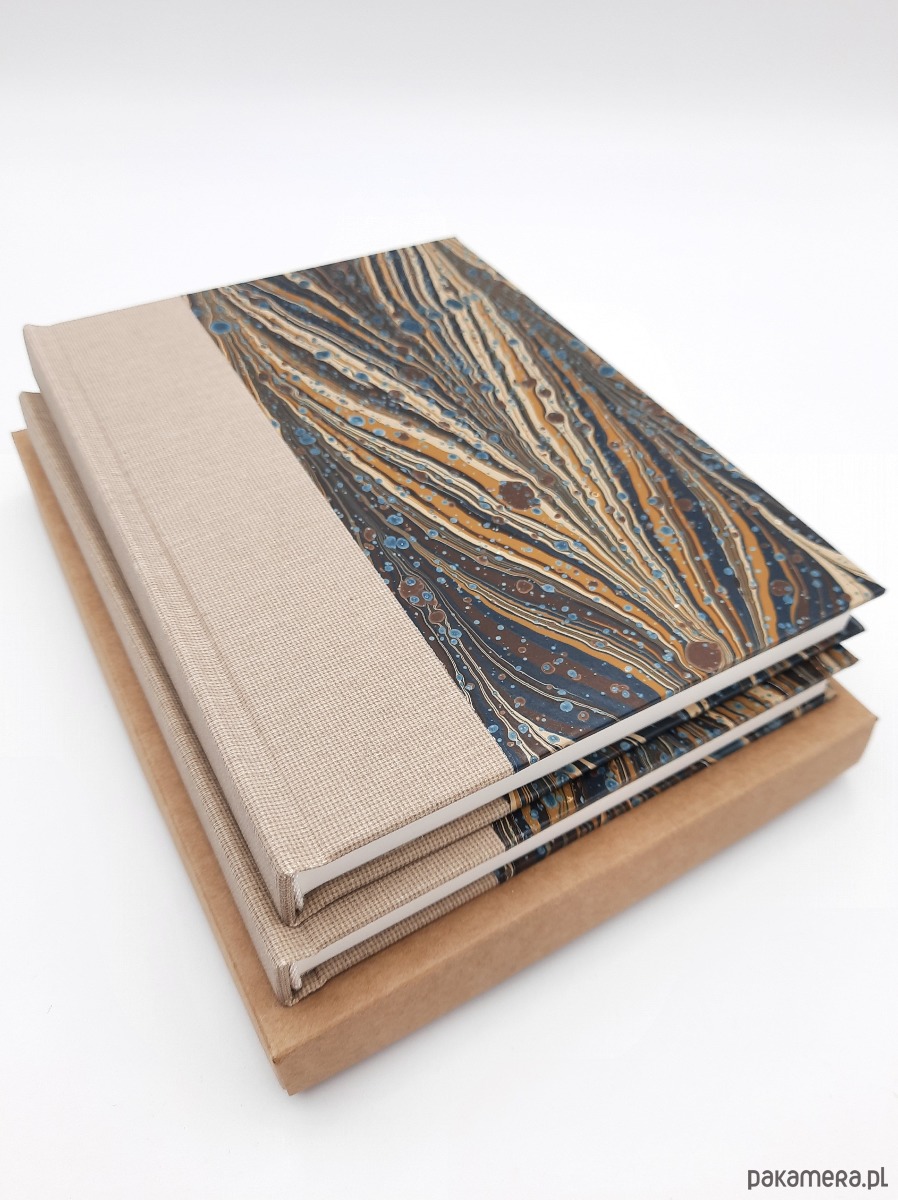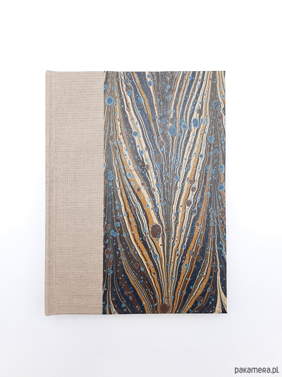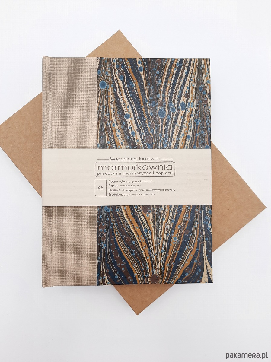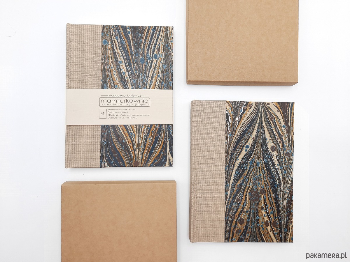Notes, szkicownik, ręcznie wykonany, w twardej oprawie oklejonej płótnem oraz papierem barwionym w technice marmoryzacji, który maluję w mojej pracowni.