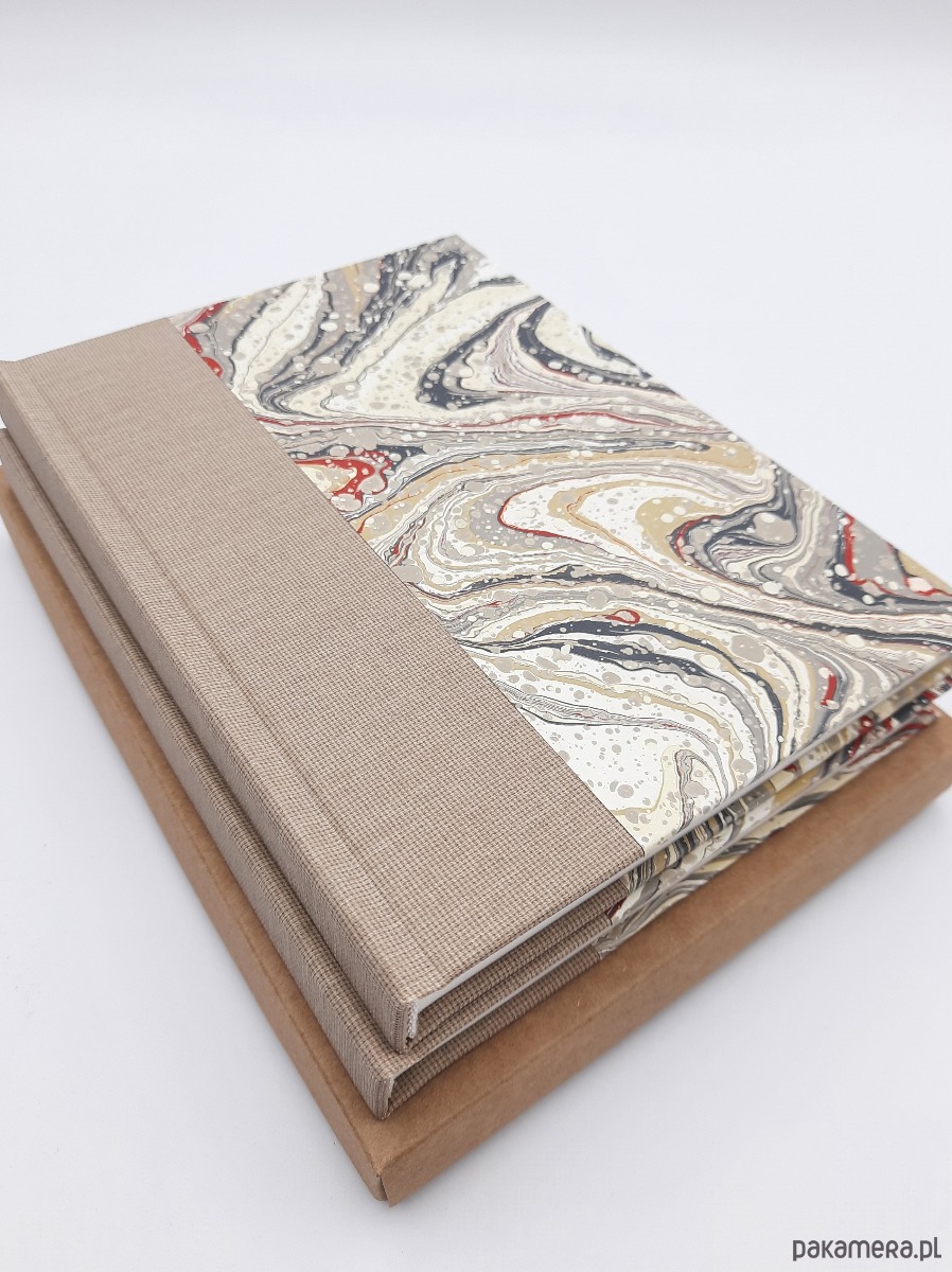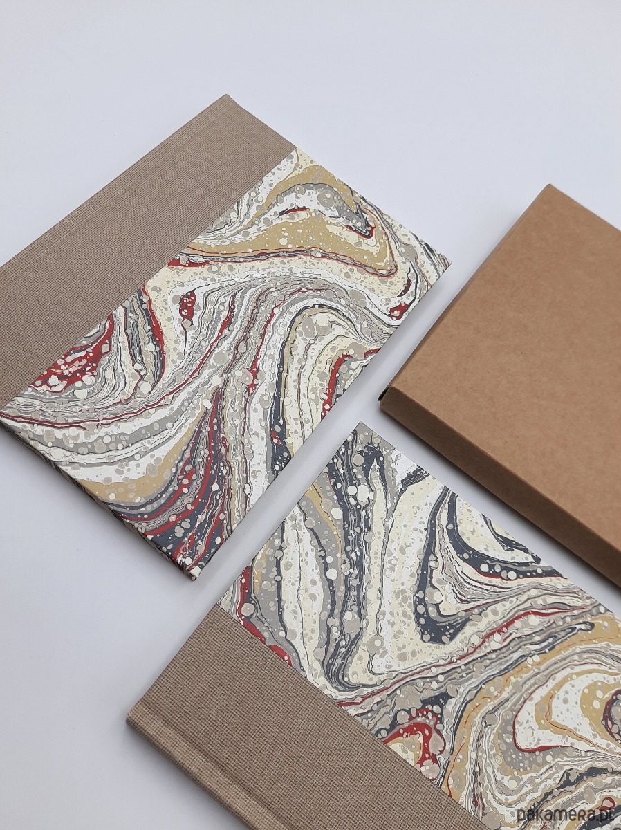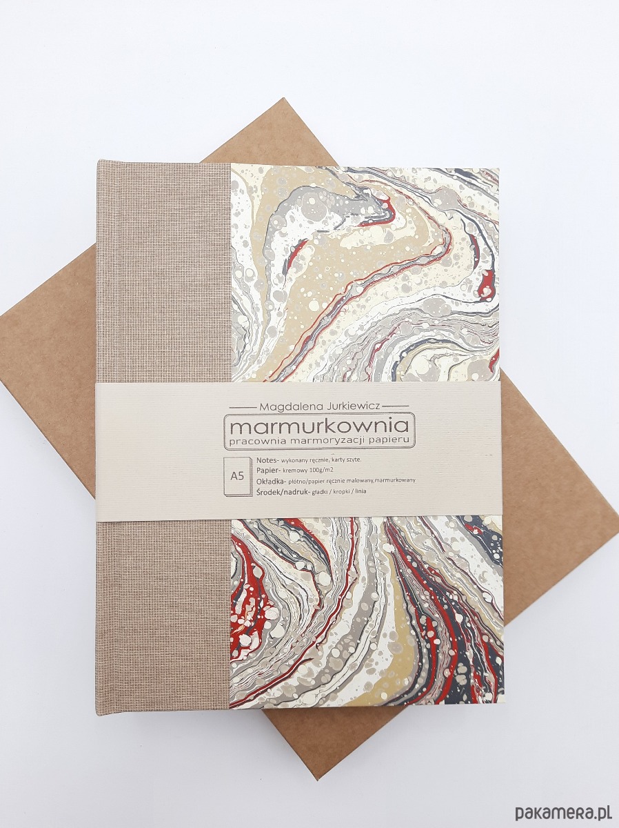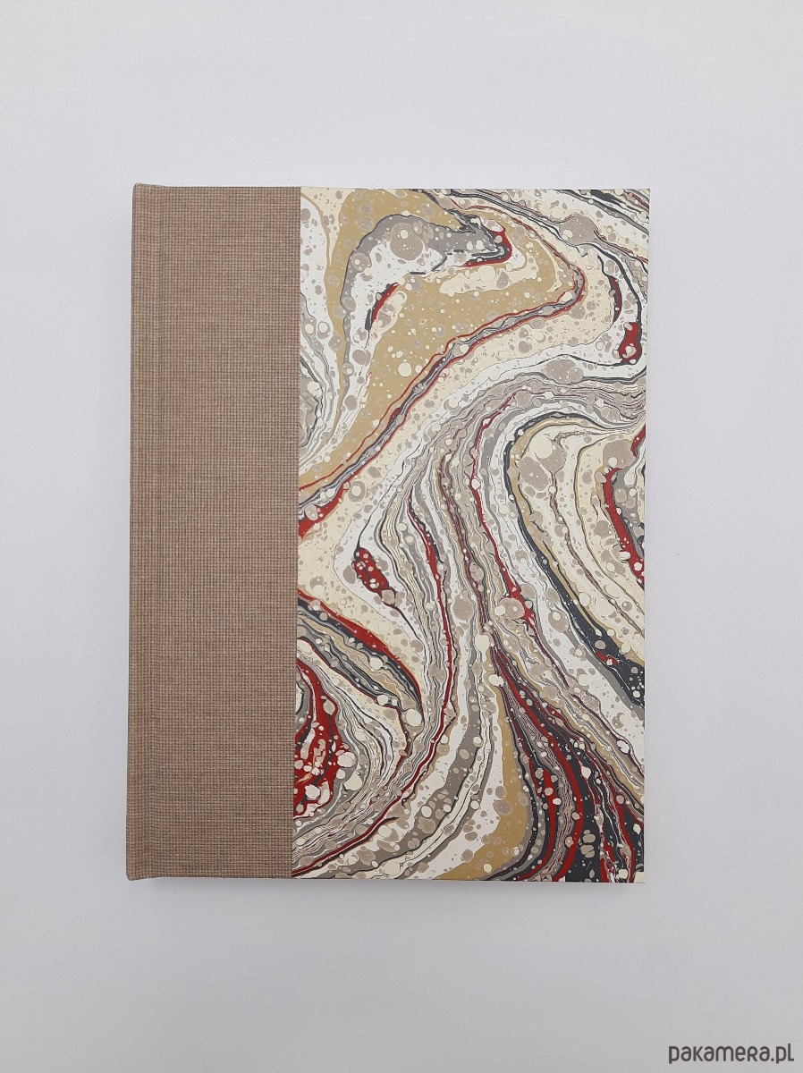 Notes, szkicownik, ręcznie wykonany, w twardej oprawie oklejonej płótnem oraz papierem barwionym w technice marmoryzacji, który maluję w mojej pracowni.