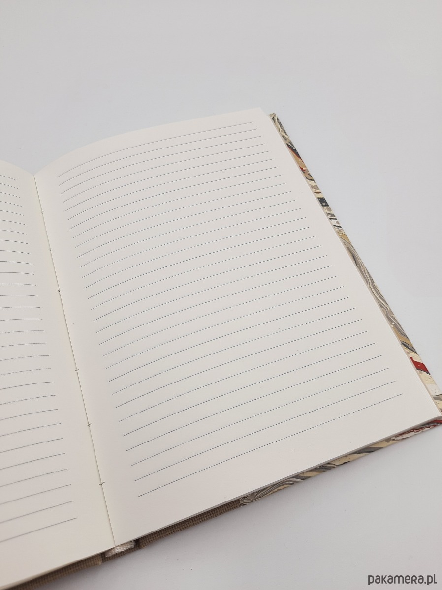 Środek notesu zawiera 160 stron z nadrukiem w linię, w kolorze ecru, wykonany z wysokiej jakości papieru 100g/m2