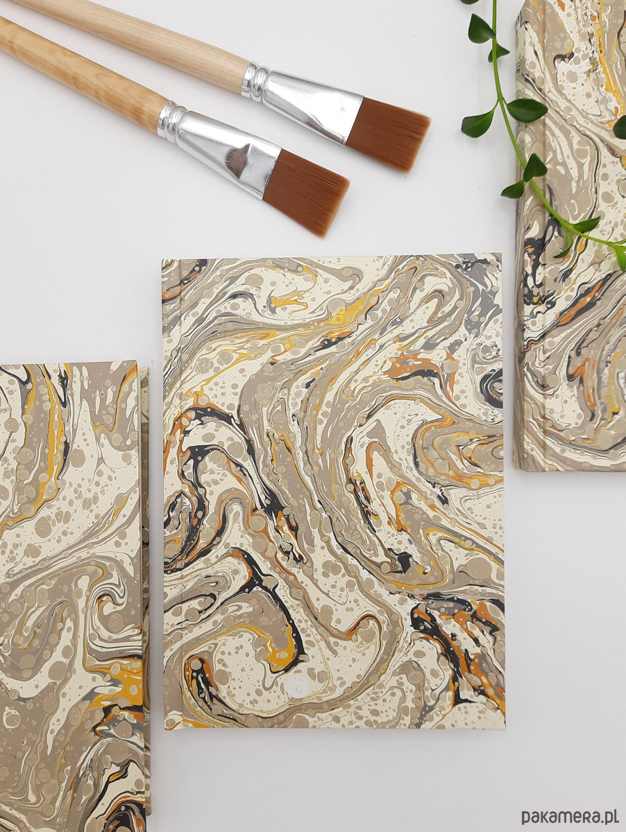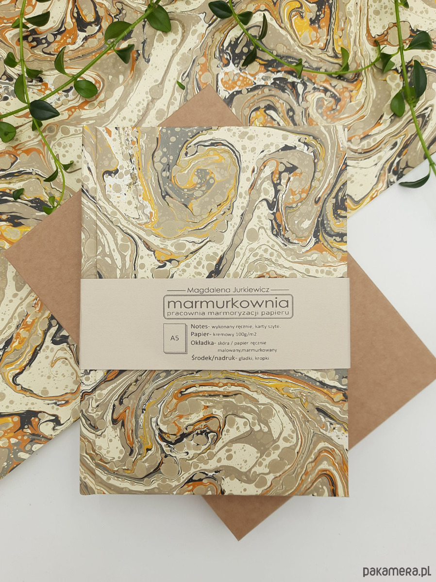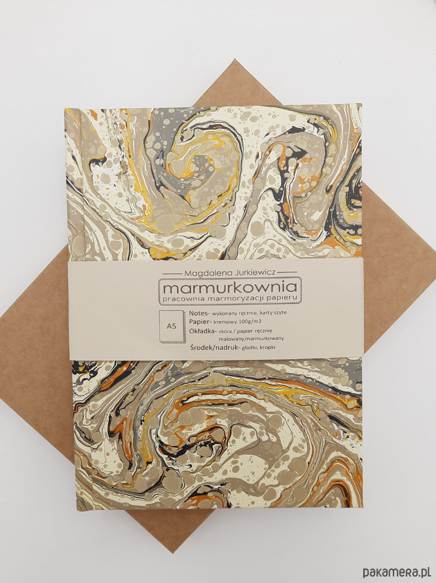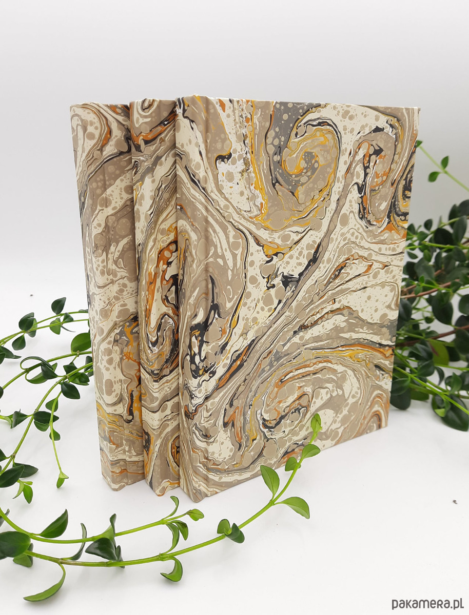Notes, szkicownik, ręcznie wykonany, w twardej oprawie oklejonej płótnem oraz papierem barwionym w technice marmoryzacji, który maluję w mojej pracowni.
