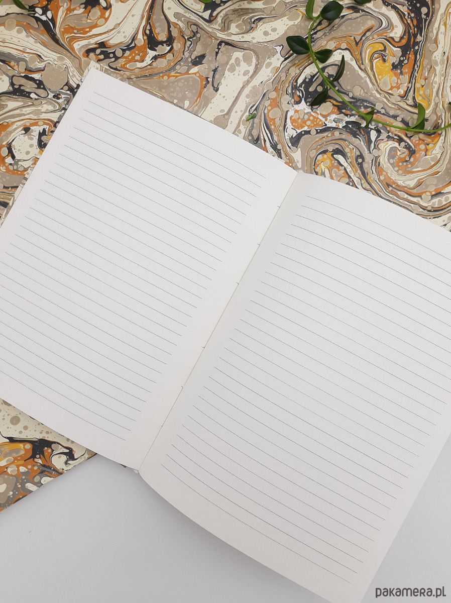 Środek notesu zawiera 160 stron z nadrukiem w linię, w kolorze ecru, wykonany z wysokiej jakości papieru 100g/m2