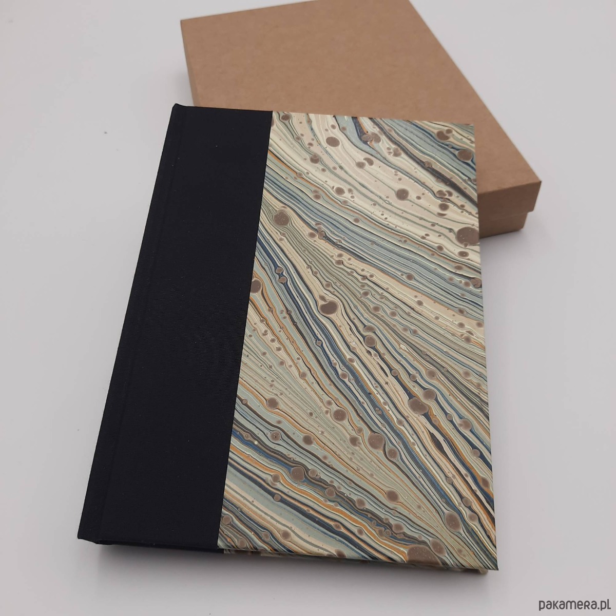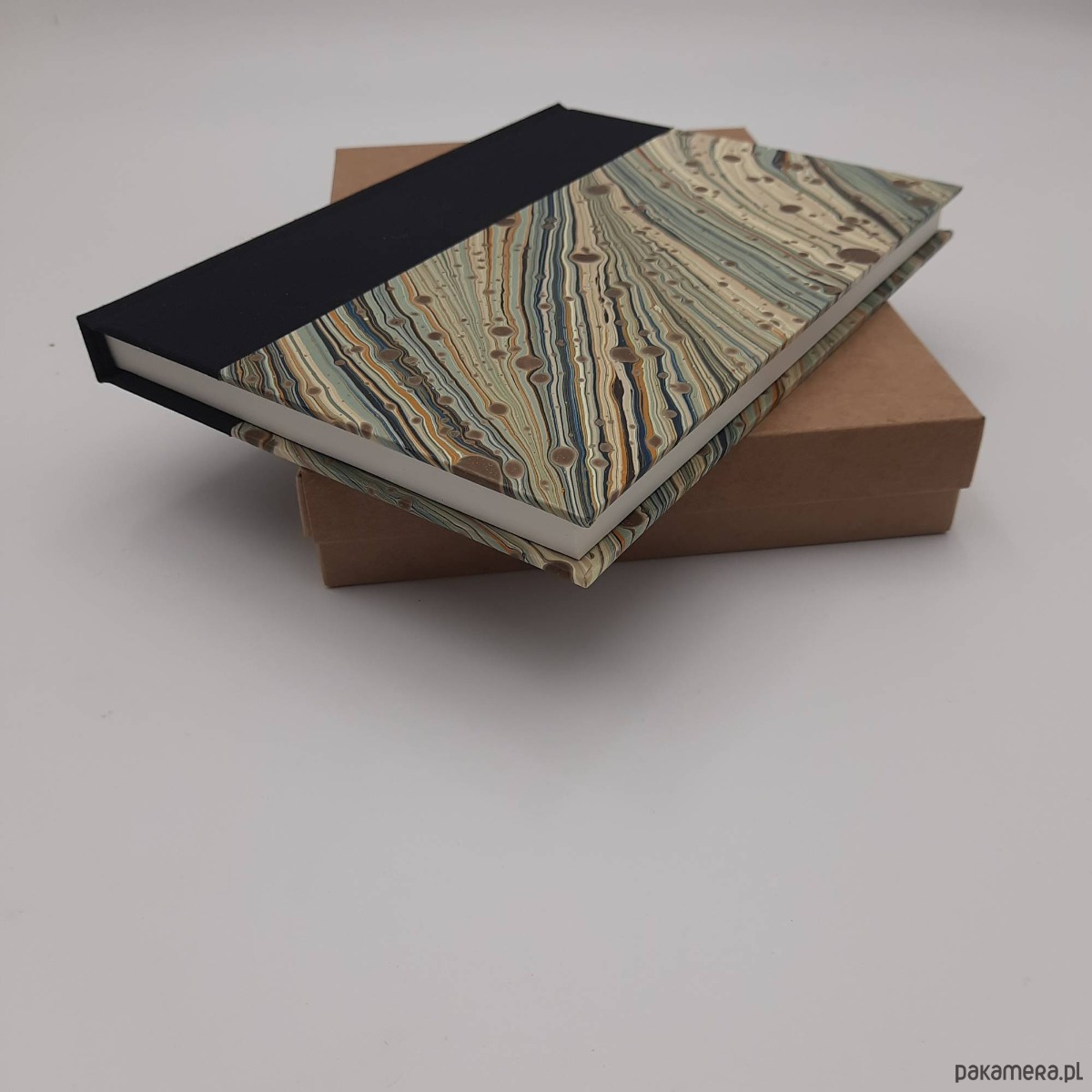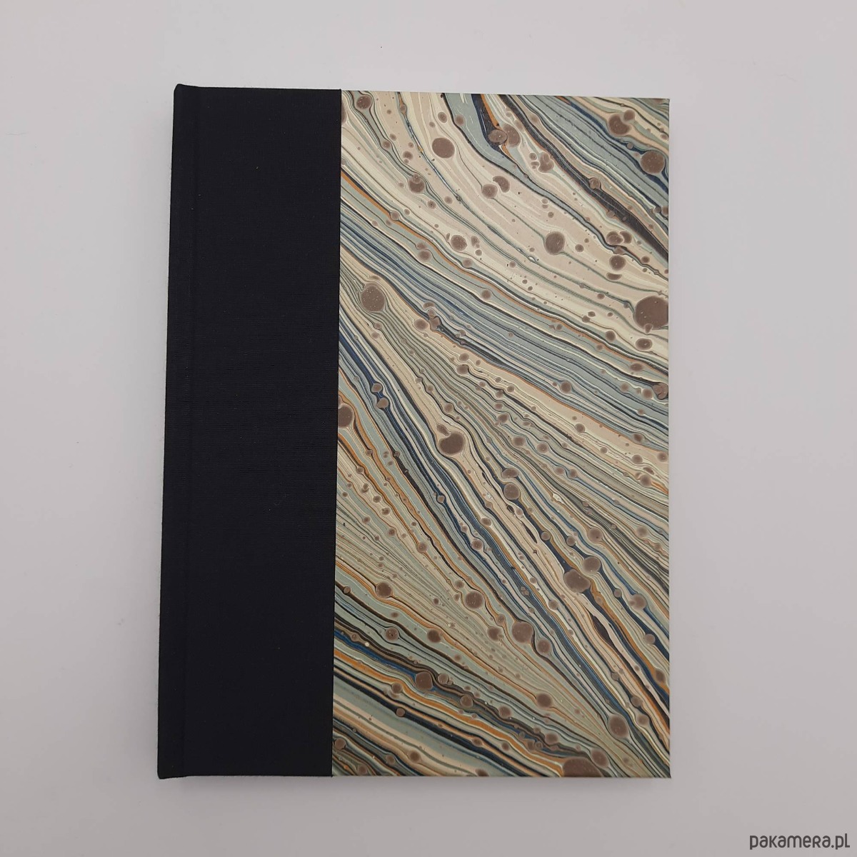 Notes, szkicownik, ręcznie wykonany, w twardej oprawie oklejonej płótnem oraz papierem barwionym w technice marmoryzacji, który maluję w mojej pracowni.