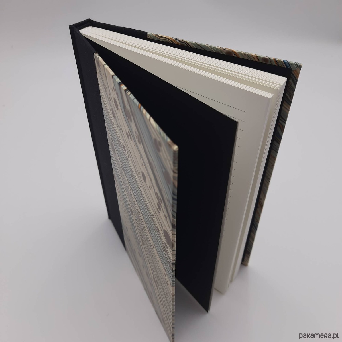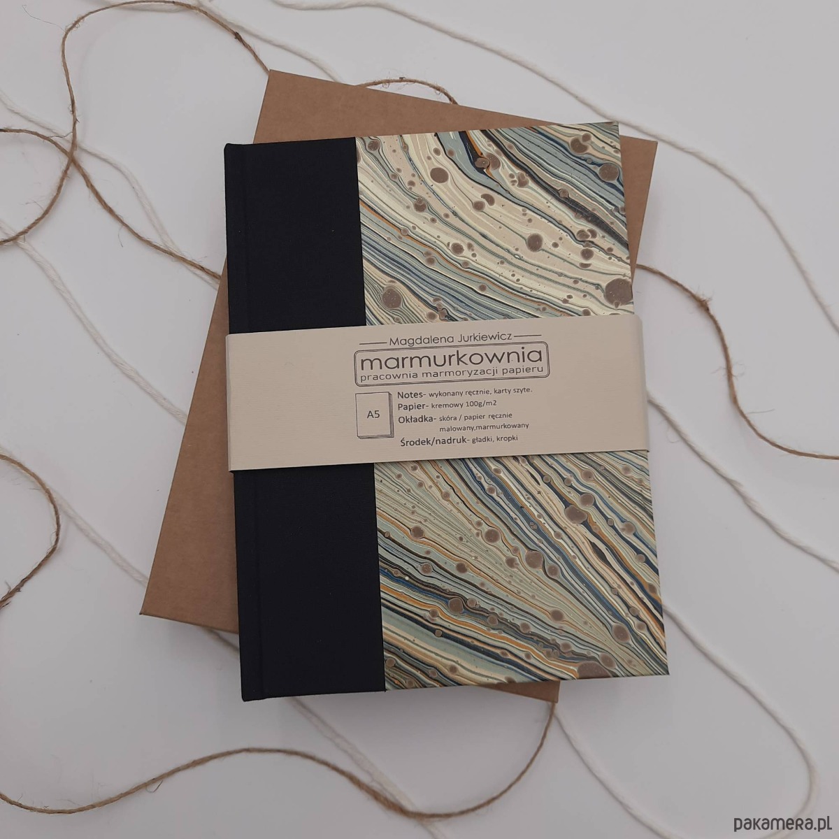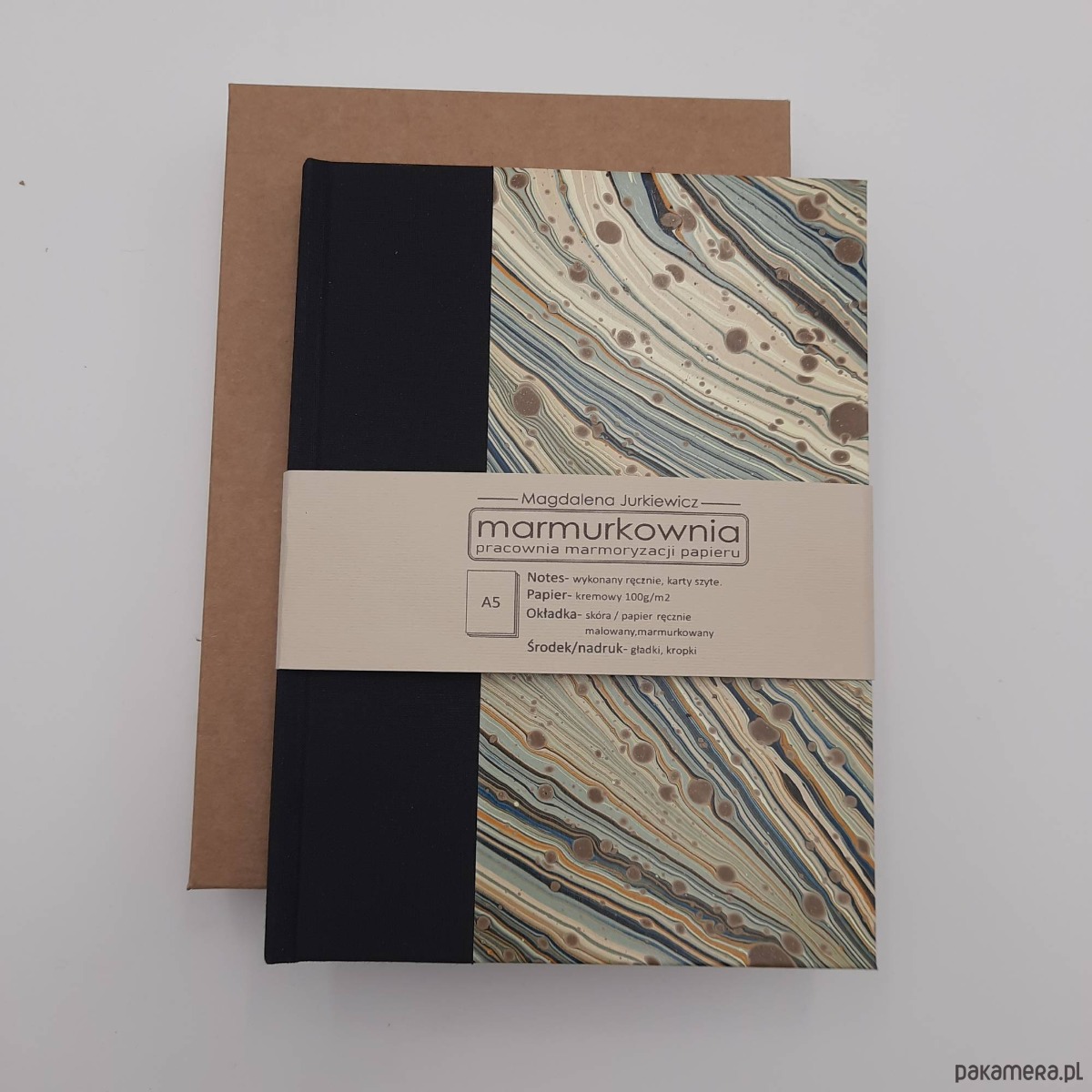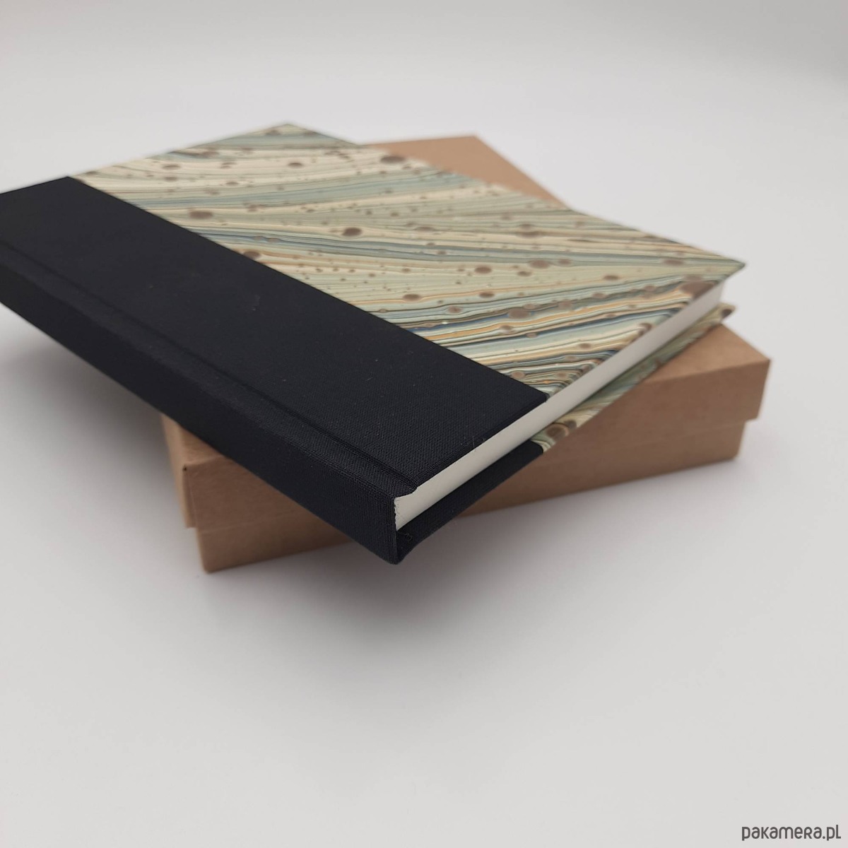 Notes, szkicownik, ręcznie wykonany, w twardej oprawie oklejonej płótnem oraz papierem barwionym w technice marmoryzacji, który maluję w mojej pracowni.