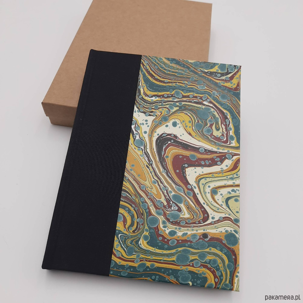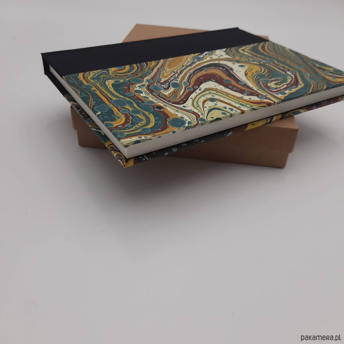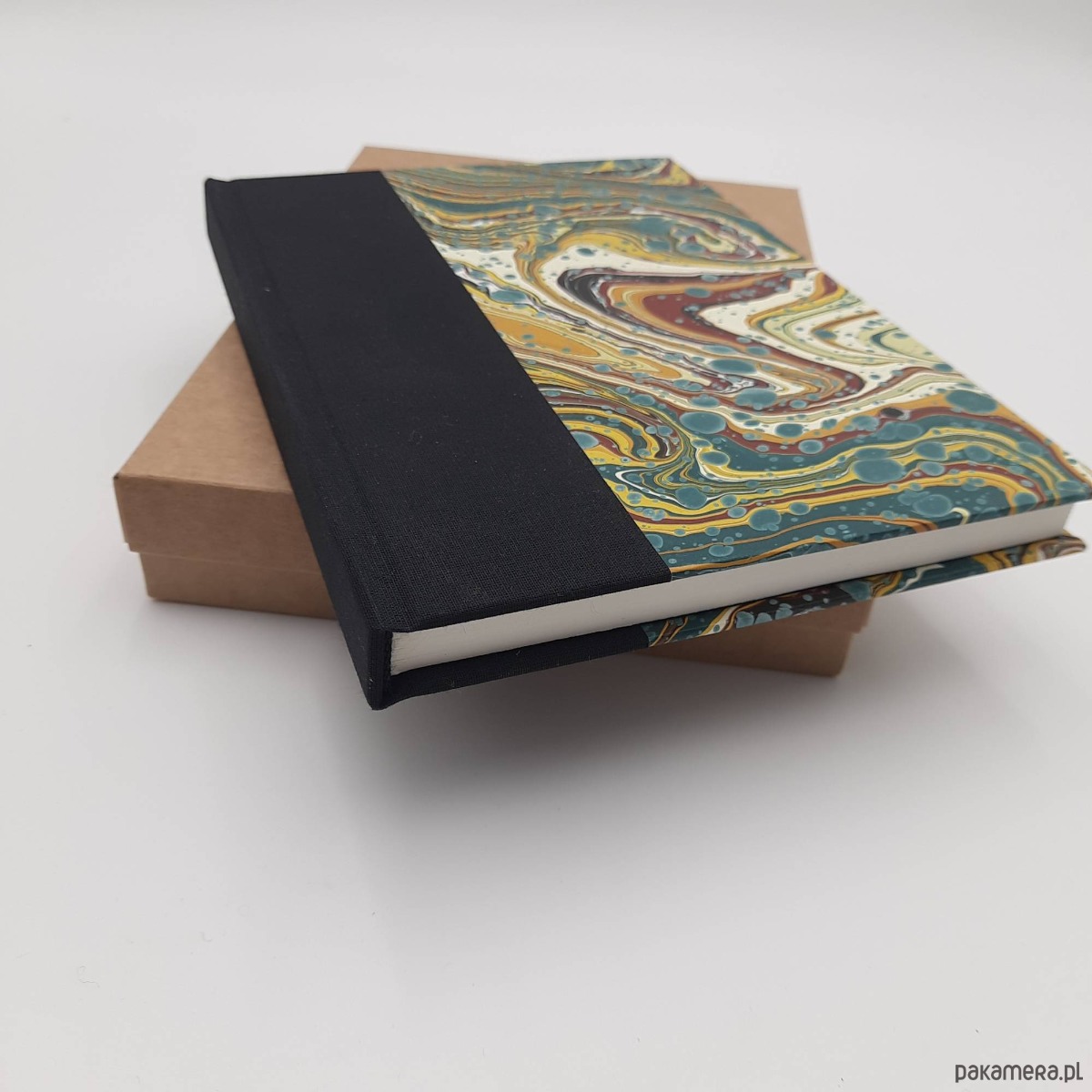 Notes, szkicownik, ręcznie wykonany, w twardej oprawie oklejonej płótnem oraz papierem barwionym w technice marmoryzacji, który maluję w mojej pracowni.