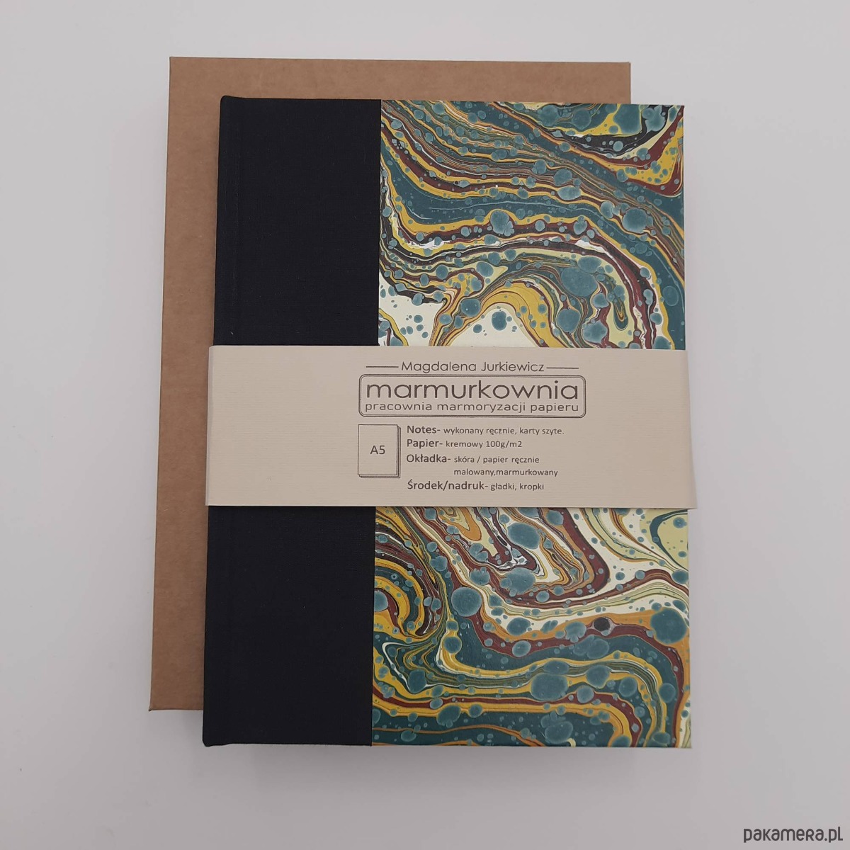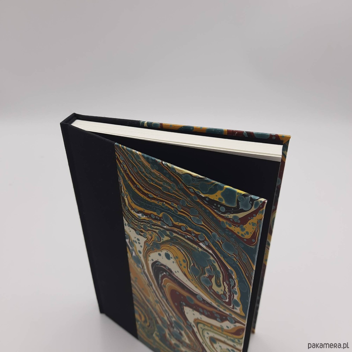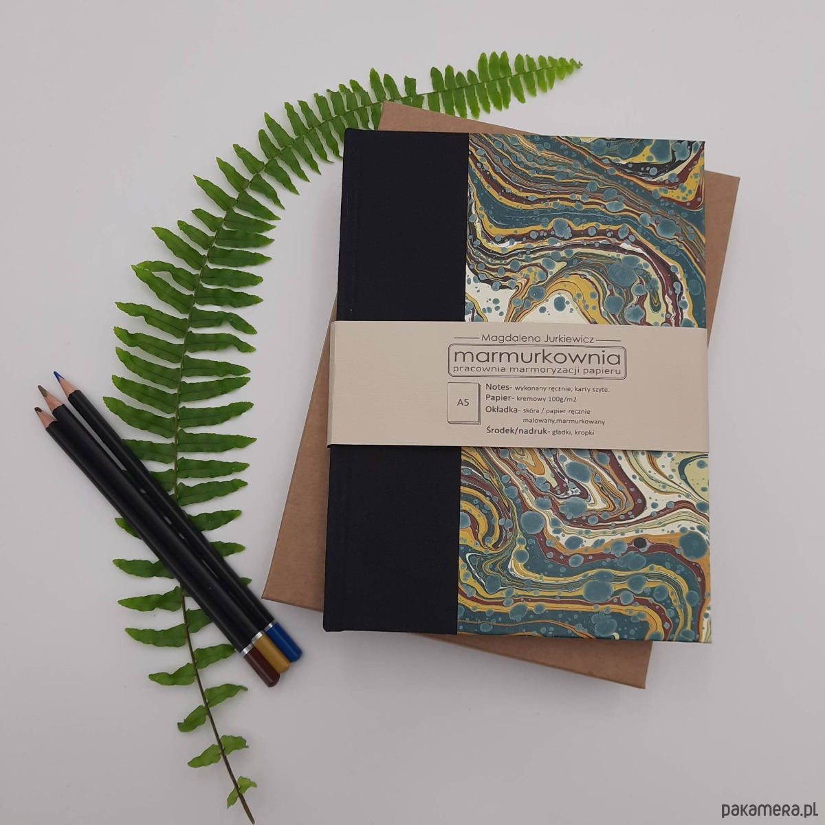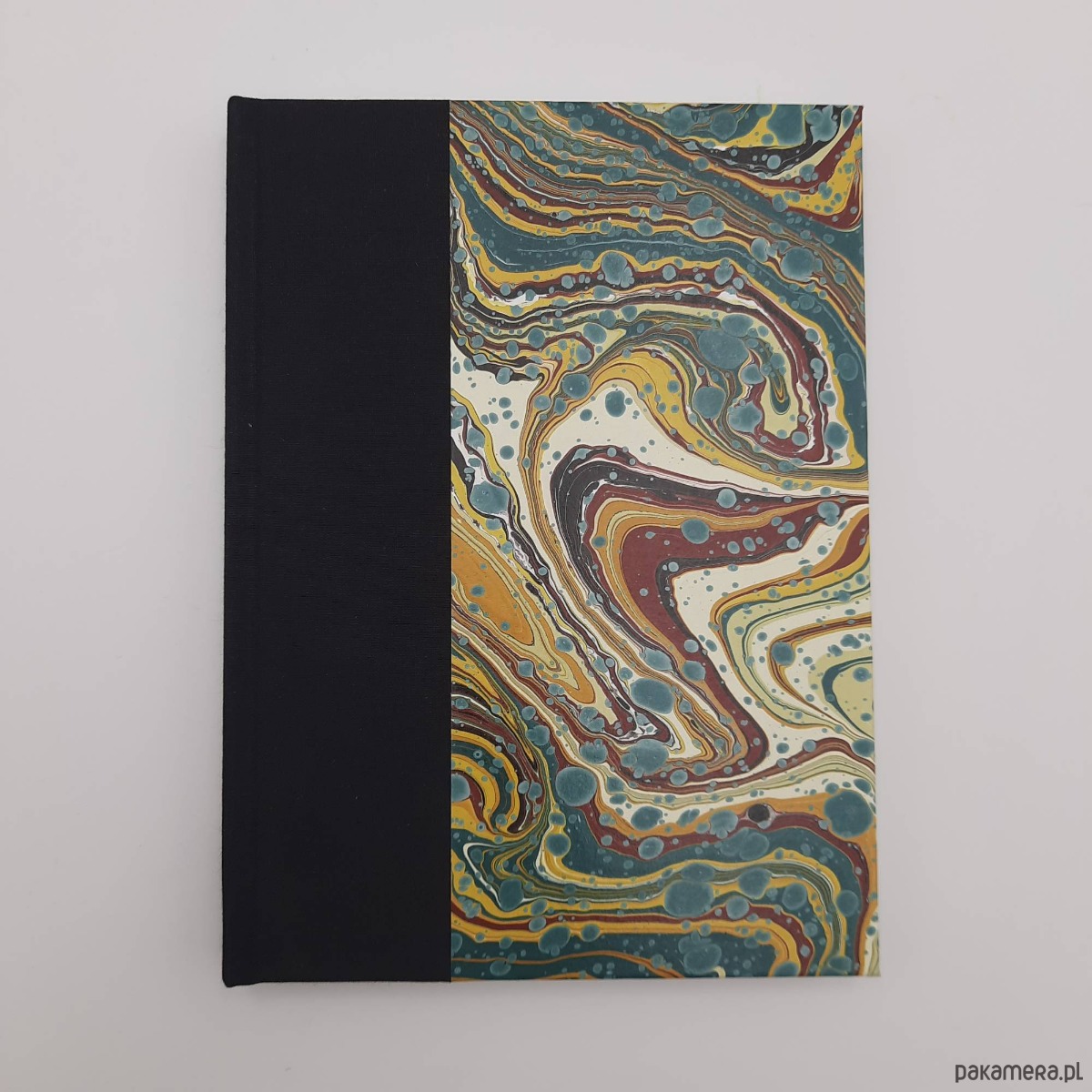 Notes, szkicownik, ręcznie wykonany, w twardej oprawie oklejonej płótnem oraz papierem barwionym w technice marmoryzacji, który maluję w mojej pracowni.