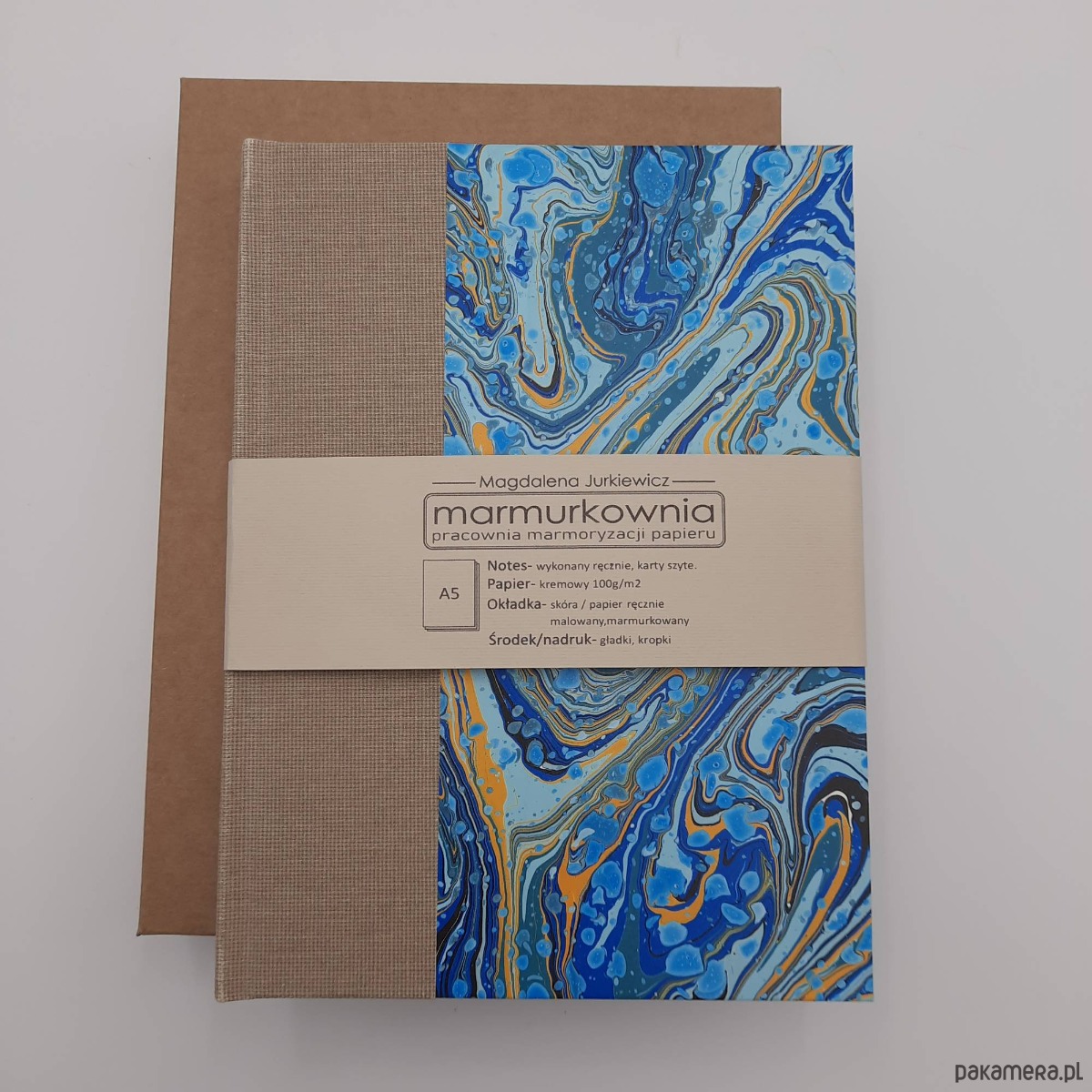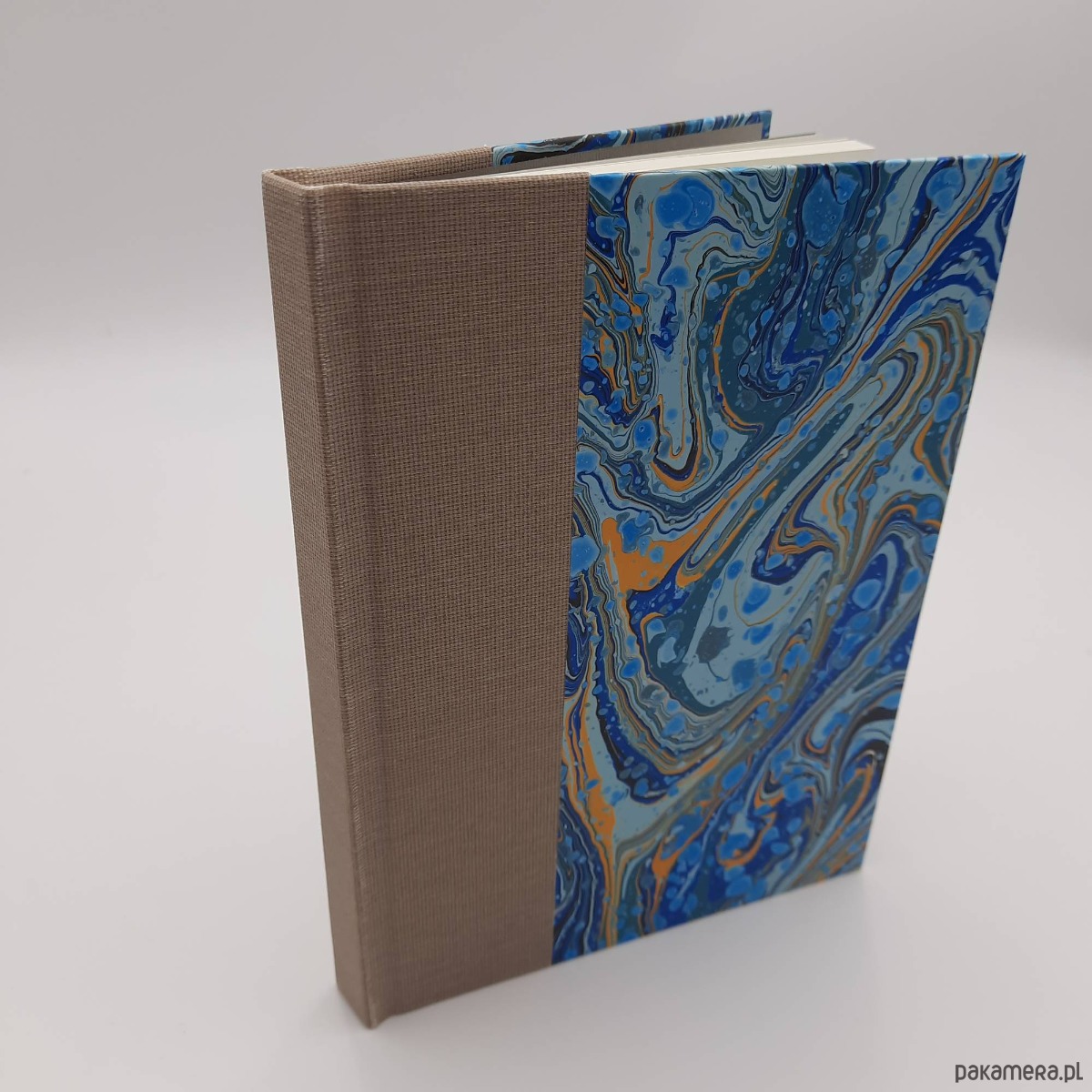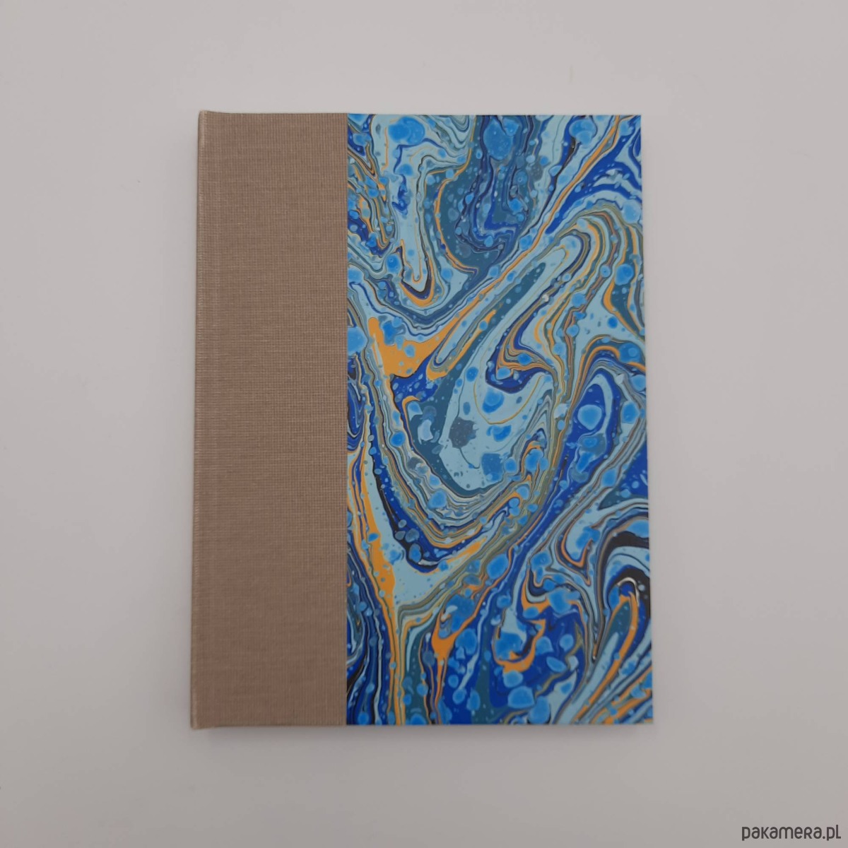 Notes, szkicownik, ręcznie wykonany, w twardej oprawie oklejonej płótnem oraz papierem barwionym w technice marmoryzacji, który maluję w mojej pracowni.